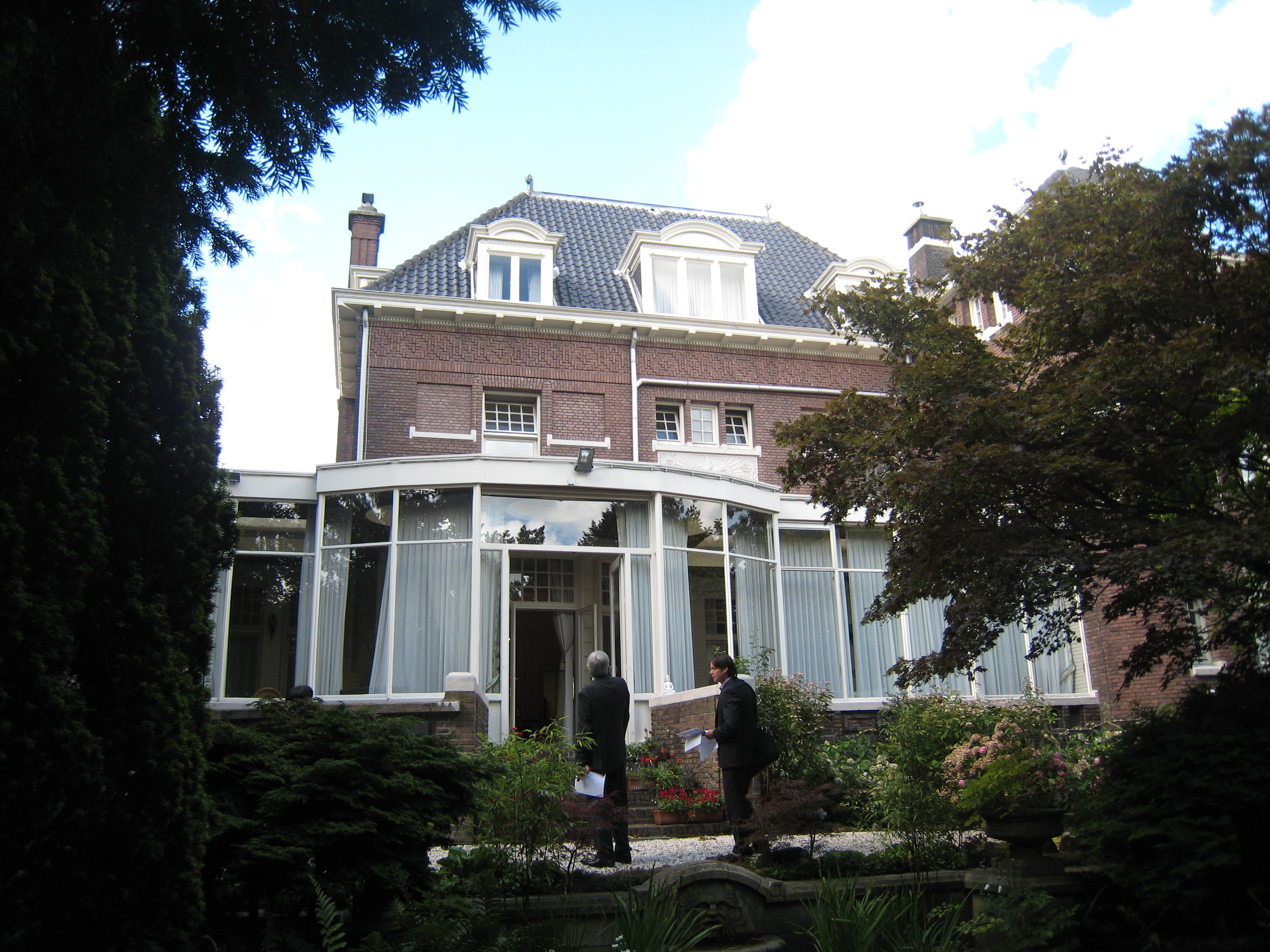 De tuin wordt van de straat gescheiden door een ijzeren hek op een gemetselde voet, voorzien van hekpijlers met een natuurstenen dekplaat, waarop lantaarns.