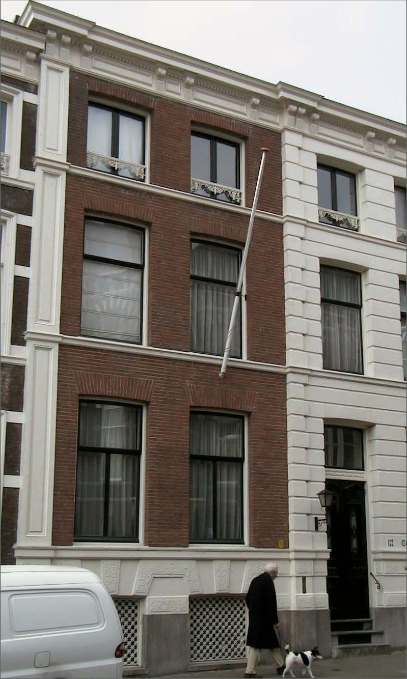 Herenhuis op rechthoekige plattegrond, bestaande uit een souterrain en drie bouwlagen onder een plat dak. De bouwlagen worden van elkaar gescheiden door geprofileerde, gepleisterde cordonlijsten. De bakstenen lijstgevel is drie vensterassen breed, waarvan de rechter als risaliet is behandeld en bezit een hardstenen plint. Het souterrain is voorzien van een geblokte bepleistering met rustica-effect. De hoek van degevel wordt gemarkeerd door een pilaster met verdiepte velden. Het risaliet vormt het twee assen brede middendeel van de beide als eenheid ontworpen huizen en bezit een geblokte bepleistering. De in het risaliet geplaatste ingangspartij heeft een deur met rijk gesneden panelen en siersmeedijzer, een deurkalf met diamantkopjes en een bovenlicht. De deur is bereikbaar via een hardstenen trapje met roosters. Op de eerste en tweede bouwlaag bevinden zich schuifvensters. De souterrainvensters zijn voorzien van gietijzeren roosters. Voor de ramen op de derde bouwlaag zijn gietijzeren raamhekjes geplaatst. Het gekorniste hoofdgestel heeft een gepleisterd fries met rechthoekige panelen en een tandlijstje. De kroonlijst wordt gedragen door paarsgewijs geplaatste triglyfconsoles.