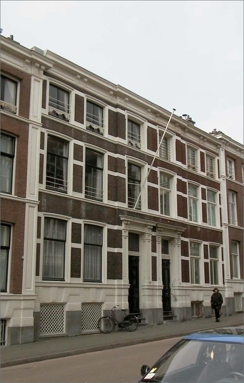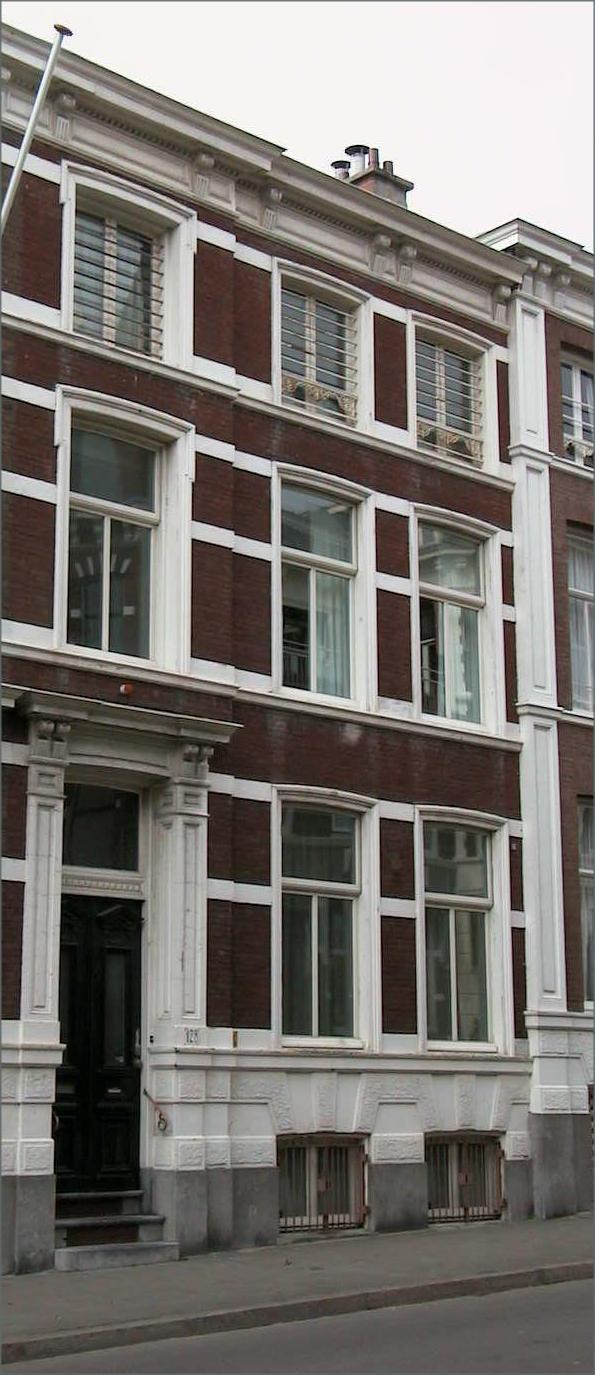 Herenhuis op rechthoekige plattegrond, bestaande uit een souterrain en drie bouwlagen onder een plat dak. De bouwlagen worden van elkaar gescheiden door geprofileerde, gepleisterde cordonlijsten. De bakstenen lijstgevel bezit een hardstenen plint en gepleisterde banden. Het souterrain is voorzien van een geblokte bepleistering met rustica-effect. De gevel is drie vensterassen breed, waarvan de linker als risaliet is behandeld.