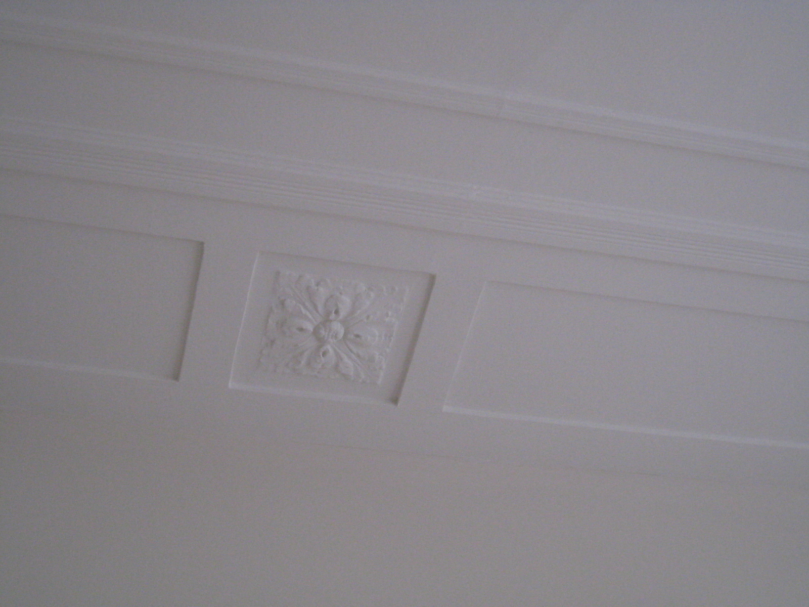 Het gekorniste hoofdgestel heeft een gepleisterd fries met rechthoekige panelen en een tandlijstje. De kroonlijst wordt gedragen door paarsgewijs geplaatste triglyfconsoles.