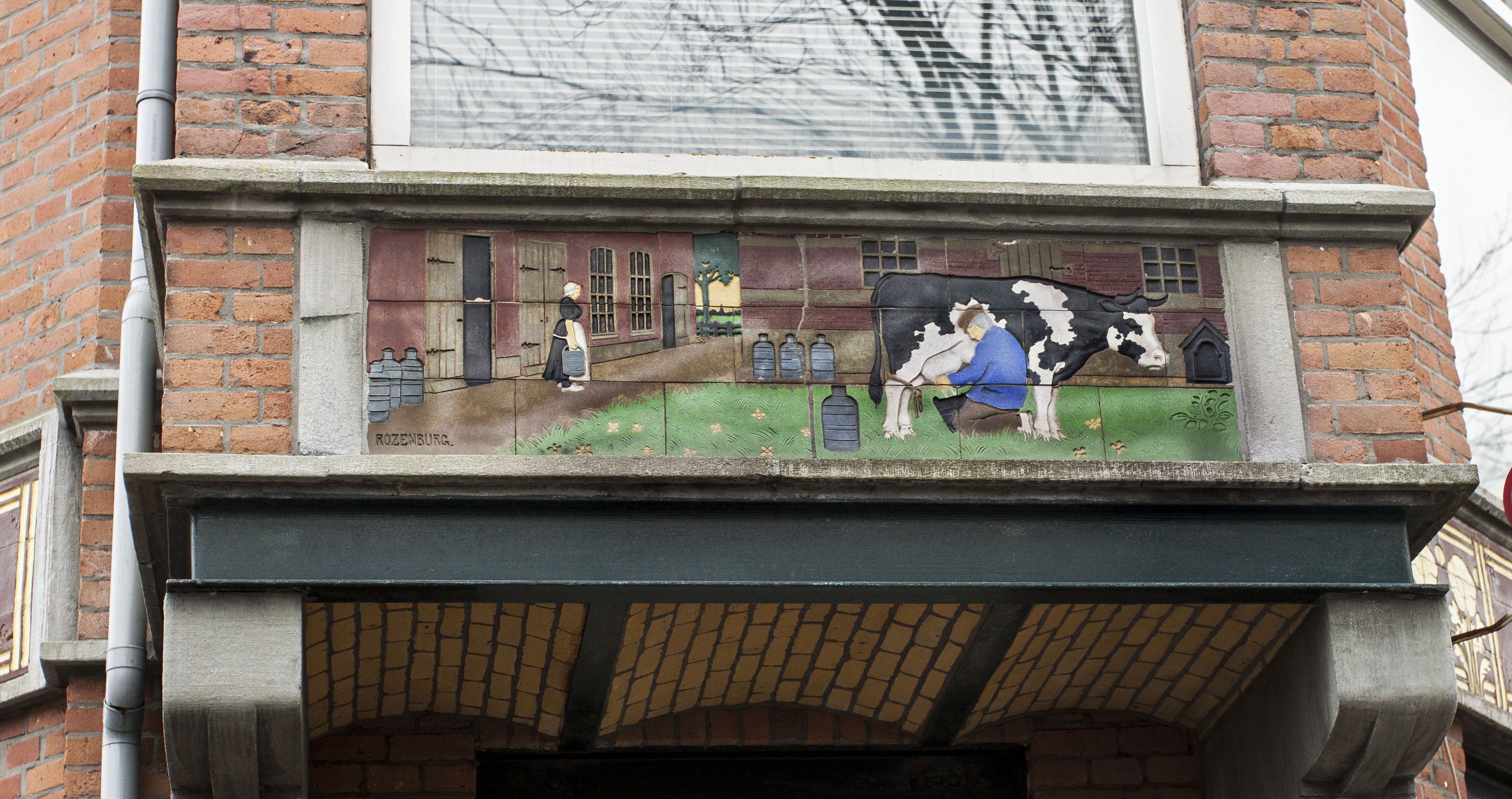 De gevels worden opgeluisterd door tegeltableaux afkomstig van de Haagse aardewerk- en porseleinfabriek Rozenburg met de opschriften “De Landbouw” en “Naamloze Vennootschap Melkinrichting De Landbouw” en een figuratief tableau in de erker boven de ingang naar de voormalige melksalon. Dit tegentableau toont in een landelijk tafereeltje waar de melk vandaan komt. Melkinrichting.