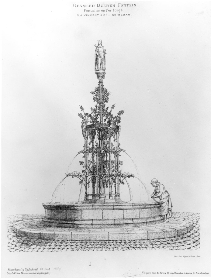 Naar ontwerp van P.J.H. Cuypers in 1885 door C.J. Vincent & Co in neo-gotische trant uitgevoerde smeedijzeren FONTEIN met cirkelvormig hardstenen bassin, gesitueerd op het Binnenhof en aangeboden door Victor de Stuers namens 86 ingezetenen aan de leden van de Staten-Generaal, ter nagedachtenis van graaf Willem II - de Roomse-Koning - en naar aanleiding van de in 1876 begonnen restauratie van het Binnenhof (gerestaureerd ter gelegenheid van het Monumentenjaar M'75 en bij die gelegenheid op een andere plaats herplaatst).