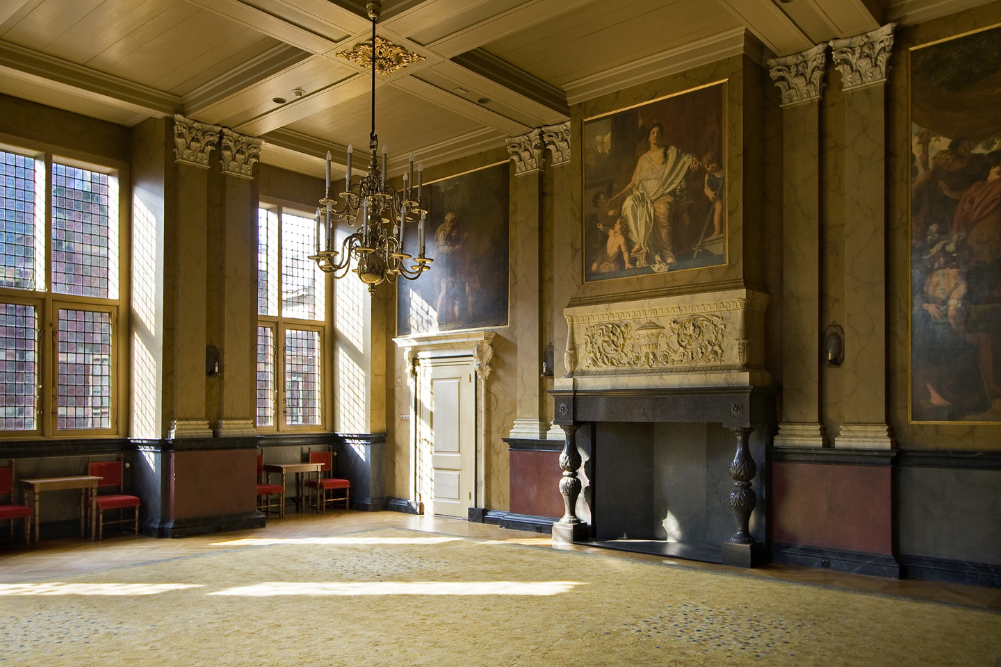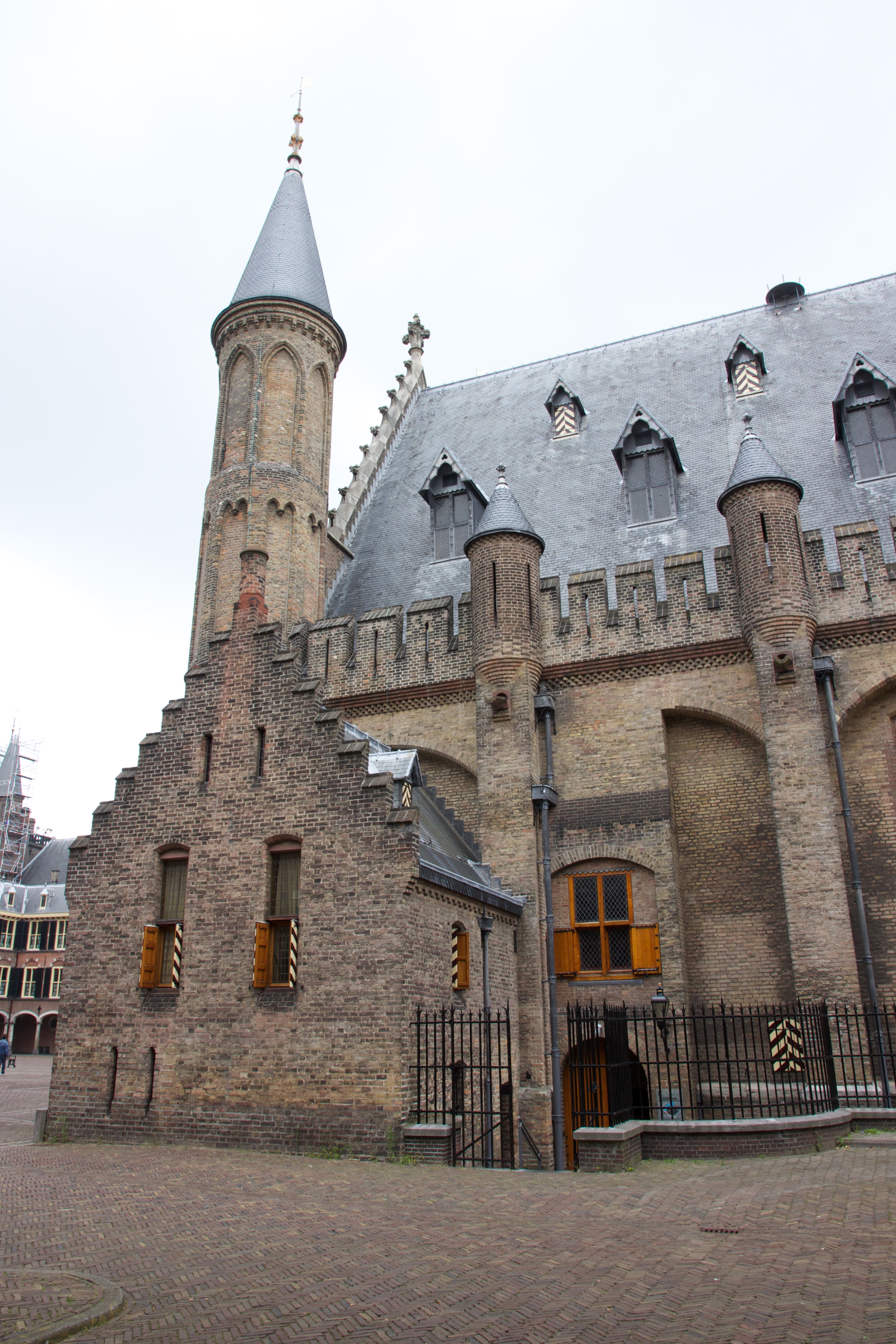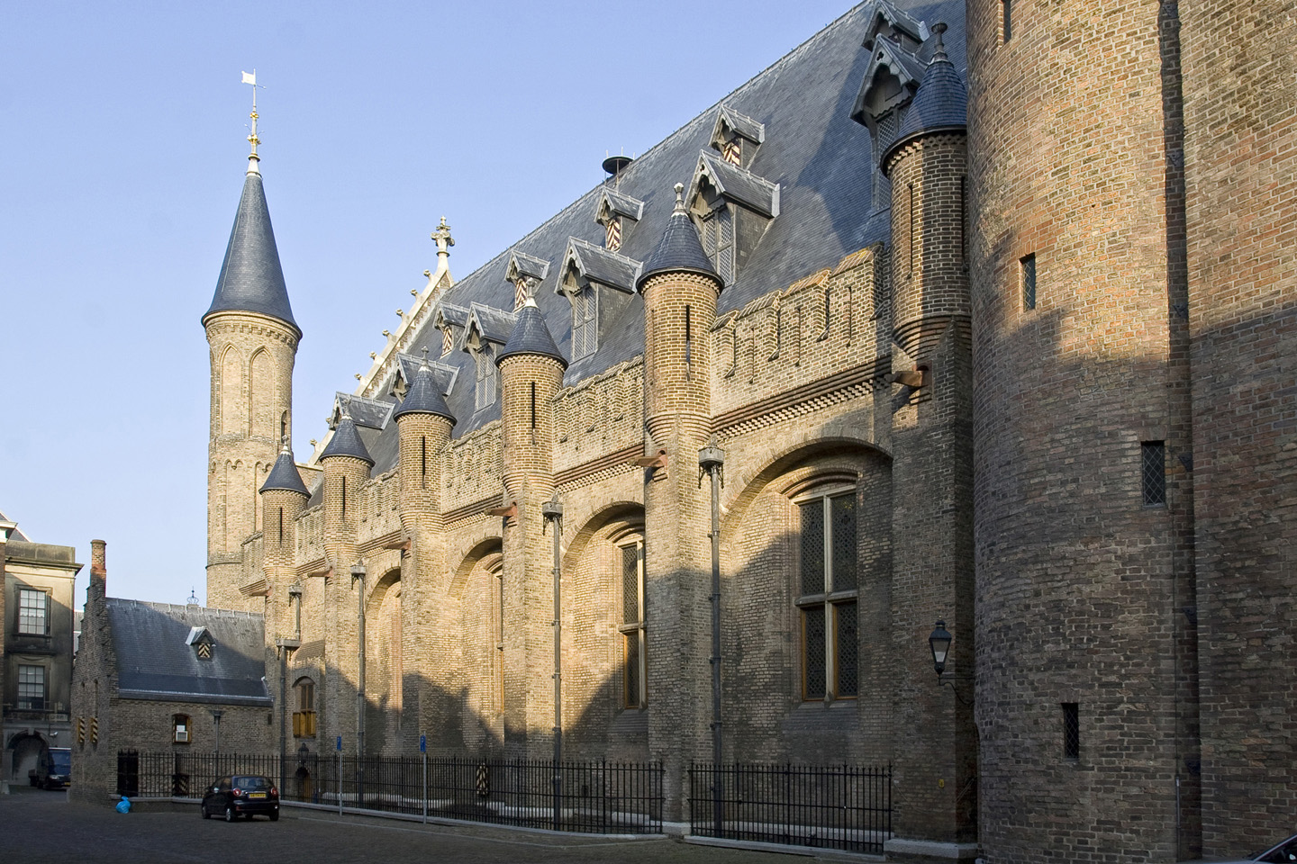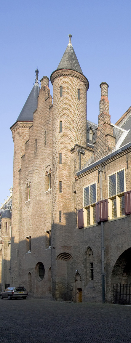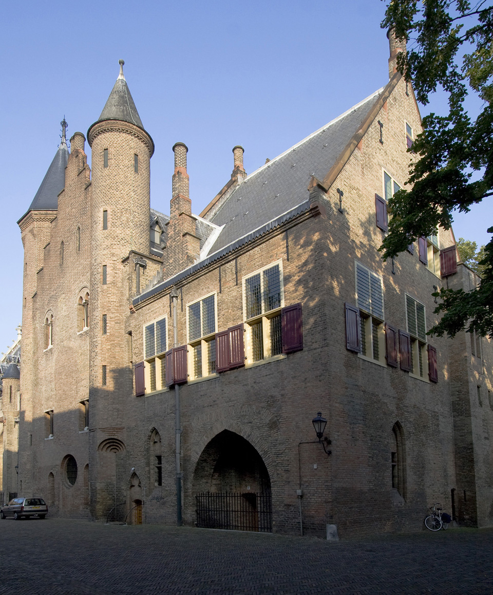 VOORMALIG PALEIS DER GRAVEN VAN HOLLAND MET RIDDERZAAL; het oudste deel van omstreeks 1250 bevat nog een kelder uit de bouwtijd en daarboven de Rolzaal; de oostelijke aanbouw, eertijds de Civiele kamer van het Hof van Holland, dateert in zijn huidige toestand uit 1668, toen ook de zeven wandschilderingen op doek door Gerard de Lairesse werden aangebracht; de Ridderzaal uit de tweede helft van de 13e eeuw bevat in de kelder nog resten van een ouder gebouw.