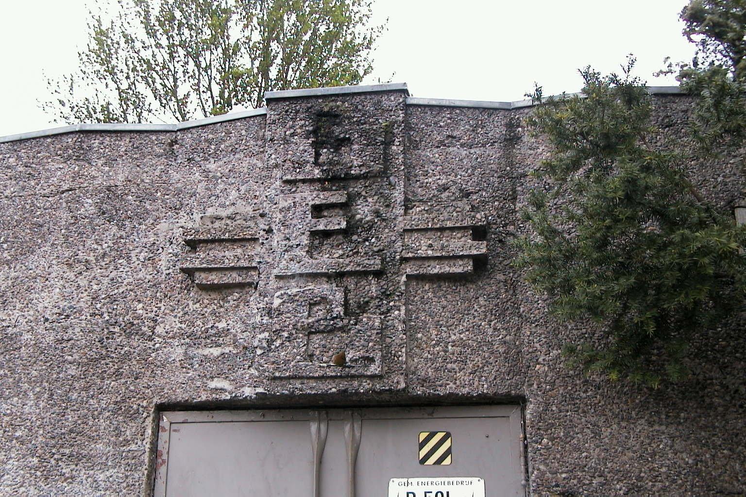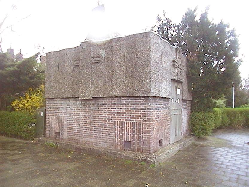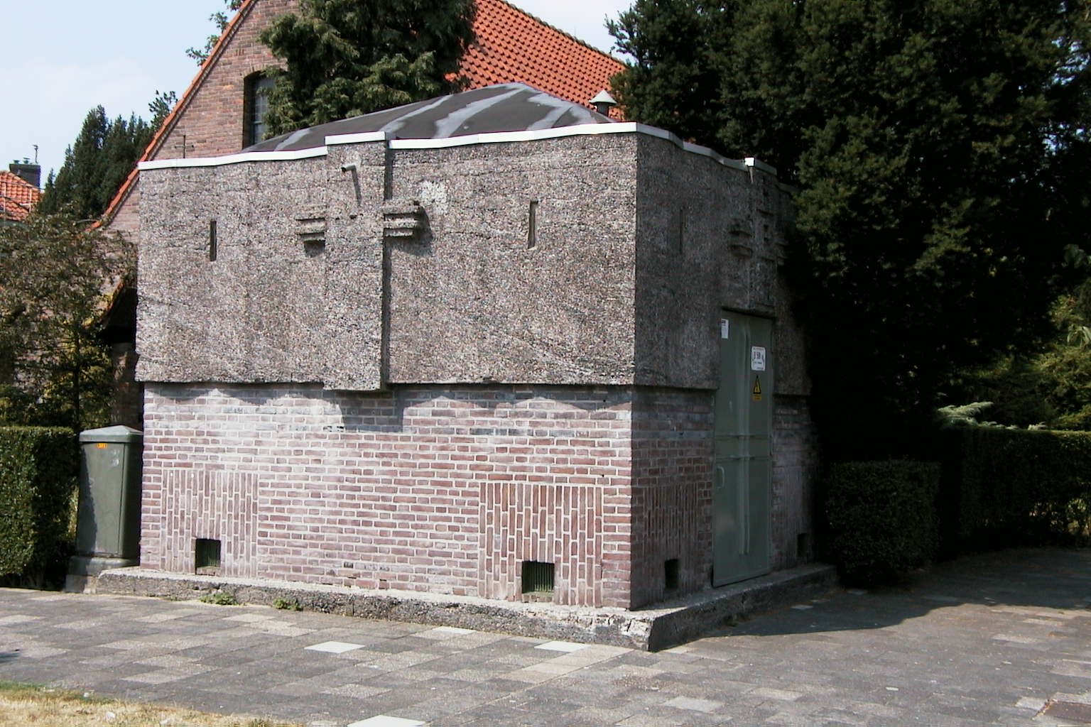 In baksteen en grintbeton opgetrokken transformatorhuis op vierkante plattegrond uit 1924 naar ontwerp van architect J.J. Hellendoorn.