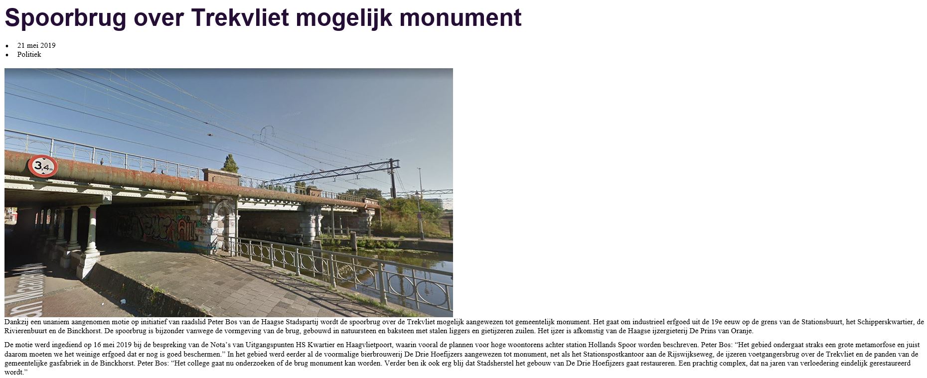 Het spoortracé (Amsterdam-Rotterdam) van de toenmalige Hollandsche IJzeren Spoorweg Maatschappij dat over de Trekvliet en Rijswijkseweg loopt richting Hollands Spoor is één van de oudste spoorlijnen in Nederland en dateert van 1842. Aanvankelijk was het spoor op maaiveld aangelegd en was er een draaibrug over de Trekvliet. In de loop van de negentiende eeuw nam het verkeer als maar toe, zowel over land, per schip als per spoor. Daardoor werd de gelijkvloerse spoorlijn een steeds lastiger te nemen verkeersbarrière. In 1880 werd besloten tot de aanleg van een verhoogd spoortracé waaronder het weg- en scheepvaarverkeer ongehinderd kon passeren. Enige jaren later werd ook het uit 1842 daterende stationsgebouw vervangen door het huidige station Hollands Spoor. Het nieuwe spoorviaduct over de Trekvliet was aanvankelijk minder breed dan nu. Er was een onderdoorgang voor de Bontekoekade en de Trekvliet. Voor het nieuwe spoorwegviaduct werd gebruik gemaakt van de fundering van de oude draaibrug uit 1842. De ijzeren brug op gemetselde pijlers kreeg een monumentaal uiterlijk waarbij rijkelijk gebruik is gemaakt van de klassieke vormentaal. De bruggenhoofden werden aan voor- en achterkant voorzien van in neo-renaissance uitgevoerd bogen. De detaillering van de brug vertoont stilistisch sterke overeenkomsten met het huidige Hollands Spoor (1891-1893). Ter hoogte van de rijweg werd de brug ondersteund door gietijzeren zuilen met Dorische kapitelen. Bijzondere aandacht werd ook besteed aan de afwerking van de ijzeren hekwerken op de brug die steunen op klassiek vormgegeven consoles. In 1906 werd de brug ingrijpend aangepast. Enerzijds had dit te maken met de aanleg van de gasfabriek en het Trekvlietplein waardoor ook aan de oostzijde er een verbindingsweg moest komen vanuit de stad naar het nieuwe industrieterrein. Anderzijds was het spoor inmiddels ook te smal geworden voor het toenmalige treinverkeer. De brug werd verbreed (van twee naar vier sporen) en verlengd. De verbreding had tot gevolg dat aan de zijde van de Binckhorst de oude bruggenhoofden werden verwijderd. Het is aannemelijk dat al het natuursteen werd afgenomen en opnieuw gebruikt. Het bestaande talud aan de oostzijde werd geheel afgegraven om de brug over de nieuwe weg naar het Trekvlietplein te verlengen. Het verlengde deel werd in dezelfde architectuur uitgevoerd als het oude werk. Ook de nieuwe doorgang naar het Trekvlietplein werd voorzien van ijzeren kolommen in Dorische stijl. Een laatste ingrijpende wijziging vond in 1935 plaats. Toen werden het spoorwegdek en de Dorisch zuilen die nog uit 1885 dateerden langs de Bontekoekade in zijn geheel vervangen. Vermoedelijk waren deze oudste onderdelen er bouwtechnisch slecht aan toe. In tegenstelling tot de uitbreiding uit 1906 werd nu niet gekozen om de vervanging in dezelfde stijl uit te voeren. Men koos voor een praktische en civieltechnische vormgeving. Ook de gootlijst op consoles langs de muur die het water van het bovengelegen spoordek afvoert werd vervangen door een minder rijke uitvoering.