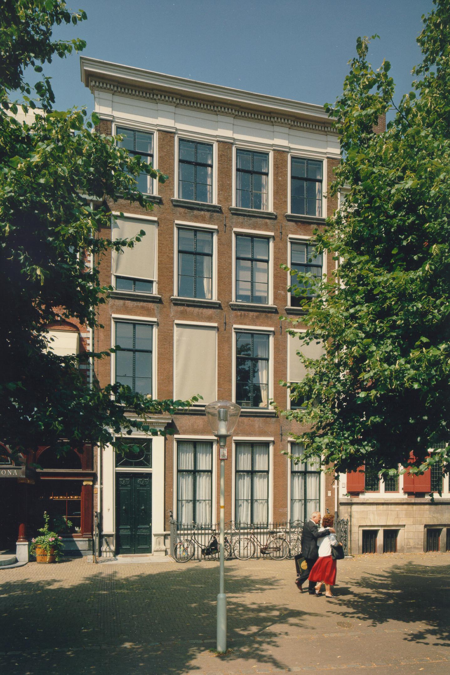Vier verdiepingen hoog PAND met kroonlijst en deuromlijsting in eenvoudige Lodewijk XVI stijl, stoephek.