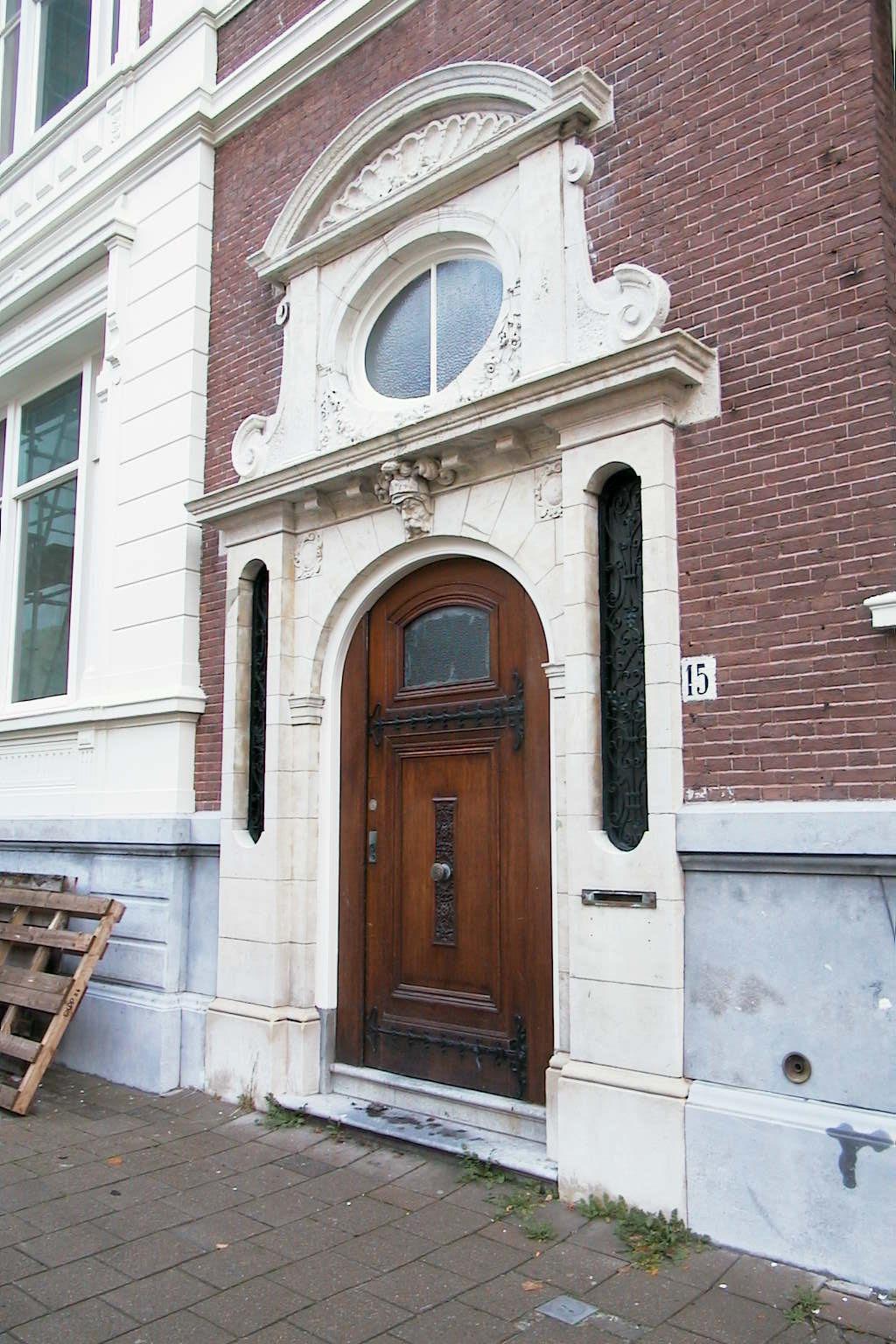 De totale breedte van het complex beslaat zeven vensterassen. De lijstgevel vertoont een hardstenen plint en souterrain, geprofileerde waterlijsten tussen de bouwlagen en een houten hoofdgestel met gekorniste kroonlijst, voluutconsoles en, in het fries, panelen en liggende vensters. De asymmetrische gevel bezit een brede en een smalle risaliet, tegen de belétage van een geblokte bepleistering voorzien en tegen de verdieping met geblokte lisenen op de hoeken. De vensters in de terugliggende geveldelen bezitten geblokte strekken. De vensters in de brede risaliet dragen in de belétage hoofdgestellen en in de verdieping segmentvormige frontons. De driedelige vensters in de risaliet van no. 15 vertonen een zelfde behandeling. De getoogde souterrainvensters van no. 15 bezitten siertraliewerk. De deurpartij van no.l5 vertoont het karakter van de "Um Achtzehnhundert" beweging in de rijke barokke detaillering met kroonlijst waarboven een opzetstuk met zijvoluten, rondvenster, festoenversiering en gebogen fronton met lofwerk. Deze deurpartij is mogelijk omstreeks 1910 aangebracht. In de getoogde deuromlijsting met maskersluitsteen een deur met panelen en smeedwerk.