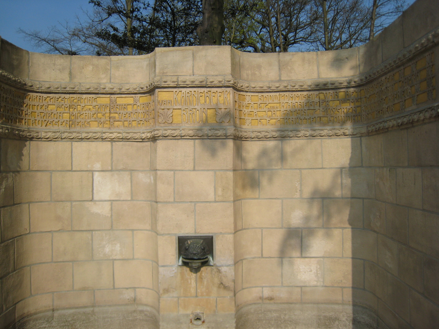Gedenkmonument in historiserende vormentaal naar ontwerp van beeldend kunstenaar Willem Brouwer in de vorm van een zitbank met fontein uit 1915 ter herinnering aan de Carnegiestichting en de oprichting van het Vredespaleis in 1913, en genoemd naar Jonkheer Mr. A.P.C. van Karnebeek (1836-1925), destijds voorzitter van de Stichting. Willem Brouwer was directeur van de N.V. Fabriek van Brouwers aardewerk te Leiderdorp, die ook de materialen voor het gedenkmonument leverde.