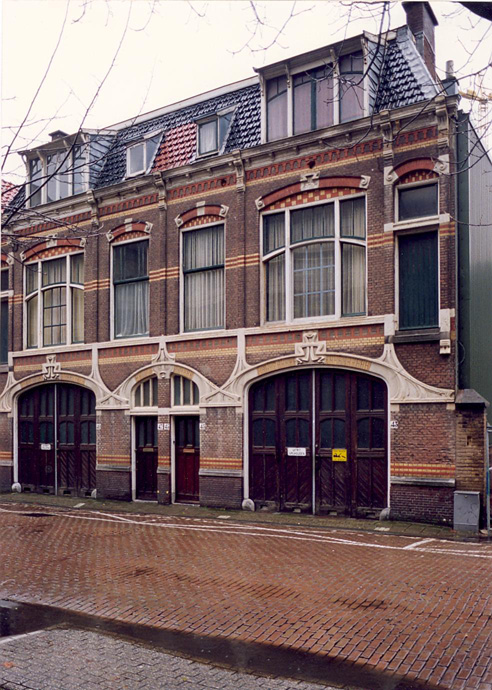 Linker deel van een als een geheel met nr. 43/45 ontworpen bedrijfspand annex bovenwoningen van twee bouwlagen met omlopend, pannen schilddak, waarachter aansluiten twee l9de-eeuwse stallingen met hooizolders. Voorgevel in Art Nouveau stijl uit 1903 met twee inrijdeuren in getoogde, met sculptuur in slingerende vormgeving versierde, omlijstingen. In de verdieping driedelige vensterkozijnen met getoogde middendorpels en ontlastingsbogen met kleurig metselmozaiek, gebeeldhouwde hoekblokken en sluitstenen. De deuren zijn versierd met panelen; de gevel wordt geleed door lisenen en heeft in het metselwerk banden van gele en helderrode baksteen. Geprofileerde waterlijsten scheiden de verdiepingen. Onder de kroonlijst natuurstenen consoles. In de zijtravee van de gevel op de verdieping hijsluiken. Het schilddak bevat twee brede drielichts- en twee kleine houten dapkapellen.