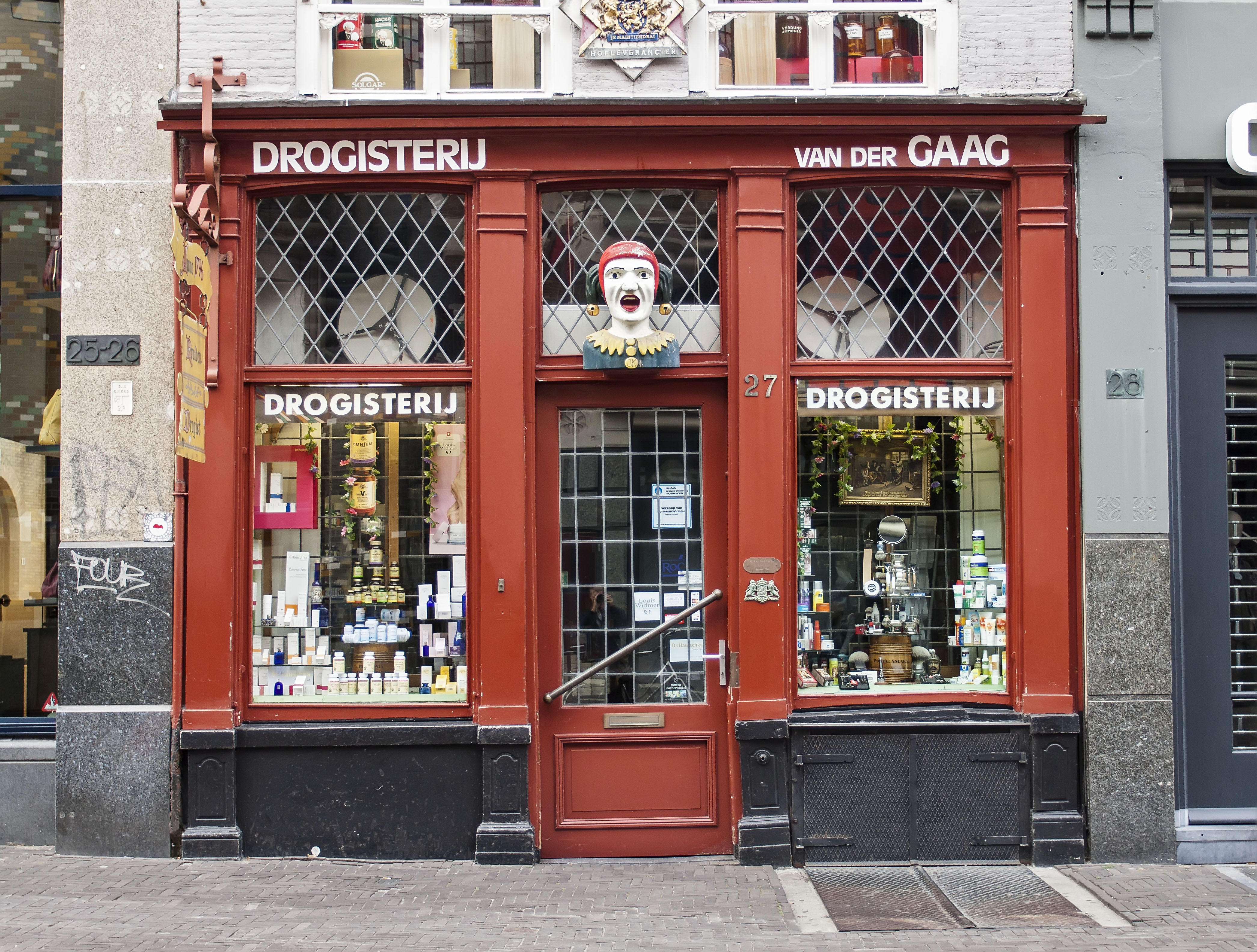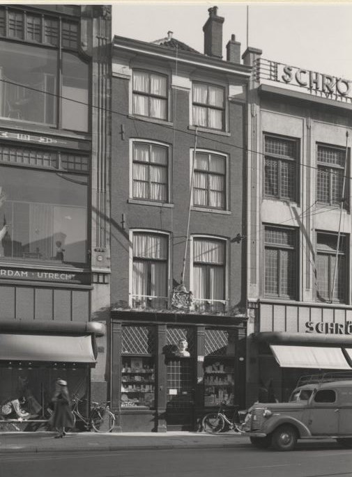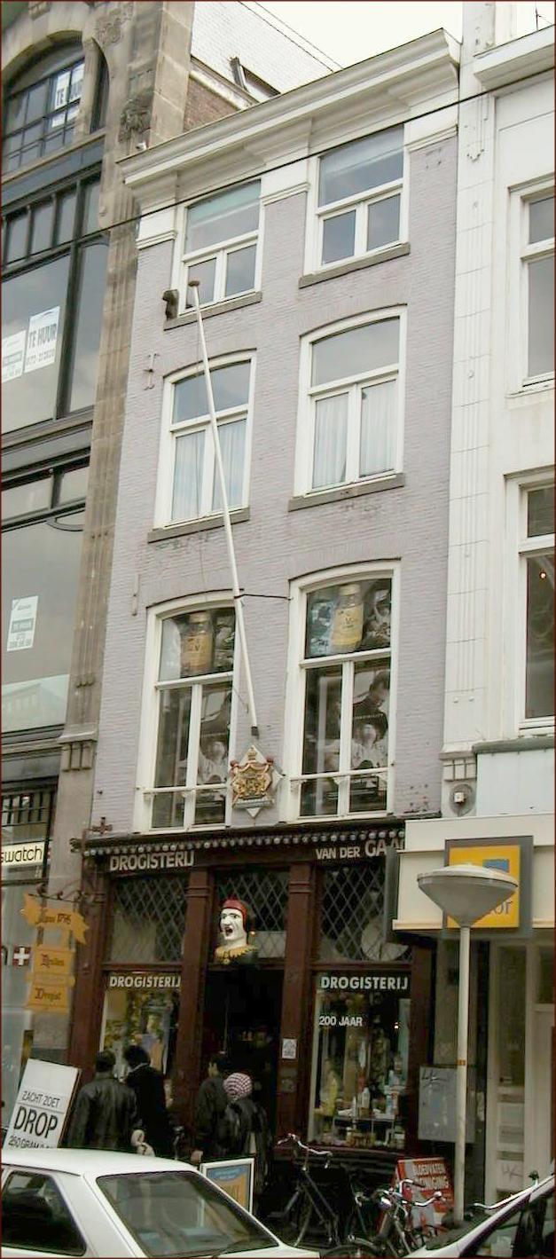 Smal hoog huis, waarschijnlijk uit het midden van de 16e eeuw met een lijstgevel uit 1796, bestaande uit twee vensterassen en drie verdiepingen boven de 19de eeuwse winkelpui. Deze heeft geprofileerde pilasters en puibalk. De vensters van de bovenste verdieping lopen door in de kroonlijst. De drogisterij bezit een volkomen gaaf l9de eeuws winkelinterieur; het balkenplafond is ouder, terwijl de rijk gesneden trap in Lodewijk XV-stijl is uitgevoerd.