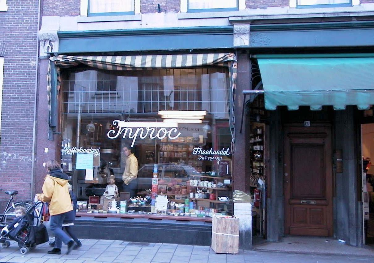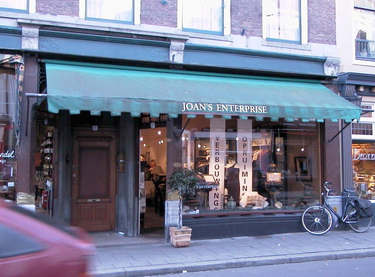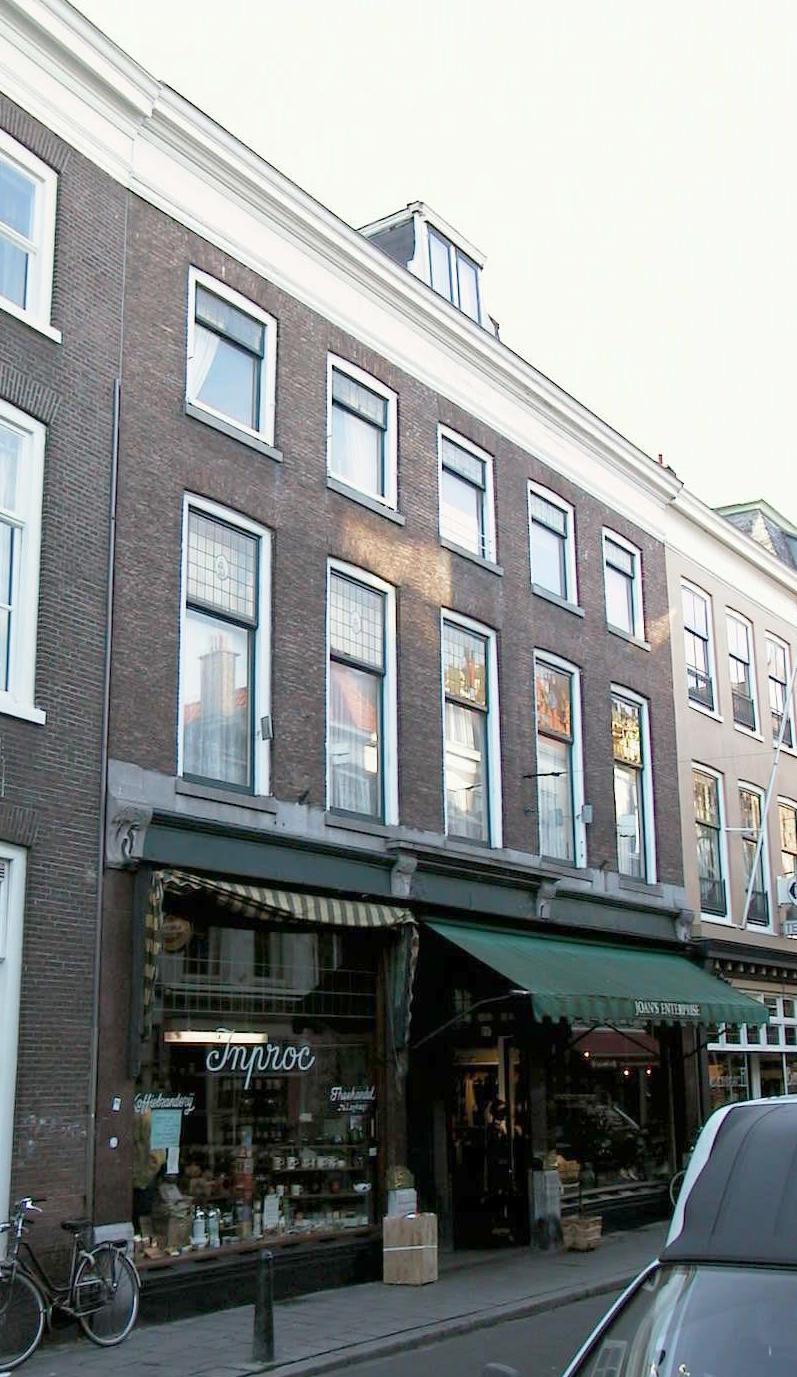 Laat achttiende eeuws pand ter breedte van vijf vensterassen met bakstenen lijstgevel. In de 19de eeuw verbouwd tot woon-, winkelpand. Links en rechts een winkel met centraal de ingang naar het woongedeelte op de verdiepingen. De huidige pui dateert uit ca. 1900 (inscriptie Falkenburg en Co. architecten) en is bekleed met hardsteen (versierd met Jugendstil motieven ter hoogte van de stalen puibalk) en rood graniet. Koperen deurgrepen en plaatwerk in Jugendstil. In de rechterwinkel zijn de wanden bekleed met Art Deco-tegels. Op de eerste en lage tweede verdieping ramen van het tweelicht-type waaronder hardstenen dorpels. De achttiende eeuwse sporenkap met drie forse spanten en standvinken bestaat uit drie schilddaken met een dwars voordak. Het interieur is in hoofdzaak in de staat van de late 19de eeuw met rechts een kamer-en-suite, zwart marmeren schouwen en (resten van) geornamenteerde stucplafonds. De balusters van het trappenhuis zijn in achttiende eeuwse trant.