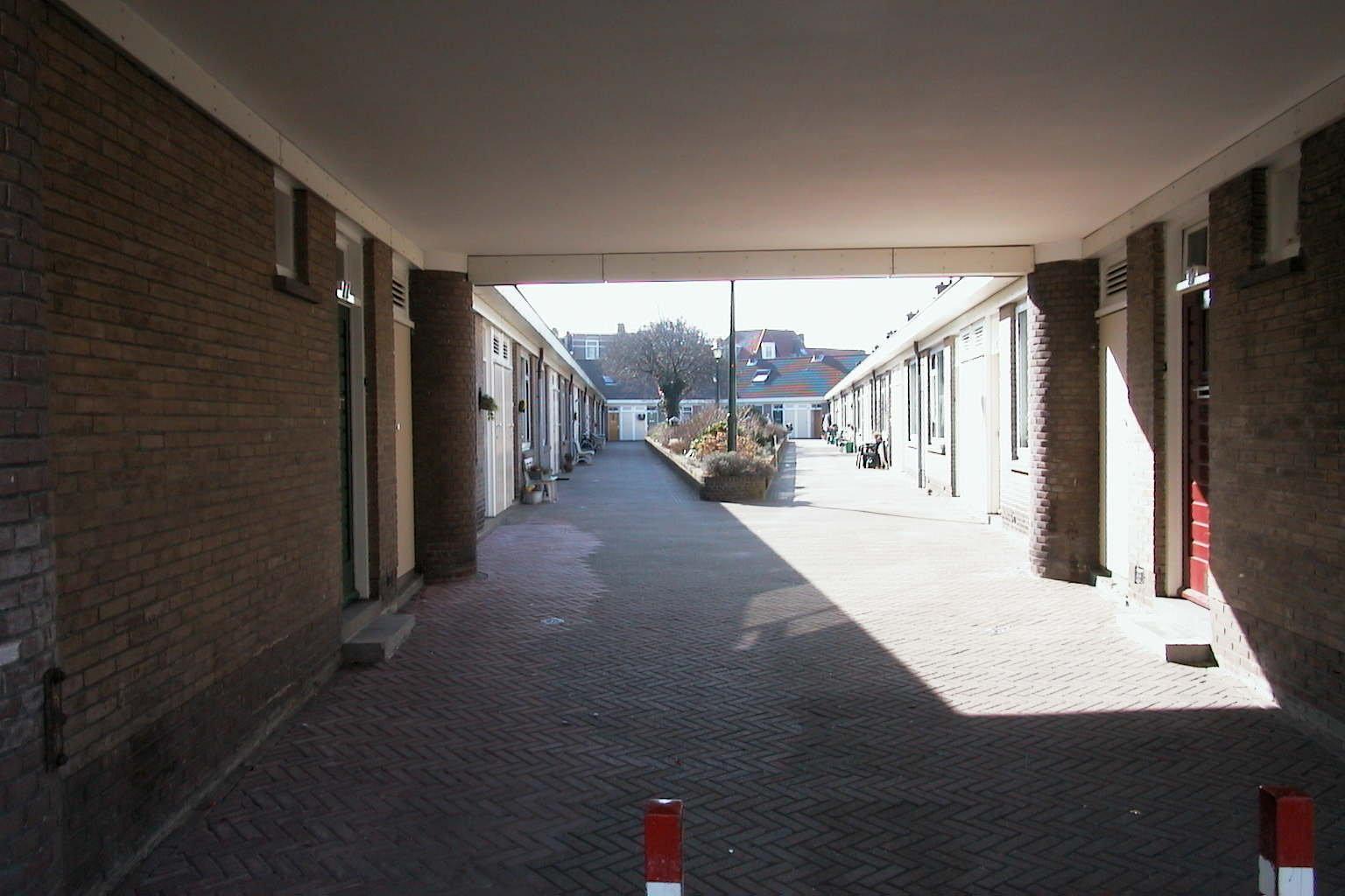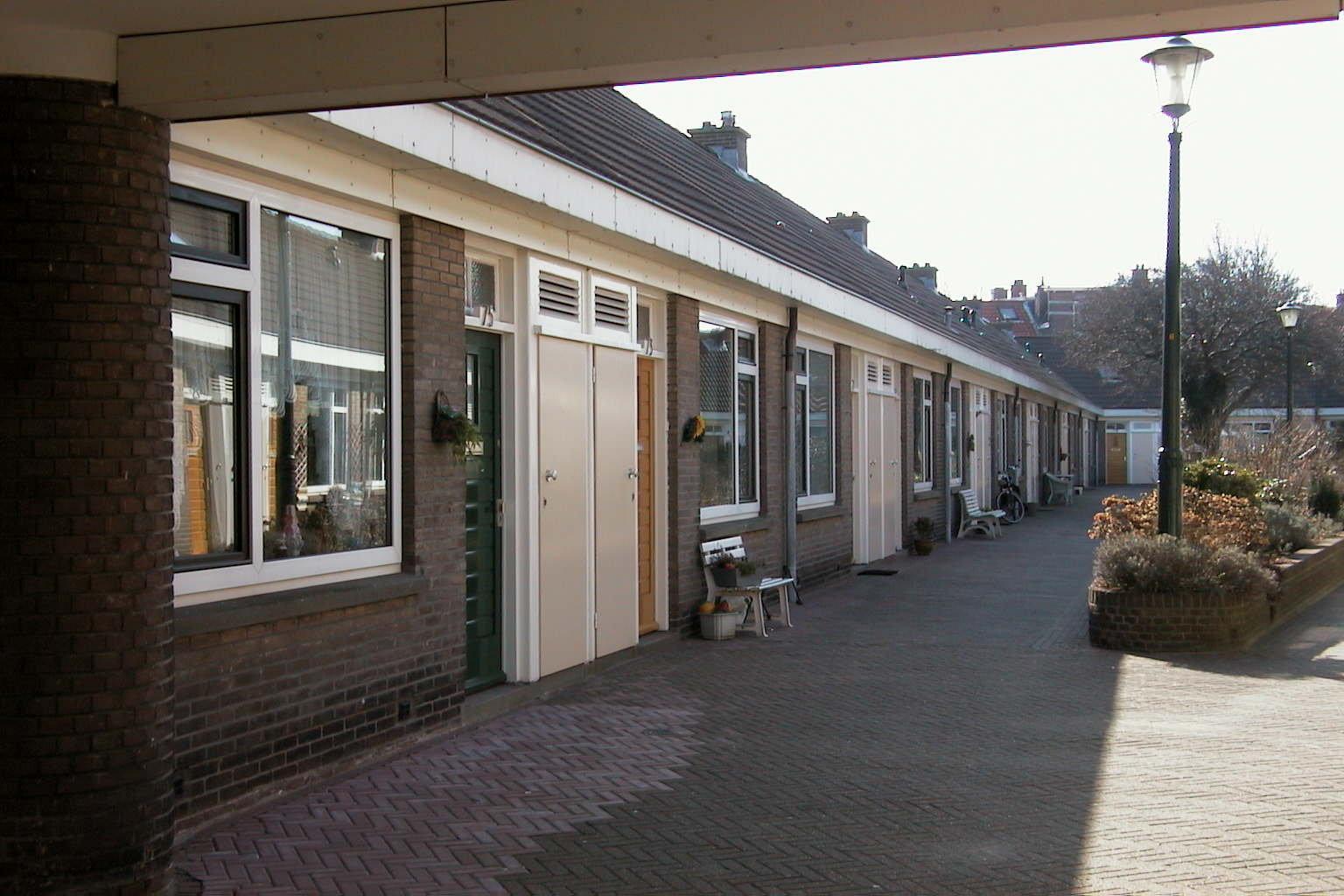 Schevenings sociaal woningbouwhofje uit 1937-1939 bestaande uit éénlaags woningen rondom een lancetvormig plein.