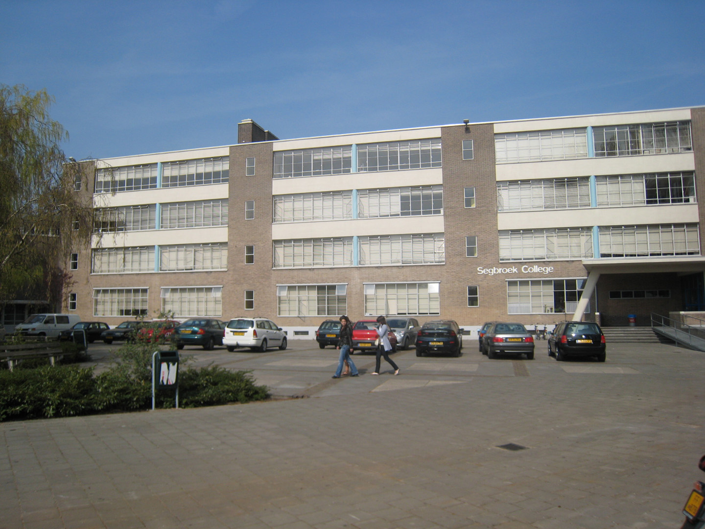 Het SCHOOLGEBOUW bestaat uit een drietal met elkaar verbonden bouwdelen op een samengestelde plattegrond. Het schoolgebouw is opgetrokken in een betonskelet met gevels van gele baksteen (waalsteen) en geschilderd beton. Het hele gebouw is voorzien van stalen ramen en heeft platte daken. De lange vleugel met theorielokalen, trappenhuis, garderobe op de begane grond en een royale aula op de eerste verdieping is voorzien van een souterrain, is vier bouwlagen hoog en gesitueerd langs de Segbroeklaan. De theorielokalen liggen aan de zuidzijde aan het schoolplein, de gang loopt langs de achterzijde aan de noordzijde. Haaks op deze vleugel staat de drie bouwlagen hoge vleugel waarin entree, hal en het centrale trappenhuis zijn ondergebracht. Tevens bevinden zich hier ondermeer praktijklokalen en een stafruimte in de kop van de vleugel.In de oksel tussen beide vleugels ligt in de linker hoek ligt de hoofdentree tot de school, een lage trap door een grote betonnen luifel overdekt. Aan het andere einde van de lange vleugel is middels een uitpandig en rond trappenhuis de vleugel met het gymnastieklokaal en bijbehorende kleed- en doucheruimten gekoppeld. Deze vleugel is onder een schuine hoek geplaatst ten opzichte van de lange vleugel. De voorgevel van de lange vleugel en de gevels van de dwars geplaatste vleugel kenmerken zich door een horizontale geleding van vensterpartijen en betonnen vlakken, onderbroken door verticale bakstenen stroken en betonnen, lichtblauw danwel wit geschilderde kolommen. Alle stalen vensters hebben een indeling van vierkante en rechthoekige ramen. De achterzijde van de lange vleugel en de gevel op de kop van de dwarsvleugel hebben een meer gesloten karakter en zijn voorzien van kleine vierkante vensters met een iets uitstekende betonnen omlijsting, gekoppelde vensters en vensterstroken (waarvan een aantal is voorzien van lichtblauw geschilderde kolommen) en steektrappen die als nooduitgang voor de aula kunnen fungeren. De achtergevel langs de Segbroeklaan heeft een regelmatige indeling van vensterstroken afgewisseld met wat uitstekende, glazen erkers. Ter plaatse van hal en trappenhuis is de gevel voorzien van een royale vensterpartij. Het ronde trappenhuis tussen lange vleugel en vleugel met gymzaal heeft een overwegend gesloten gevel, die onder de lage, ronde overkapping is voorzien van een rondlopende vensterstrook. De gymzaal is aan de zijde van het schoolplein voorzien van hoge glazen vliesgevels waarachter aan de binnenzijde lichtgeel geschilderde kolommen staan en aan de achterzijde deels van een groot uitstekend vlak met vensters en deels van kleinere vensterstroken. In het interieur is de oorspronkelijke ruimtelijke indeling vrijwel geheel gaaf bewaard gebleven. Het centrale trappenhuis met zijn rechte betonnen steektrappen voor omhoog en omlaag gaand 'verkeer' heeft een prominente plaats. De zijkanten van de trapopgangen zijn in een gele kleur geschilderd. In de lange vleugel bevinden zich aan de zuidzijde -schoolpleinzijde- lokalen en aan de noordzijde lopen de gangen. De garderobe en de hierboven gelegen aula met balkon zijn vrijwel oorspronkelijk qua opzet. In het interieur zijn vele materiaaltoepassingen als beton, baksteen, natuursteen (o.a. Naamse steen in hal en rond trappenhuis), tegels (o.a. lichtblauw en geel), granito (o.a. geel in de wc-groepen) zichtbaar.