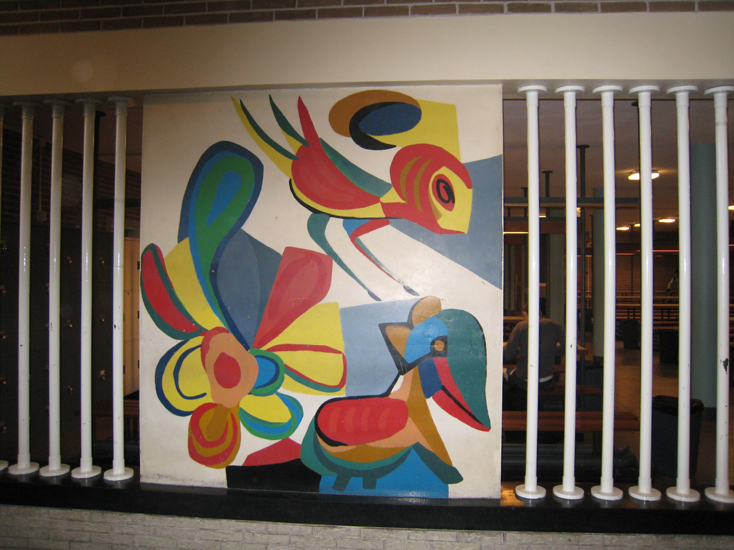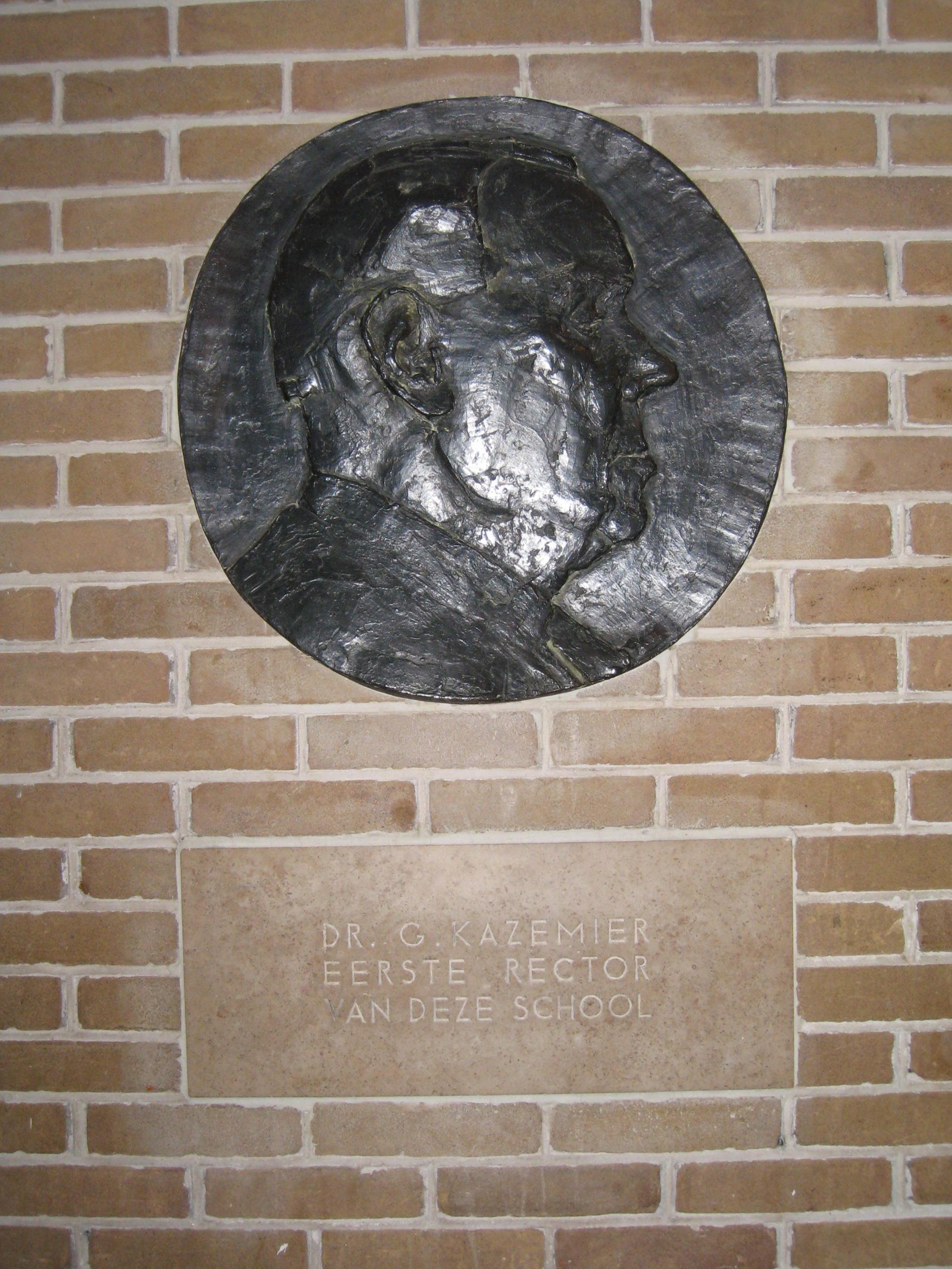 De school wordt tevens gekenmerkt door de toepassing van monumentale kunst. In de centrale hal zijn in 1956 tussen hal en garderobe twee wandschilderingen door Karel Appel aangebracht. Tevens bevindt zich in de hal een reliëf van Wessel Couzijn, voorstellende de Emmausgangers. Een ander in de school aanwezig beeld van Couzijn, een Christoforus, is een geschenk van de leraren geweest. Op de uitbouw van de gymzalen aan de zijde van het schoolplein is een beeldengroep van Rudi Rooyackers geplaatst, voorstellende twee estafettelopers, van wie de ene de fakkel der wetenschap overdraagt aan de andere.