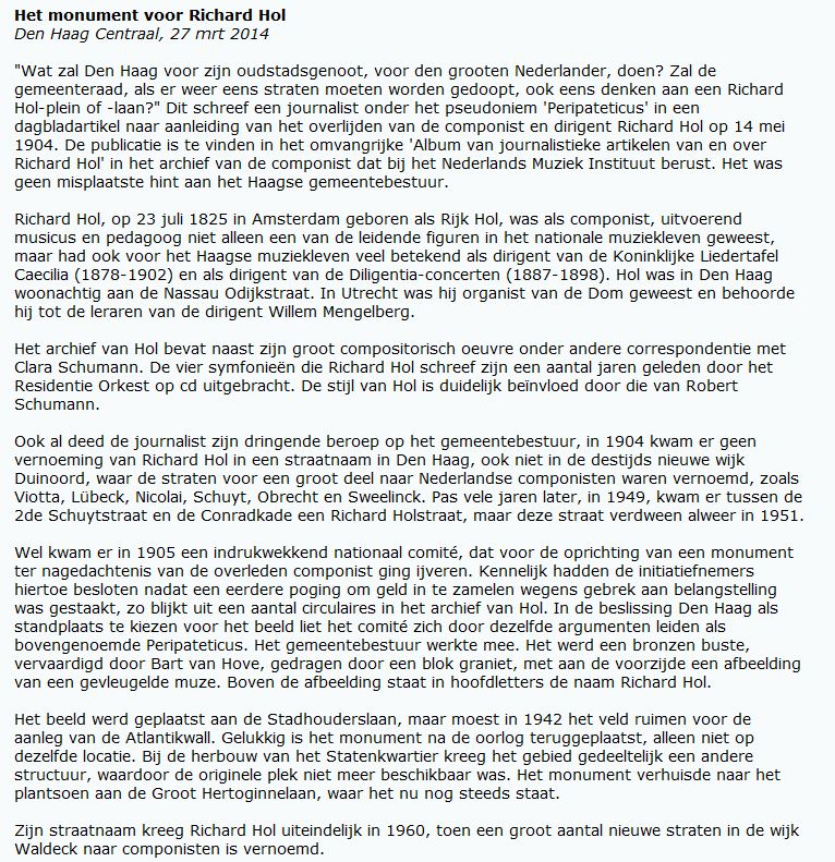 Op 20 oktober 1906 werd aan de Stadhouderslaan een gedenkteken onthuld voor toonkunstenaar Richard Hol, bekend van de liederen 'Waar de blanke top der duinen' en 'In een blauw geruite kiel'. Het monument bestaat uit een bronzen borstbeeld op een circa 3 meter hoge hardstenen sokkel. Op de sokkel is in haut-reliëf een vrouwenfiguur gebeiteld, die de "Muze, de Lier bespelend" voorsteld. Op het bronzen beeld is de naam Bart van Hove aangebracht. Daaronder staat gebeiteld "Richard Hol".