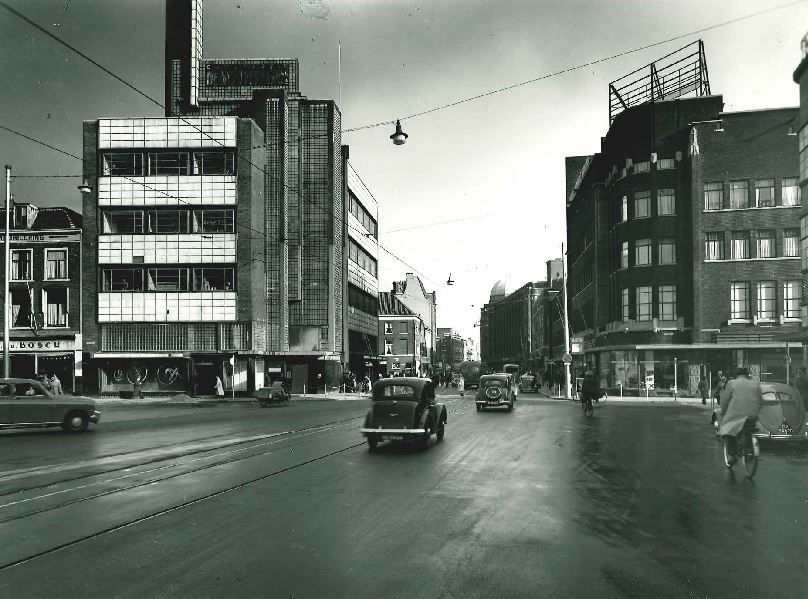 'De Volharding'. Vijf bouwlagen tellend, platafgedekt KANTOORGEBOUW met winkels en magazijnruimten alsmede een vergaderzaal en tot 1938 een tandheelkundige kliniek, en met veel ruimte voor lichtreclames aan de buitenzijde, gebouw in een gemengd Nieuwe Zakelijke, constructivistisch-expressionistische trant naar ontwerp van J.W.E. Buijs en J.B. Lursen in 1927-'28 ten behoeve van de Cooperatieve verbruiks-, voortbrengings- en voorzorgsvereniging 'de Volharding' u.a., en opgetrokken als een gewapend betonskeletconstructie met bekleding van zwart graniet en in aluminium gevatte melkglas en prismaglastegels en met toepassing van vrijwel over de gehele breedte doorlopende vensterstroken - afgewisseld door vier lichtbakken waar door middel van zinken schabloonletters lichtreclames konden worden aangebracht - op een langs scheve lijnen gerooide plattegrond rondom een lichthof aan de overigens gesloten NW-zijde; de haaks op de Grote Markt en Grote Marktstraat staande zijgevels - aansluitend op de met baksteen beklede muurdammen te weerszijden van de vensterstroken - zijn vrijwel geheel blind en witgepleisterd.