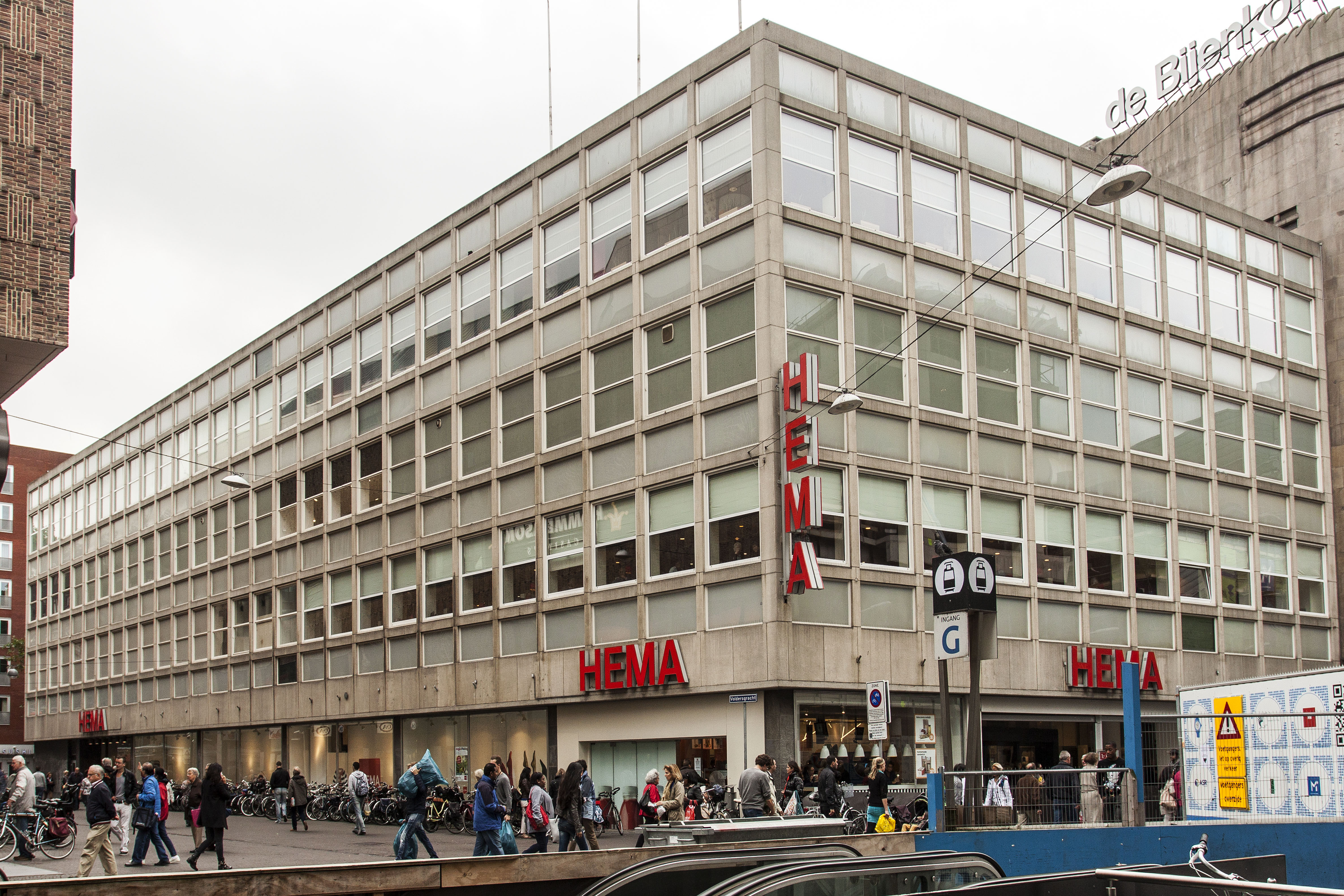 Warenhuis van Hema, gebouwd in 1964 naar ontwerp van architect A. Elzas in de voor de wederopbouw kenmerkende sobere en functionele winkelarchitectuur.