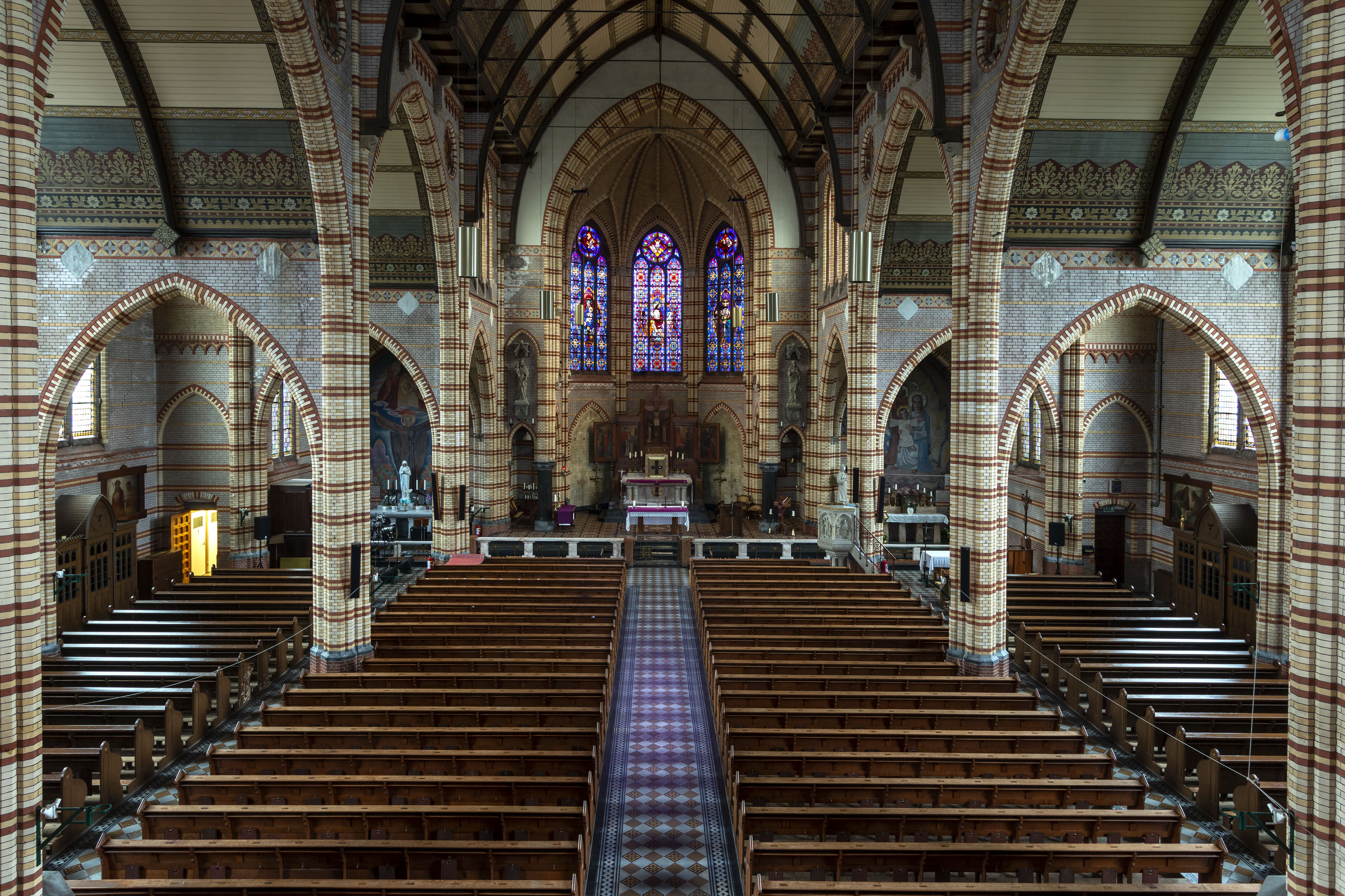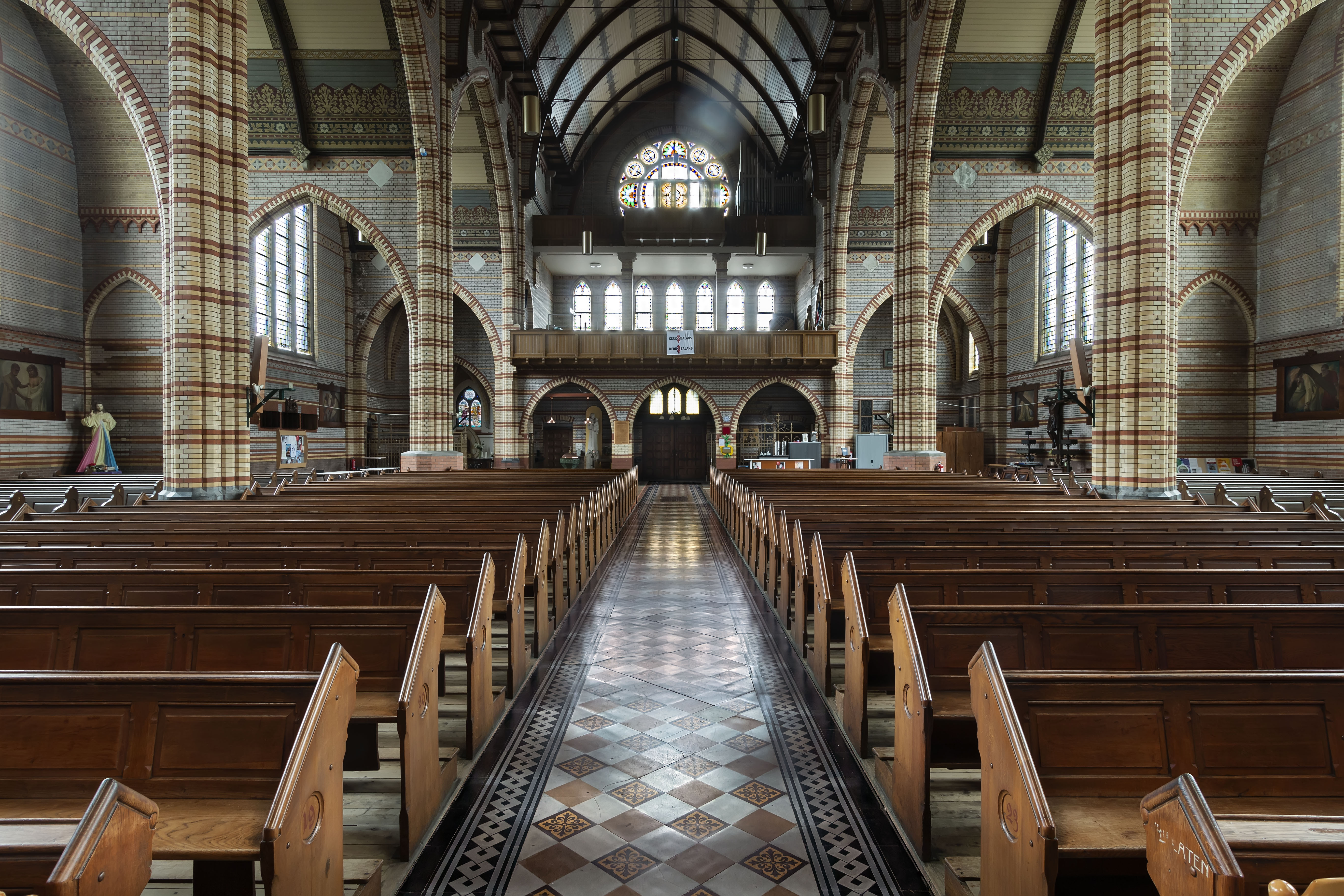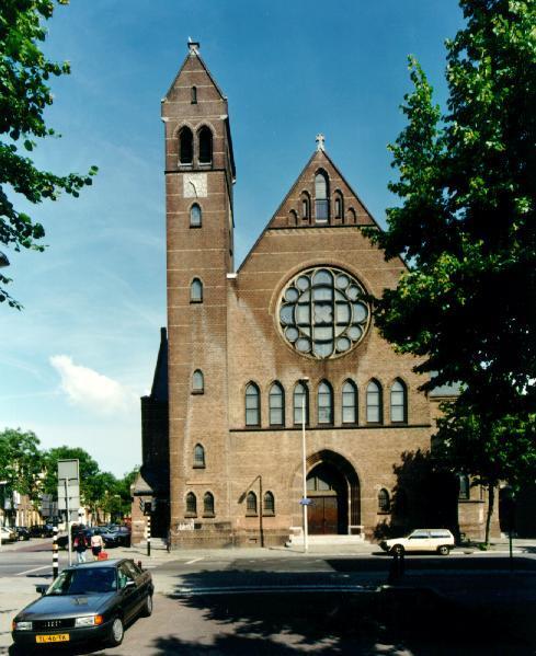 Links en rechts van de voorgevel bevinden zich ingangsportalen onder een lessenaarsdak. De drie transepten worden uitwendig gemarkeerd door topgevels. Het metselwerk is versierd met banden en figuren van gele baksteen, en een spitsboogfries onder de daklijst. In de geveltoppen zijn drielicht-spitsboogvensters aangebracht. Het koor bezit spitsboogvensters met bakstenen traceringen en een spitsboogfries onder de daklijst. Aan weerszijden van het koor staat een dienstgebouw; aan de kant van de Stortenbekerstraat, afgesloten door topgevels en gedekt door een zadeldak. Onder de daklijst is een bakstenen sierrand aangebracht. Beide dienstgebouwen bezitten een traptoren met spits. Het gebouw aan de noordkant doet dienst als sacristie. Tussen dit gebouw en het transept bevindt zich de parochiezaal, die aan de bovenzijde is afgesloten door een open balustrade. Het inwendige van de kerk, geinspireerd op het schip van de Grote of Sint Jacobskerk in Den Haag, bevat ruime zijkapellen met dwars gerichte houten tongewelven die aansluiten op de middenbeuk onder een tongewelf in de lengterichting van de kerk. De tongewelven zijn met decoratieve schilderingen versierd.