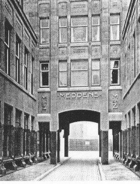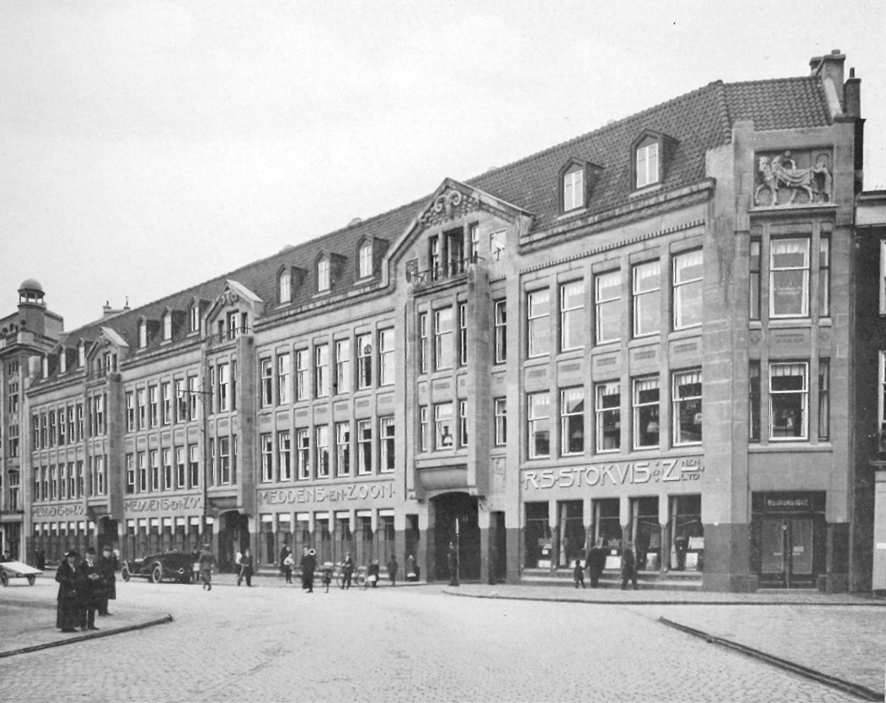 Winkelhuis, gebouwd in 1913-1915 naar ontwerp van H.P. Berlage voor het modehuis Meddens in enigszins traditionalistische, op het classicisme geinspireerde trant. Het pand heeft een ongeveer driehoekige plattegrond en is opgenomen in de straatwand met aaneengesloten bebouwing, met poortdoorgang naar het Achterom; het rechterdeel was in oorsprong bestemd voor de magazijnen van RS Stokvis & Zn, doch is thans bij een ander bedrijf in gebruik.