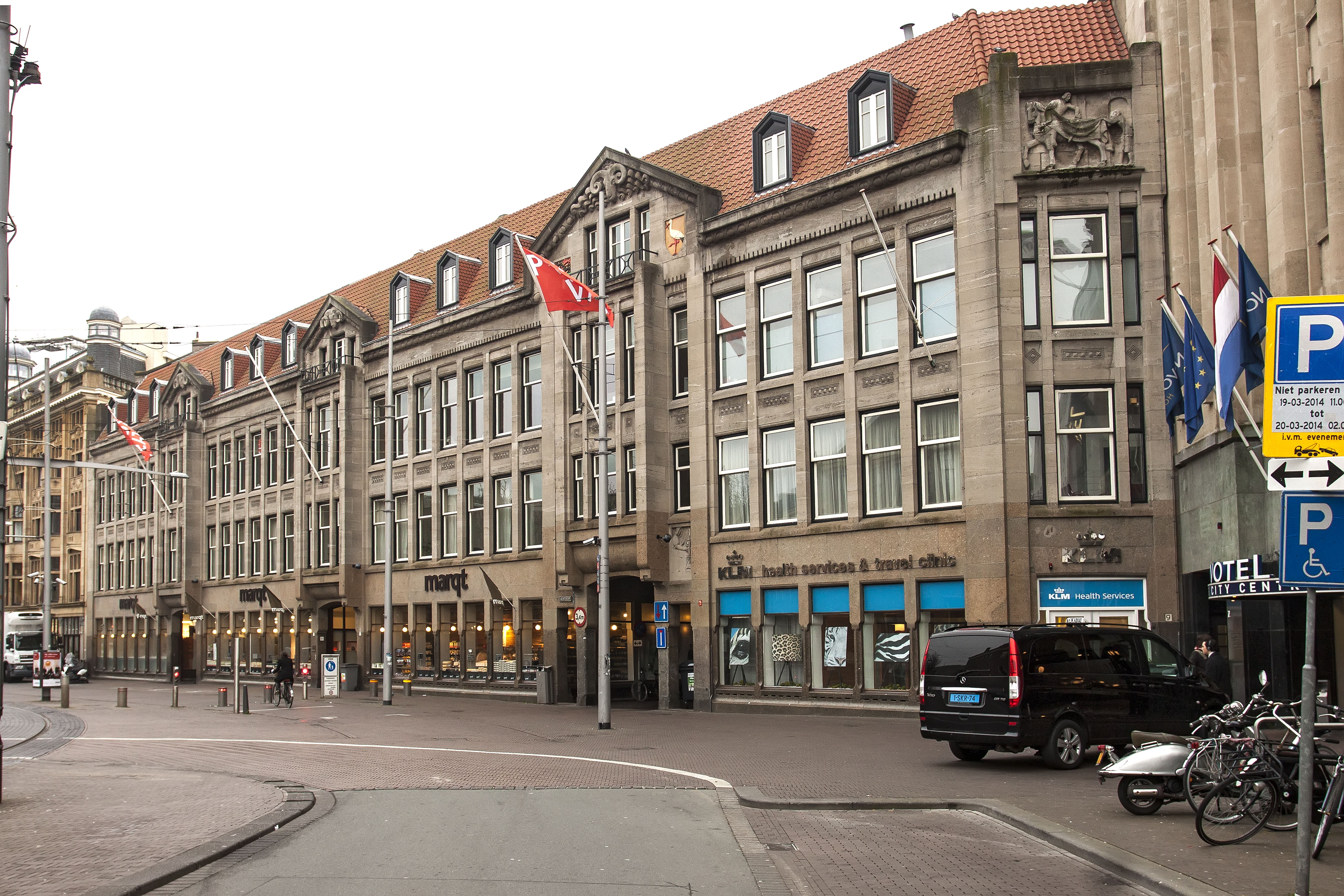 Het winkelhuis omvat drie bouwlagen en een kapverdieping in het met pannen gedekte mansardedak. De breedte bedraagt 32 vensterassen. De gevel is geheel bekleed met natuursteen: het onderste gedeelte vertoont donker graniet en daarboven is lichter getinte zandsteen toegepast. Het verticale karakter van de gevel wordt geaccentueerd door de smalle vensterstroken, gescheiden door pilasterachtige muurdammen. De gevel telt drie risalietvormige partijen, waarboven de daklijst frontonvormig is doorgevoerd: een bredere waarin een driedelige doorrit en twee smallere die aanvankelijk beide toegangen tot de winkelruimte bevatten, maar waarvan de linker thans is veranderd in een etalageruit. Aan weerszijden van de doorrit en in de frontonachtige risalietbekroningen, evenals bovenin de afgeschuinde eindtravee rechts, is sculptuur toegepast van de hand van de beeldhouwer Lambert Zijl. In het mansardedak zijn houten dakkapellen met driehoekige bekroningen aangebracht. De grote warenhuisruimte op de begane grond kon in Berlages opzet naar behoefte worden ingedeeld door middel van verplaatsbare wanden. Waardering.