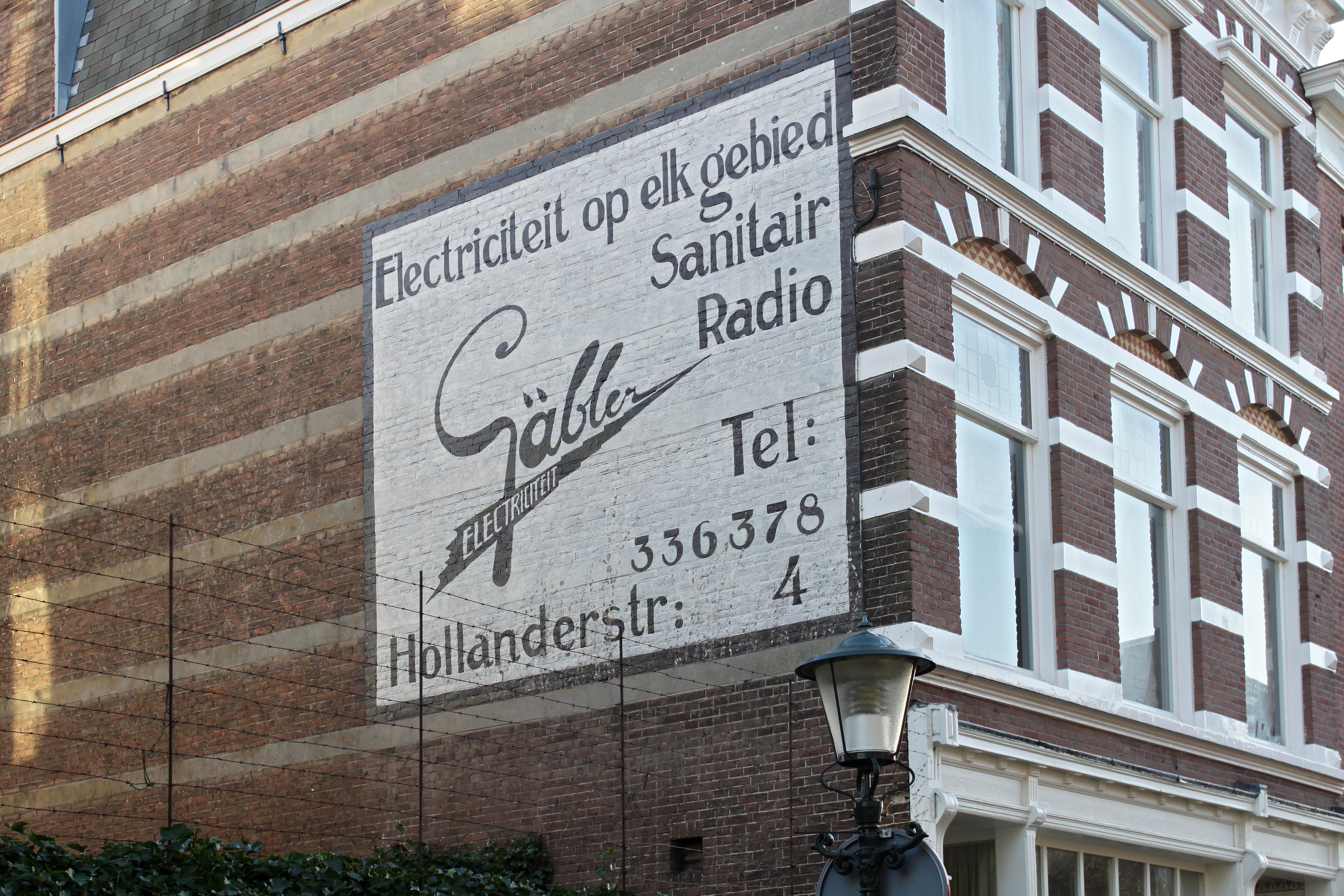 De muurreclame aan de Hollanderstraat is aangebracht in opdracht van de firma Gäbler. Dit bedrijf is een typisch voorbeeld van een firma uit de periode van de opkomst van de elektriciteit en heeft bestaan van 1925 tot 1938. De firma was gevestigd op de benedenverdieping van Hollanderstraat 2-4. De firmant, O.F.R. Gäbler, handelde in producten voor "electriciteit op elk gebied", voor "sanitair" en "radio", zoals de muurreclame vermeldt. De reclame is opgebouwd uit zes regels in zwart op een wit fond met middenlinks een handtekening van de firmant. Onderaan zijn het adres en telefoonnummer te lezen. Gäbler heeft maar betrekkelijk kort, een vijftal jaren, hier een winkel gedreven. Hij emigreerde in 1938 naar Zuid Afrika.