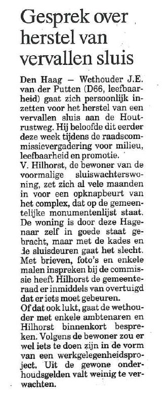 Sluiskom, sluizen en toebehoren aangelegd door de hoofdingenieur van de Provinciale Waterstaat Ir. J. van der Vegt aan het in 1888 gereedgekomen Haagse Afvoerkanaal De sluizen met houten deuren hebben gemetselde kademuren met hardstenen afdekplaten en gebosseerde hoeken. Hier en op de ijzeren voetgangersbrug zijn ijzeren hekken en gedecoreerde gietijzeren lantaarnpalen uit de bouwtijd. Waardering.
