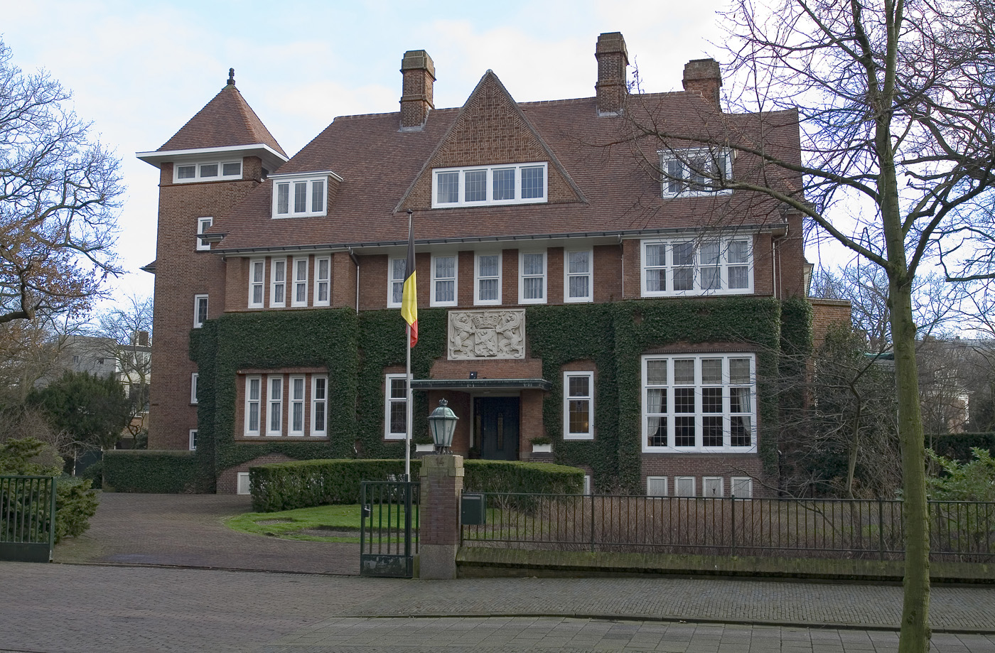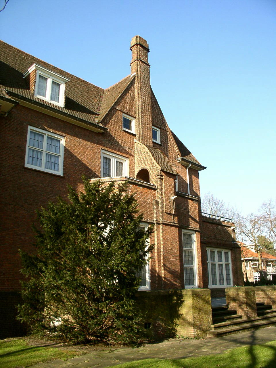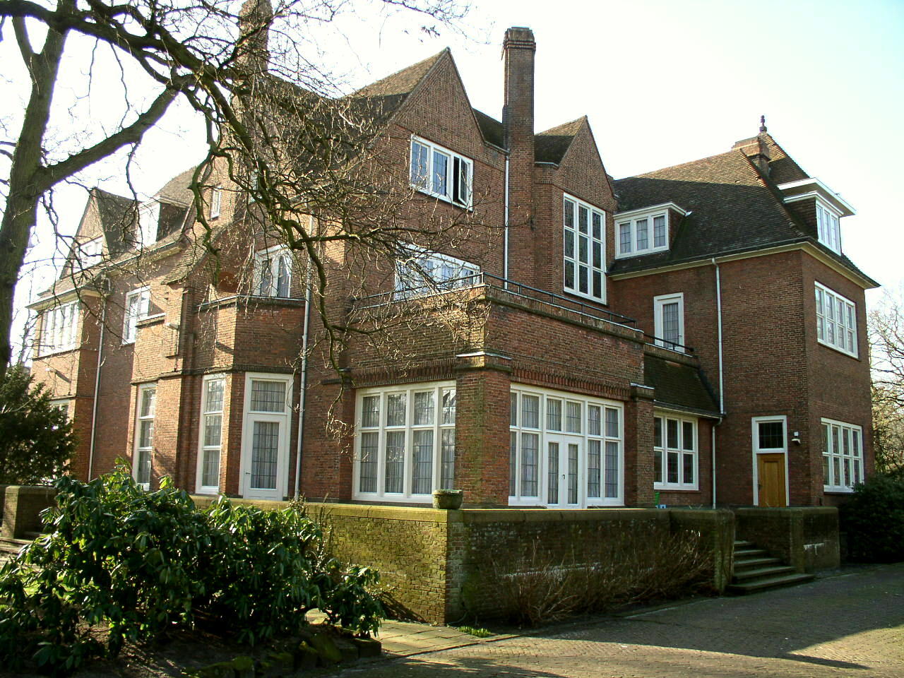 De middenas van de voorgevel wordt bekroond door een in het dak geplaatste topgevel, waarvan het gevelvlak is versierd met gemetseld vlechtwerk. De assen aan weerszijden zijn als risaliet uitgebouwd. Boven de ingang in de middenas bevindt zich een wapensteen, die evenals de luifel uit 1938 dateert. In dat jaar werd ook het oorspronkelijke terras tegen de rechterzijgevel aan de Tobias Asserlaan in een serre gewijzigd. Deze gevel bevat voorts in de zijassen twee driezijdig uitgebouwde erkers, waarboven een balkon met een bakstenen borstwering. De assen worden bekroond door een topgevel met gemetseld vlechtwerk.