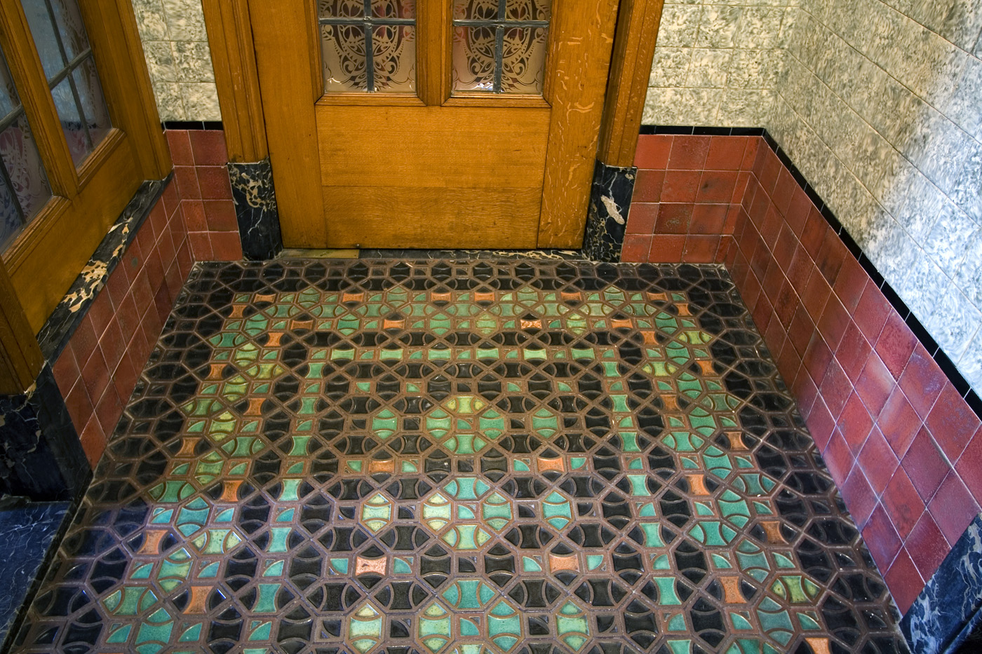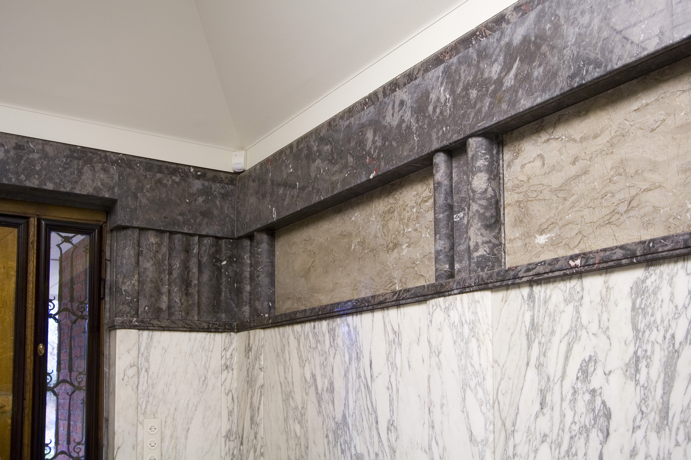 De gevels bezitten houten vensters van verschillende typen, waarvan het merendeel met glas-in-lood. In het trappenhuis zijn gebrandschilderde ramen aangebracht, o.a. een raam uit 1950 met de wapens van de Belgische provincies en een ouder raam met allegorische voorstellingen.