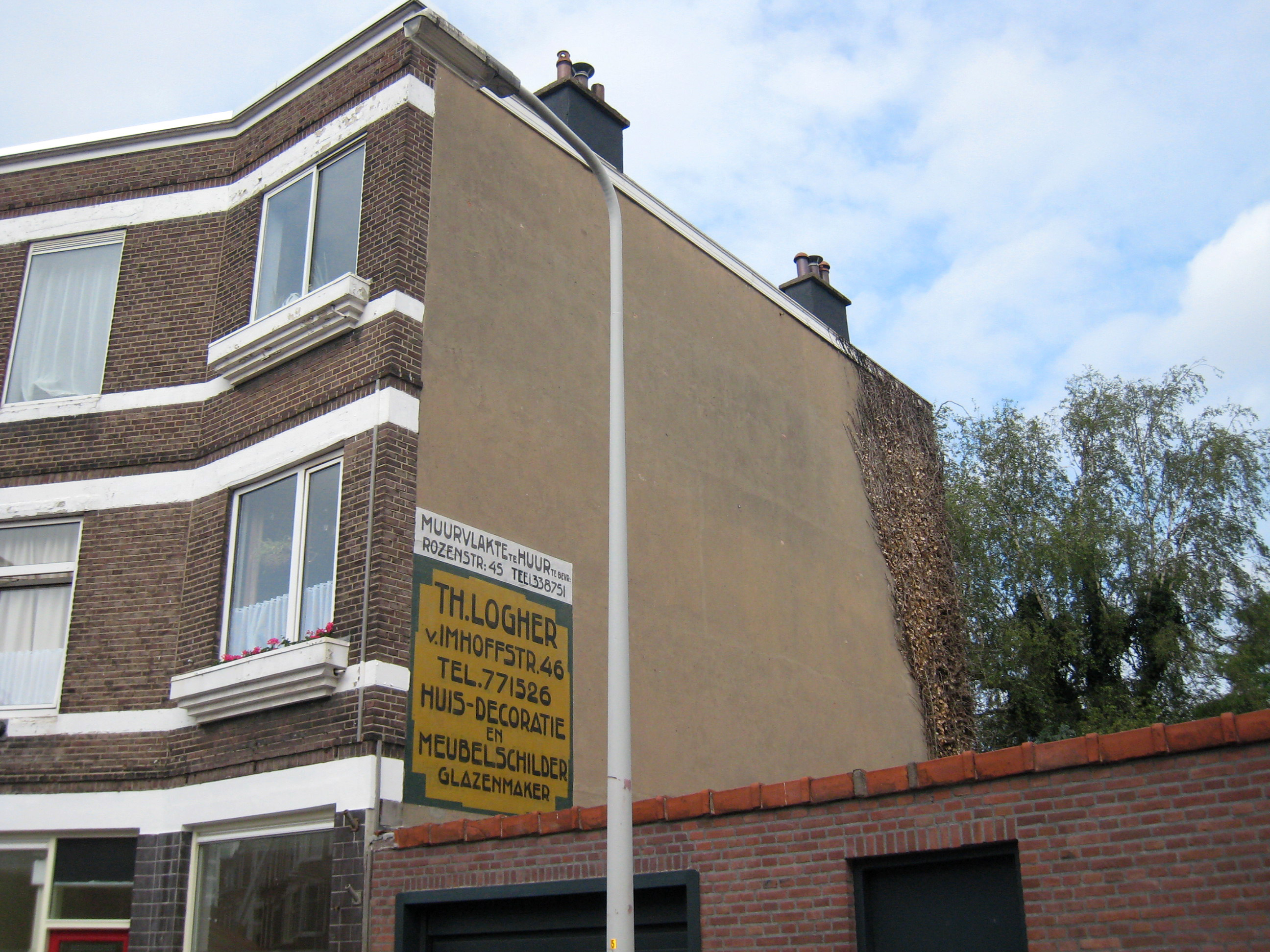 De muurschildering is vermoedelijk door de adverterende schilder zelf aangebracht. De datering van de reclame valt af te leiden uit de gegevens uit adres- en telefoonboeken van Den Haag. De adverterende firma Th. Logher werd in 1926 opgericht en was toen gevestigd aan de De Carpentierstraat 2 10-212. Enige jaren later is de firma verhuisd naar de Van Imhoffstraat 46. De reclameschildering bestaat uit een geel fond met zwarte tekst en een groene, sober gedecoreerde sieromlijsting. De volledige reclametekst luidt: "Th. Logher v.Imhoffstraat 46 Tel. 771526 huis- decoratie en meubelschilder glazenmaker". Aan de bovenkant bevindt zich een smalle reclame, wit fond met zwarte letters, voor een ander bedrijf dat deze muur verhuurde voor reclames. Hier staat te lezen: "Muurvlakte te huur te bevr.: Rozenstr: 45 tel 338751". Door slijtage is ook een oudere onderschildering door de bovenste laag waar te nemen. De schildering is in 2005 gerestaureerd.