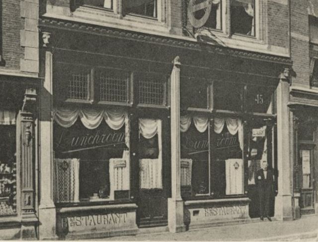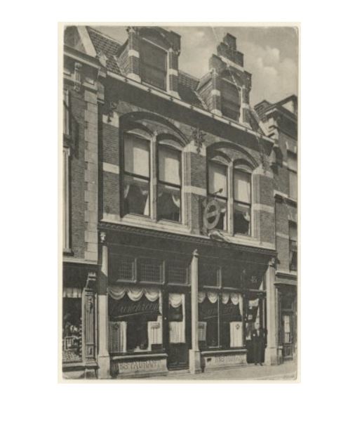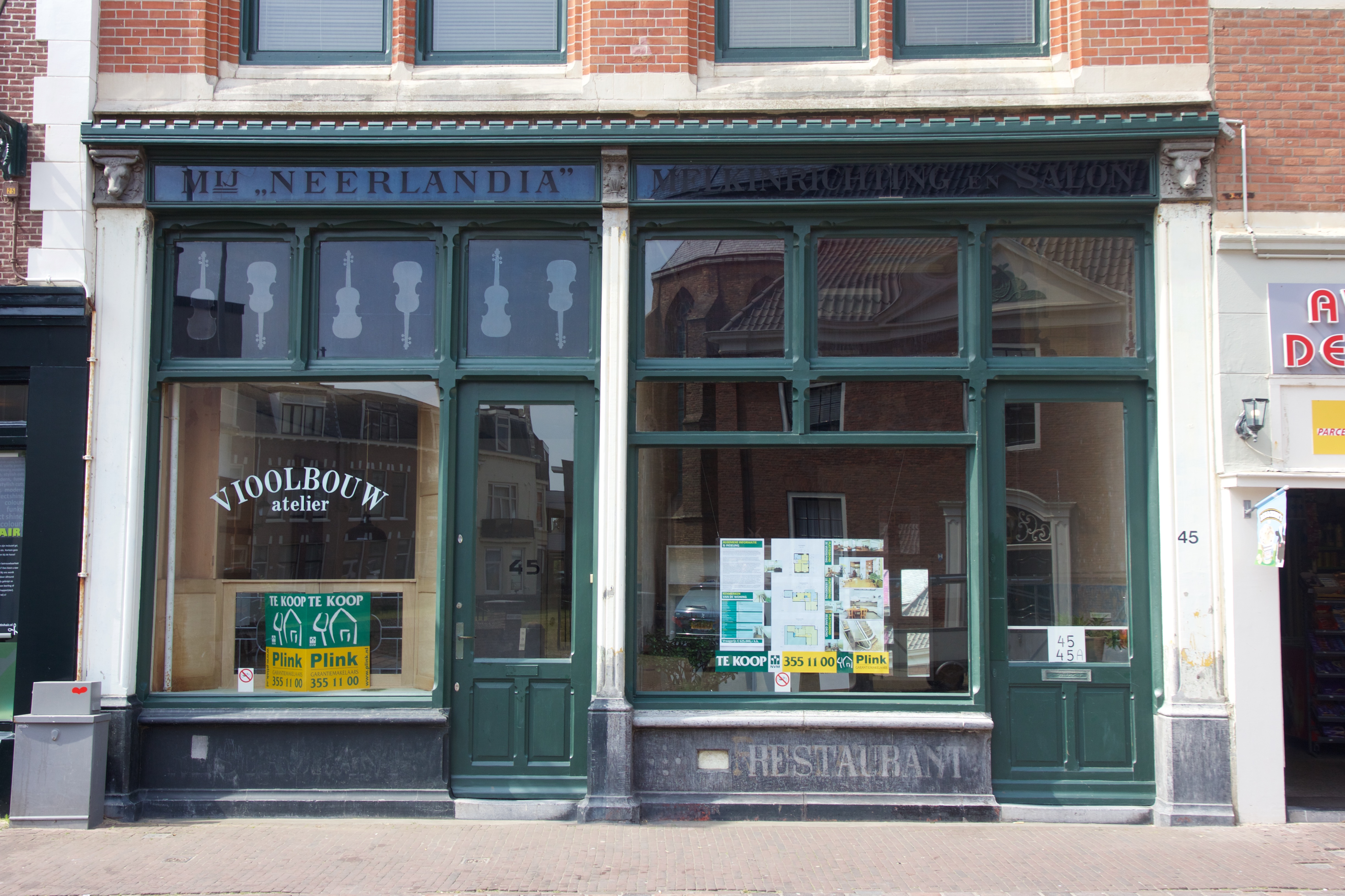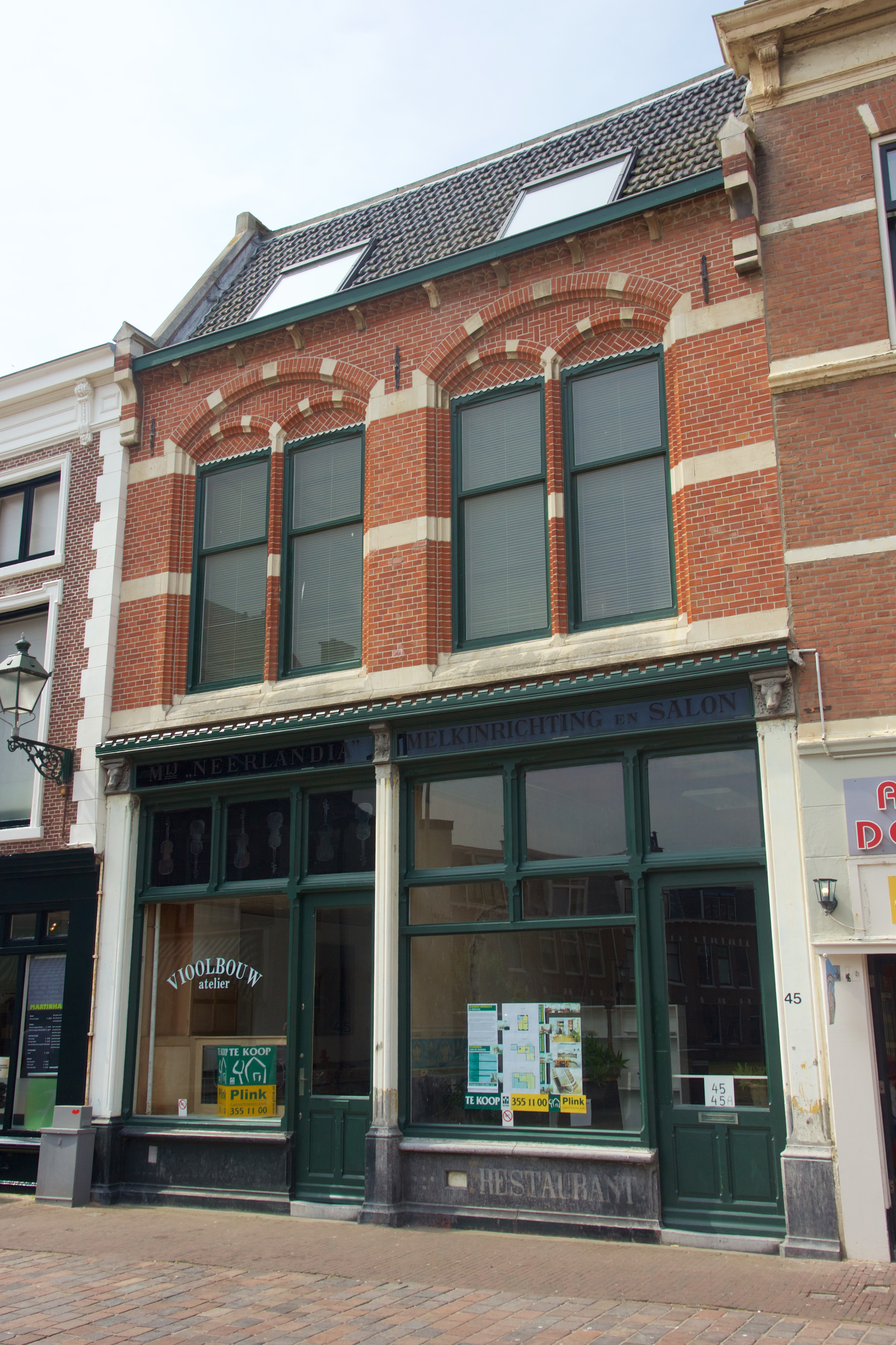 Pand dat bestaat uit parterre, verdieping en een evenwijdig aan de straat lopende kap tussen puntgevels. Het werd gebouwd in 1896-1897 in opdracht van de N.V. tot Exploitatie van Zuivelinrichtingen Neerlandia te 's-Gravenhage. De zorgvuldig gedetailleerde gevel in neorenaissancestiji dateert uit de jaren negentig van de 19de eeuw. De aan de rechterzijde gewijzigde winkelpui heeft een hardstenen plint en pilasters onder een puibalk die aan de uiteinden is versierd met gebeeldhouwde runderkoppen. In het glazen fries onder de puibalk is een opschrift aangebracht: Mij. Neerlandia Melkinrichting en salon. De verdieping bezit vier twee aan twee gekoppelde en door een gemeenschappelijke boog omvatte vensters met ontlastingsbogen. De geprofileerde bakstenen bogen vertonen in de boogtrommels vlechtmetselwerk. De gevel is voorts versierd met natuustenen banden en blokken.