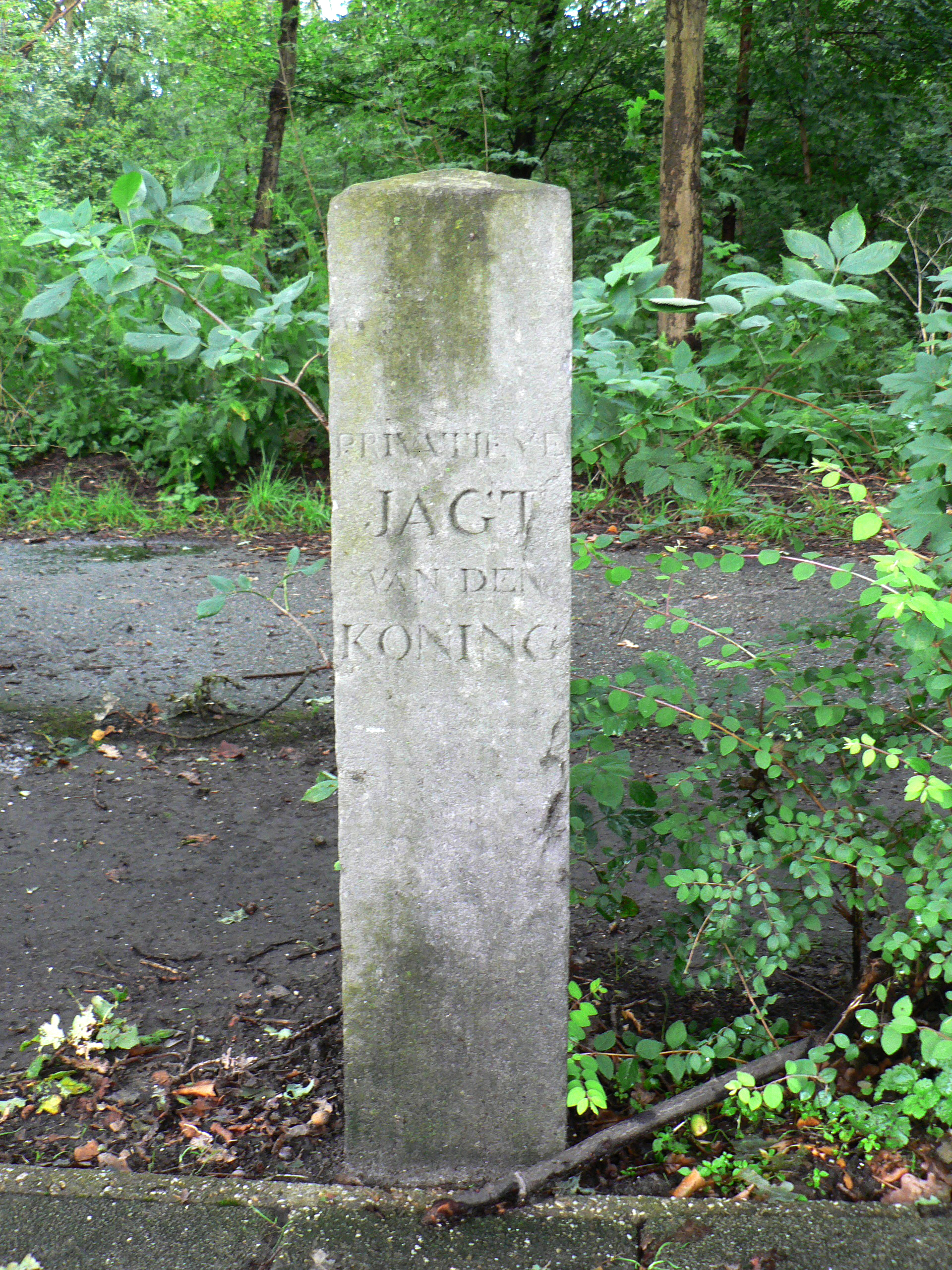 Hardstenen grenspaal uit de negentiende eeuw bedoeld voor de afbakening van het privé jachtterrein van de koning van Nederland.