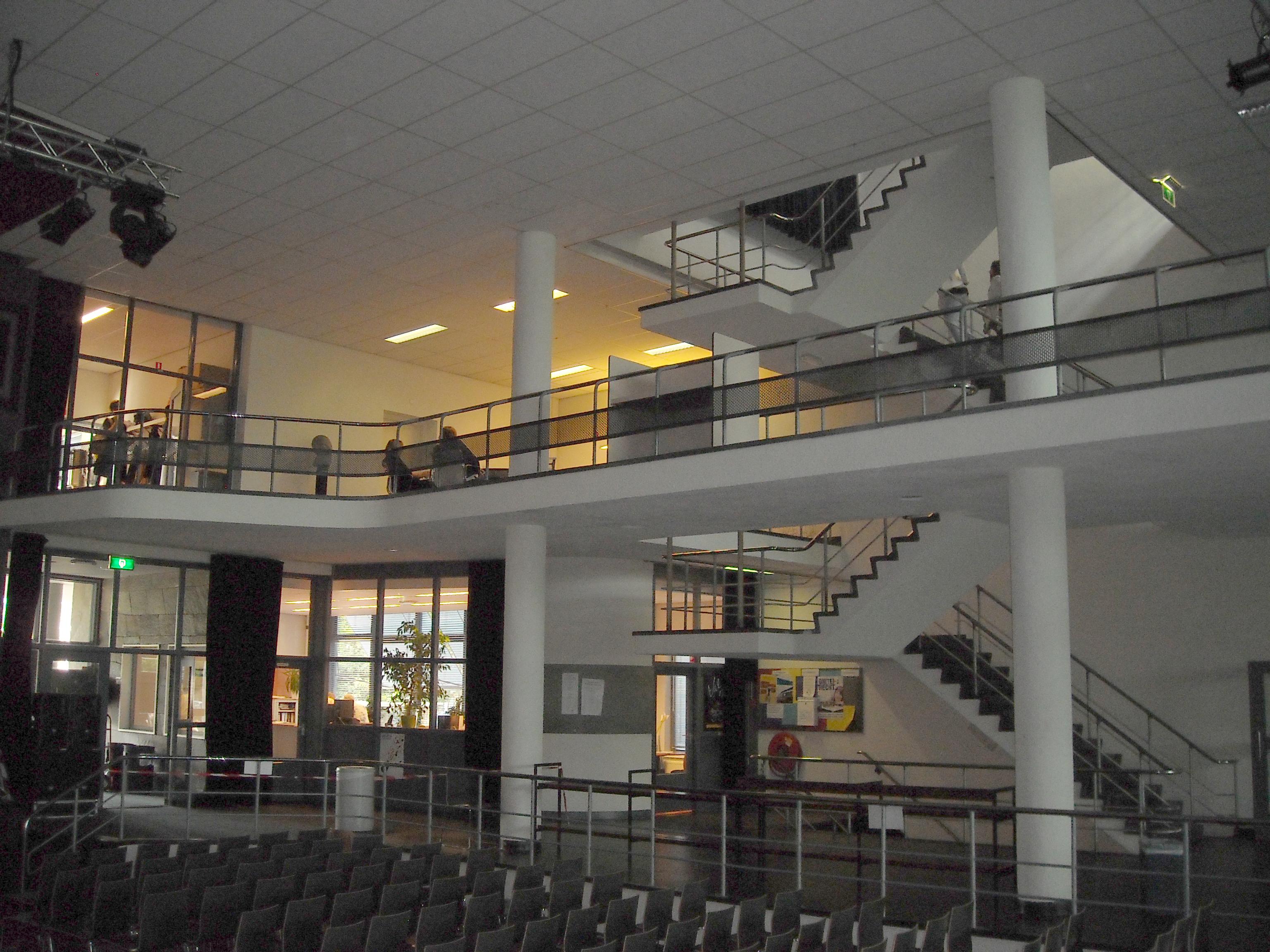 De verdiepingen van de hoofdvleugel kennen een basisopzet van een brede gang aan de noordzijde en klaslokalen aan de zuidzijde van het gebouw. De gangen zijn voorzien van werknissen en dwarsgeplaatste (boeken)kasten, volgens Daltonpricipes. De wanden tussen lokalen en gang zijn deels van glas en voorzien van vitrines. Het tekenlokaal (tevens voorzien van dakterras) en het muzieklokaal op de tweede verdieping zijn over de volle breedte van het gebouw geplaatst. Aan de linkerzijde van de school zijn in een dwarsgeplaatste korte vleugel de twee gymzalen met bijbehorende kleed- en doucheruimten, de vm. bibliotheek en de inpandige conciërgewoning ondergebracht. De entreepartij tot de school wordt aan weerszijden geaccentueerd door een royaal kunstwerk in betonmozaïek van kunstenaar W.J. Rozendaal waarop 'scenes uit het schoolleven' worden verbeeld. Tevens maakte hij de met leiplaten bekleedde vlakken met vogelmotieven aan de buitenzijde van de dwarsgeplaatste entreevleugel en de wand bij de administratie. In de aula zijn de kleine ronde glas-in-loodvensters goed bewaard gebleven, evenals de voorstellingen op het toneelfront in chromolyth pleister, eveneens ontworpen door W.J Rozendaal.