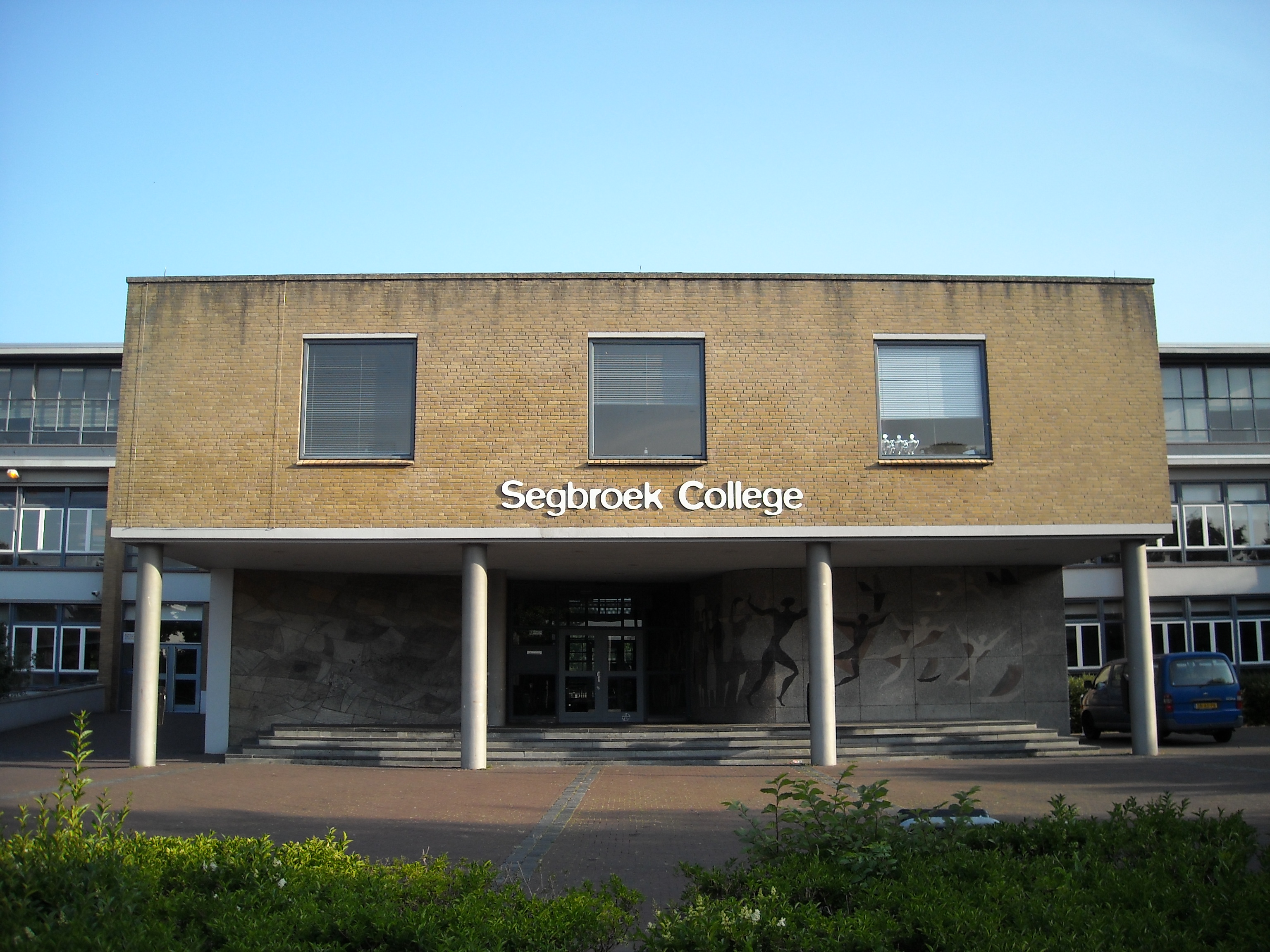 Het SCHOOLGEBOUW van het Grotius Lyceum (thans Segbroekcollege) met inpandige CONCIERGEWONING werd gebouwd in de periode 1949-1955 naar ontwerp van architect Sjoerd Schamhart (1919-2007), destijds in dienst van de Dienst Gemeentewerken van Den Haag. De school is de opvolger van het in 1942 gesloopte Stokrooslyceum uit 1925 (architect D.C. van der Zwart) dat gelegen was binnen de gedurende de oorlogsjaren ontruimde en als Sperrgebiet ten behoeve van de Atlantikwall ingerichte weststrook van Den Haag. In 1946 ontwierp W.M. Dudok voor dit gebied het wederopbouwplan Sportlaan-Zorgvliet. Het terrein waar de school op werd gebouwd was ondiep en grensde aan de achterzijde aan een sportveld. Het schoolgebouw moest een afsluiting vormen van de as Chrysantplein-Pomonaplein en ingevoegd worden in een kleinschalige woonbuurt. Sjoerd Schamhart ontwierp daarom een langgerekt, ondiep gebouw met een iets gebogen plattegrond. De genoemde as is door Schamhart aangehouden voor de situering van de hoofdentree tot de school. In de school is zichtbaar dat het Daltonsysteem is toegepast, waarbij iedere leraar zijn eigen vaklokaal had en de leerlingen tussen de lesuren van lokaal wisselden. De daardoor veroorzaakte verkeersstromen maakten het noodzakelijk dat er goede verkeersruimten waren zoals een hal en trappenhuizen. Bij het Daltononderwijs lag de nadruk op het zelfstandig leren werken van de scholieren. Daarom werden er in de gangen van het gebouw werknissen gecreëerd waar leerlingen zelfstandig aan opdrachten konden werken.