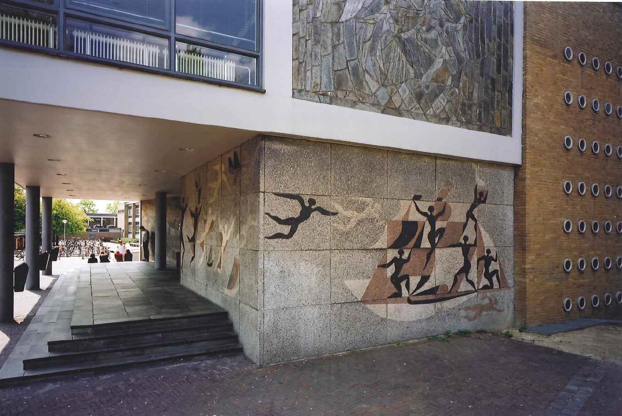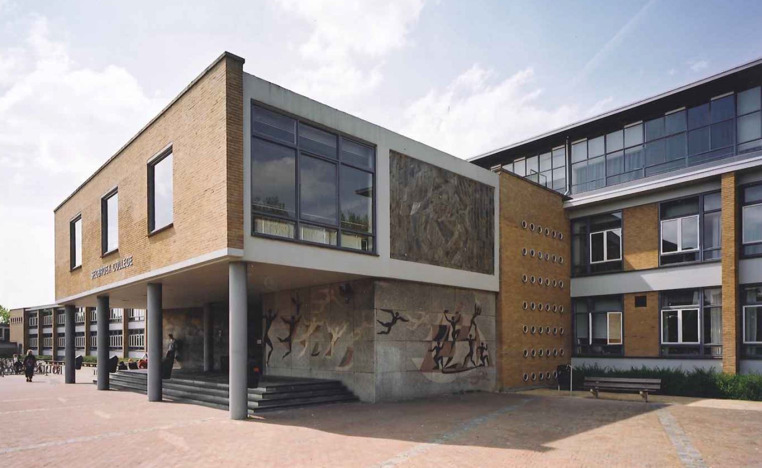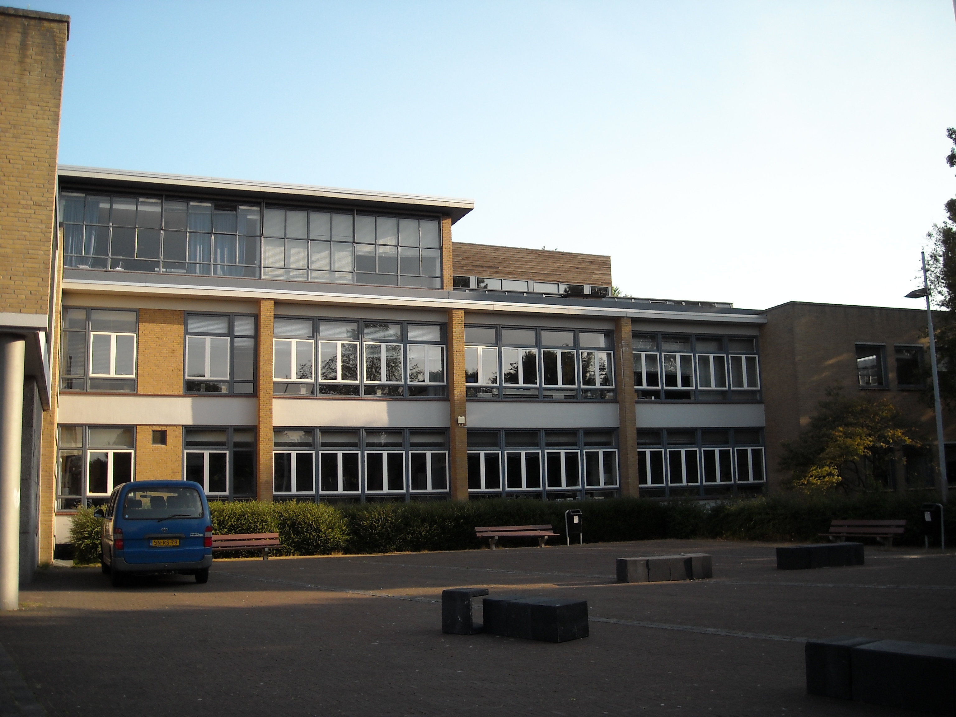 Het SCHOOLGEBOUW is een langgerekt en ondiep gebouw met een iets gebogen plattegrond. Het gebouw is voorzien van een souterrain en is twee en deels drie bouwlagen hoog en voorzien van platte daken. Het gebouw is opgetrokken in betonskeletbouw met wanden van gele baksteen (waalsteen), waarbij de scheidingswanden tussen de lokalen en de achtergevel een dragende functie hebben. De bovenbouw (tweede verdieping) heeft een stalen spantconstructie. Ook de gymzalen hebben een constructie van stalen spanten. De voorgevel heeft een horizontale geleding van vensterpartijen en betonvlakken, onderbroken door sterke verticale accenten in de vorm van gemetselde steunberen die de overstekende dakrand dragen. Tussen de steunberen bevinden zich de vensterpartijen, bestaande uit vier gekoppelde stalen ramen met een gekantelde H-vormige indeling. De achtergevel heeft eveneens stalen vensters, waarvan er vele zijn voorzien van een kruisvormige indeling. De gymzalen zijn voorzien van hoge stalen ramen. De CONCIERGEWONING is eveneens voorzien van stalen ramen. Alle vensters en een groot aantal entrees zijn thans (2009) in blauwgrijze tinten geschilderd. De hoofdentree tot de school bevindt zich in de dwars op het hoofdvolume geplaatste, korte vleugel met meer gesloten gevels die voorzien zijn van wandkunst. In dit deel bevindt zich ook de hal. Deze royale hal die direct achter de hoofdentree ligt, heeft meerdere functies: verkeersruimte met hal en trappenhuis en aula. Een deel van de hal ligt wat verdiept en er is een toneel aangelegd. De open trappen zijn langs de wand geplaatst, waardoor de achterzijde van de hal vrij gehouden is en er vanaf de entree een fraai zicht op hal is en tevens, door twee verdieping hoge glaspuien, een fraai zicht op de achter de school gelegen sportvelden is ontstaan. Op de eerste verdieping doet een deel van het trappenhuis en de gang dienst als balkon voor de aula en zijn de kamers voor leraren en schoolleiding ondergebracht. Onder de hal annex aula bevinden zich in het souterrain ondermeer de vm. overblijfruimte en een garderobe.
