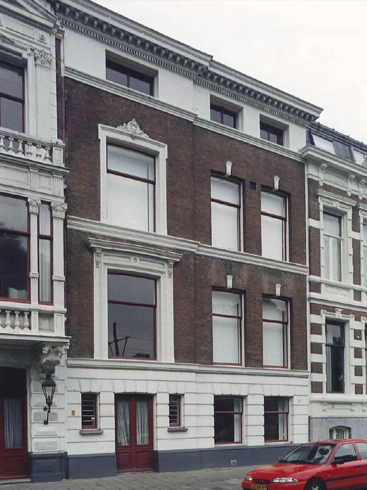 Pand met eenvoudige lijstgevel in eclectische trant, 1881. Begane- grond met geblokte bepleistering. Breedte: drie vensterassen, waarvan de linker als risaliet is uitgevoerd en de ingang bevat. Onder de kroonlijst liggende vensters.