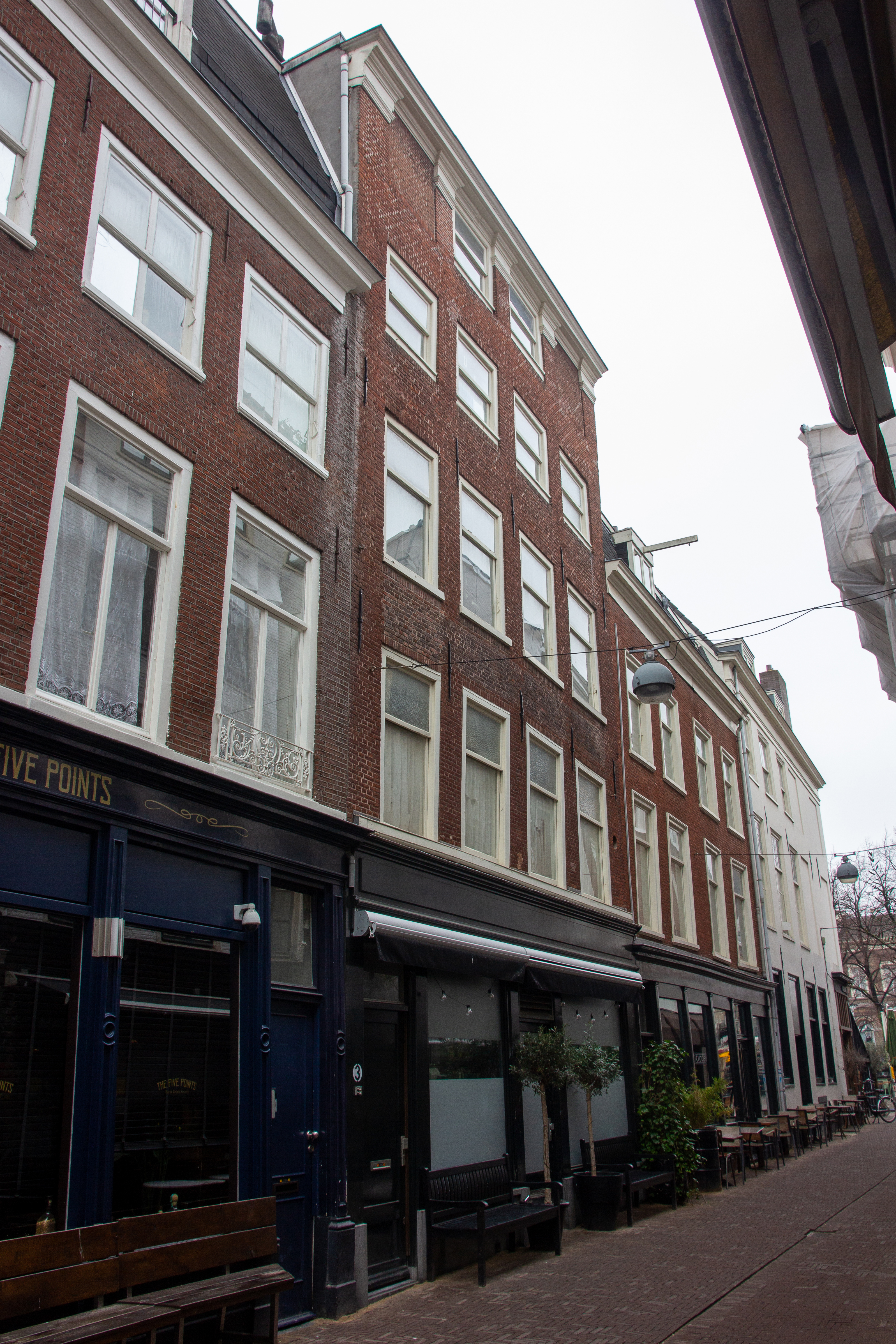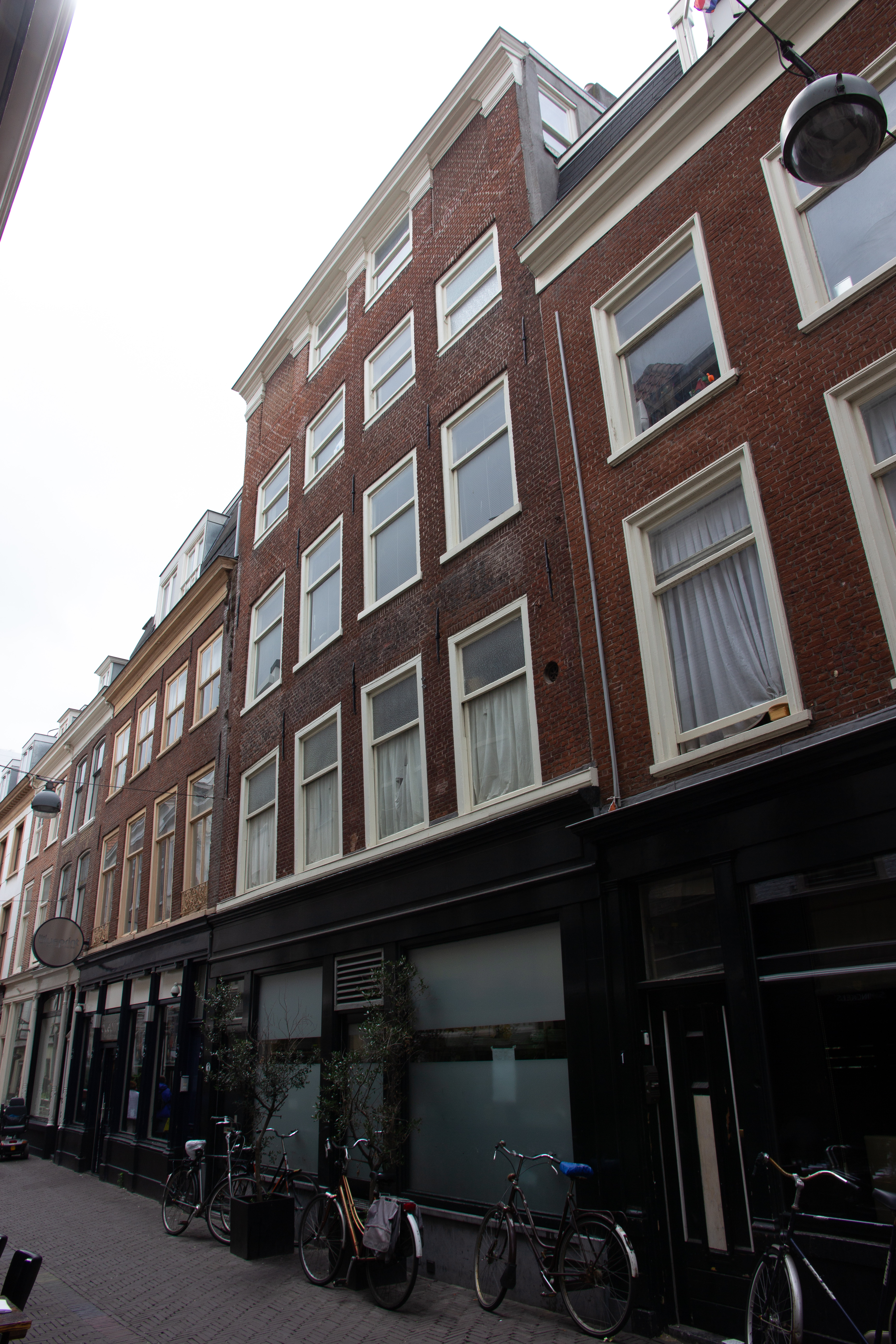 Achttiende-eeuws pand bestaande uit een dwarshuis met een voorgevel aan de Korte Houtstraat. Het opvallend hoge en ondiepe pand telt vijf bouwlagen onder een plat dak.