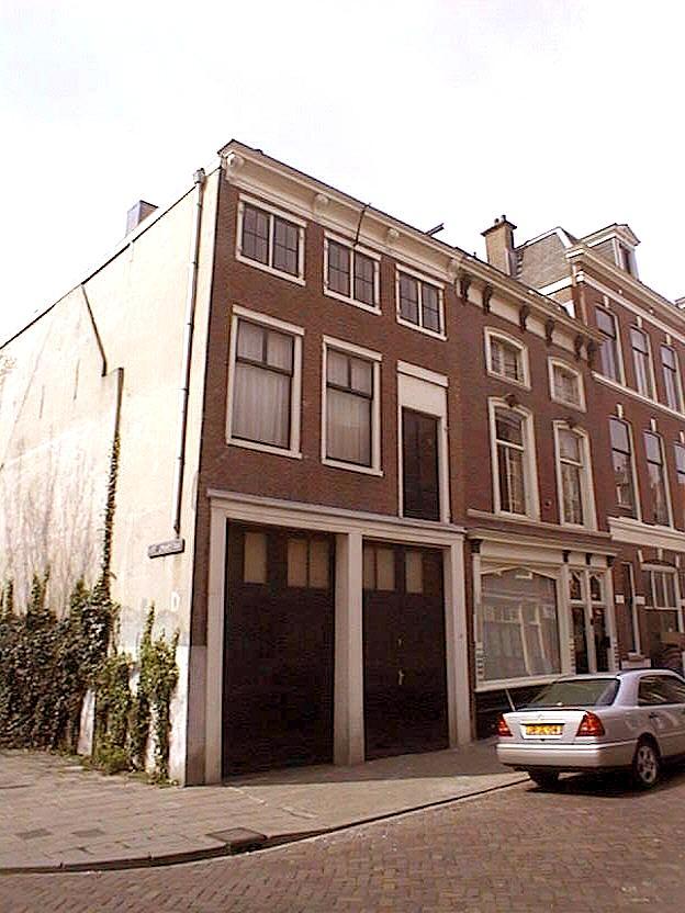 Achttiende eeuws pakhuis met drie-assige lijstgevel, bestaande uit parterre, eerste verdieping en kapverdieping. Hoekpand met gepleisterde zijgevel. In de voorgevel dubbele inrijpoort en vensters onder rollagen met houten dorpels; de vensters op de zolderverdieping hebben dubbele vierruitsdraairamen en duimen in de kozijnen. Vier Lodewijk XIV-consoles onder de rechte kroonlijst; schilddak.