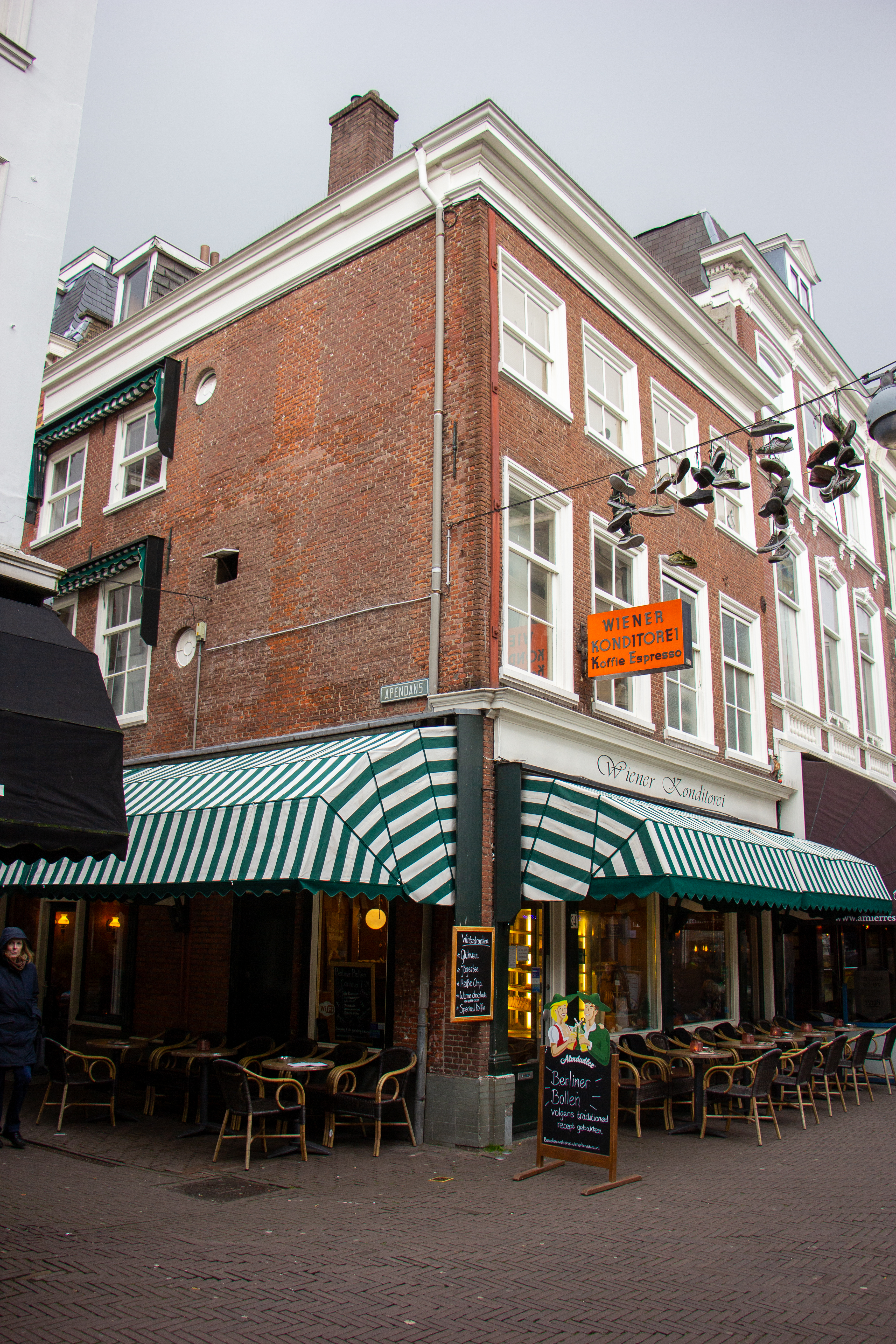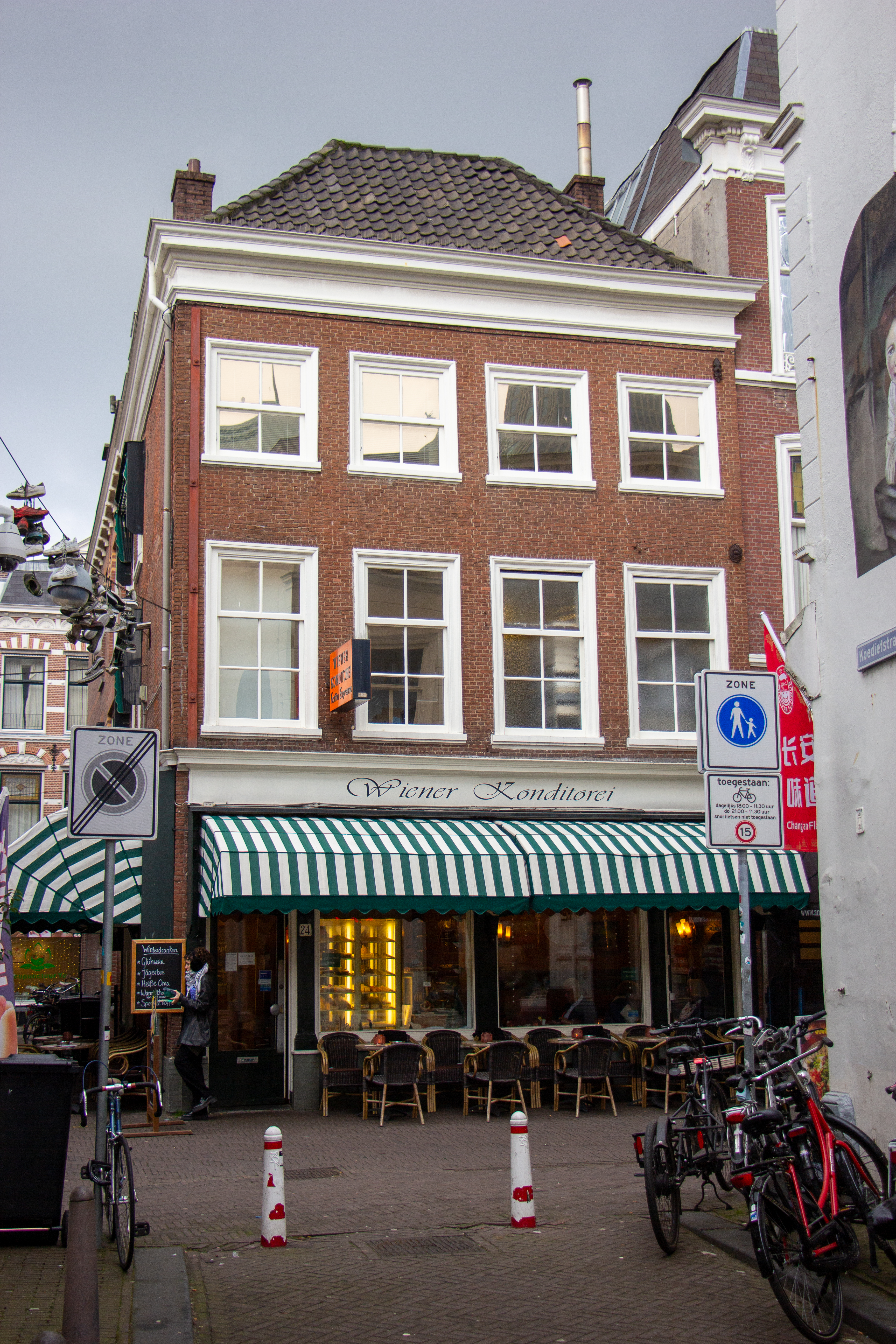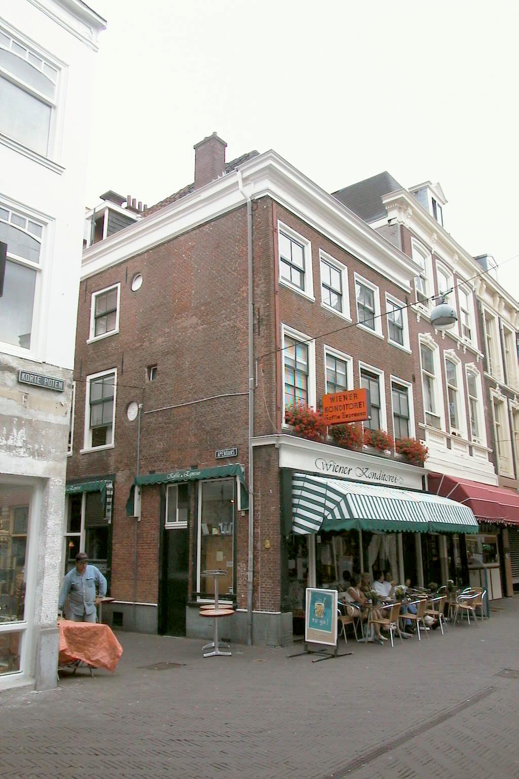 18de-eeuws pand op de hoek van de Apendans. Het huis heeft een eenvoudige lijstgevel, telt drie bouwlagen met omlopend schilddak en is vier vensterassen breed. 19de-eeuwse houten winkelpui onder hoofdgestel. Vensters met geprofileerde houten omlijstingen en schuiframen met zes- en vierruitsroedenverdeling.