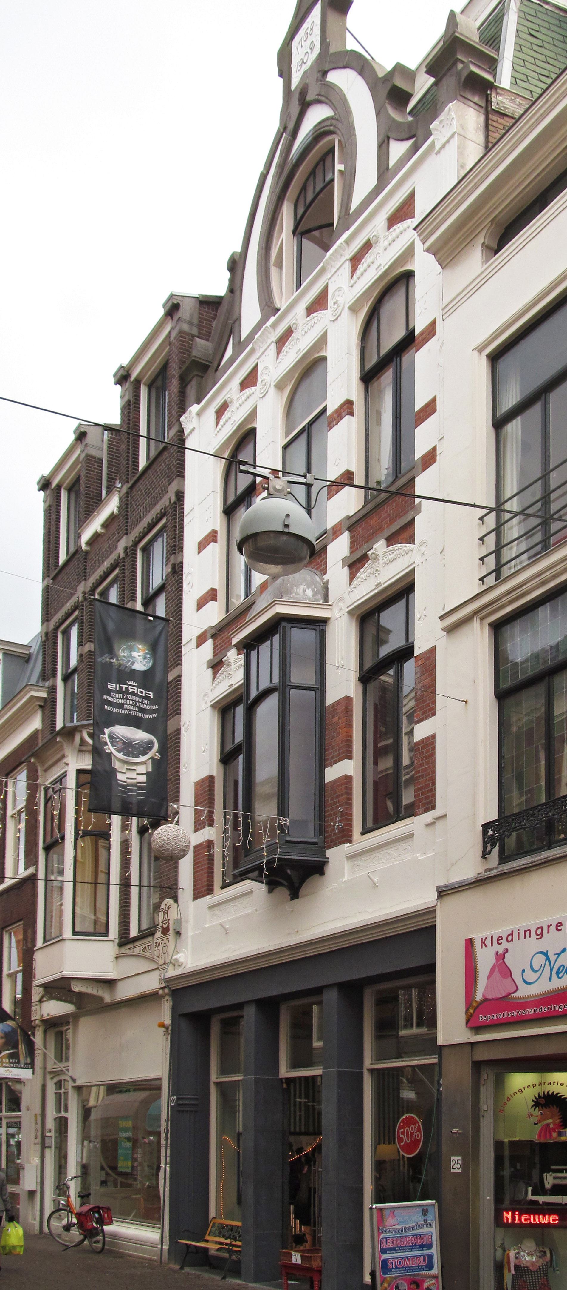 De Korte Poten is als sinds de zestiende eeuw een straat waar bedrijvigheid en handel waren geconcentreerd. Rond 1850 doet het winkelconcept zoals wij dat nu kennen haar intrede en worden veel woonhuis- en bedrijfspuien in de bestaande bebouwing vervangen door winkelpuien. De voortschrijdende cityvorming van de binnenstad en daarmee het alsmaar belangrijker worden van de winkelfunctie voor de Korte Poten zorgt ervoor dat vanaf 1875 veel van de oude panden wordt gesloopt of zodanig verbouwd dat er sprake is van een ware metamorfose. Het pand Korte Poten 27 is hiervan een goede representant. De bakstenen voorgevel is voornamelijk ontworpen in neo-renaissance met gepleisterde banden waarin versieringen zijn verwerkt en eveneens rijk gedecoreerd pleisterwerk boven de ramen. Bijzonder is de combinatie van deze neo-renaissance architectuur met ornamenten in de stijl van de art nouveau die is te zien in de hardstenen ronde belijningen van de top. Hierin is ook een jaartalsteen opgenomen. De winkelpui is in de loop der decennia meerdere malen gewijzigd.
