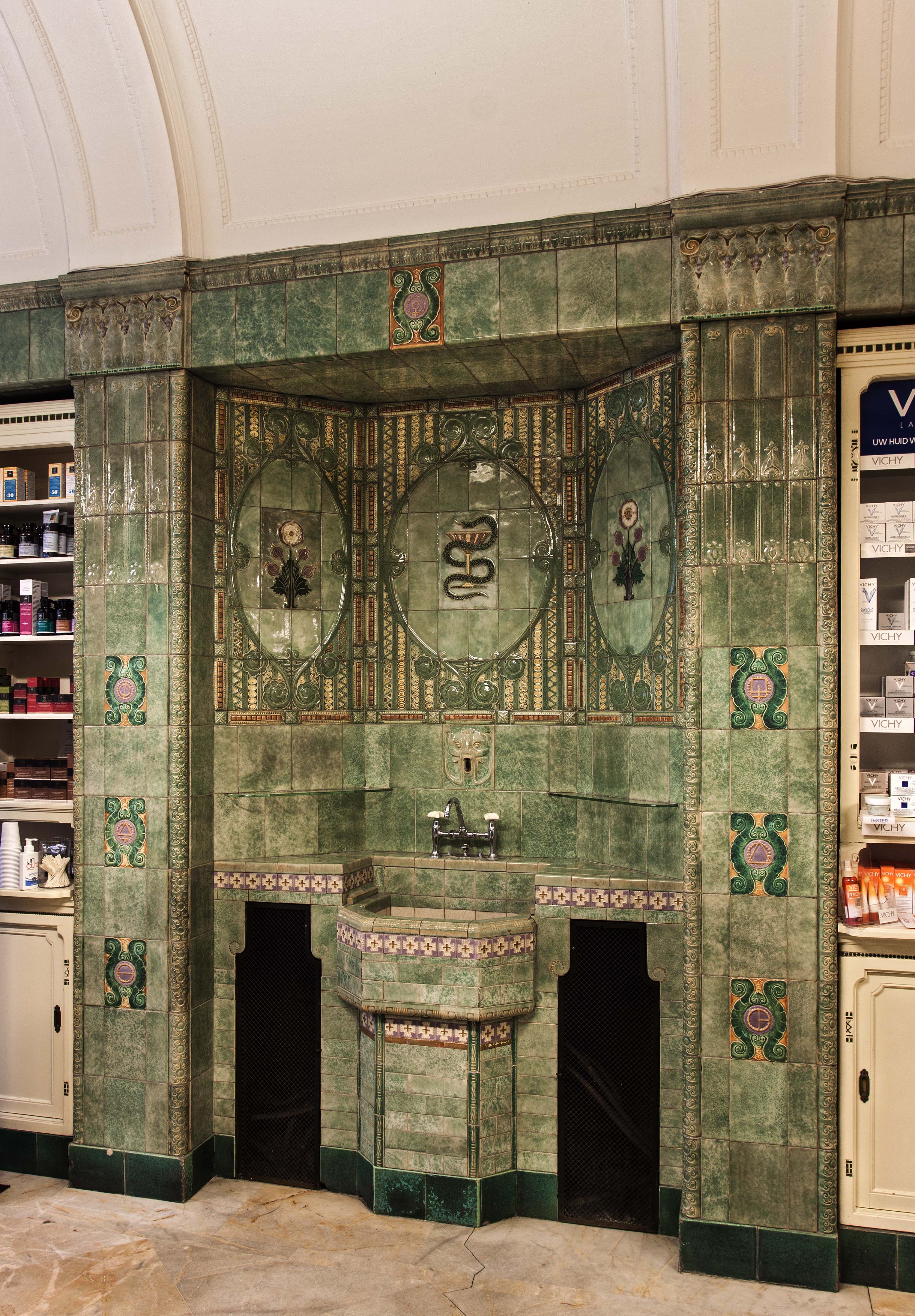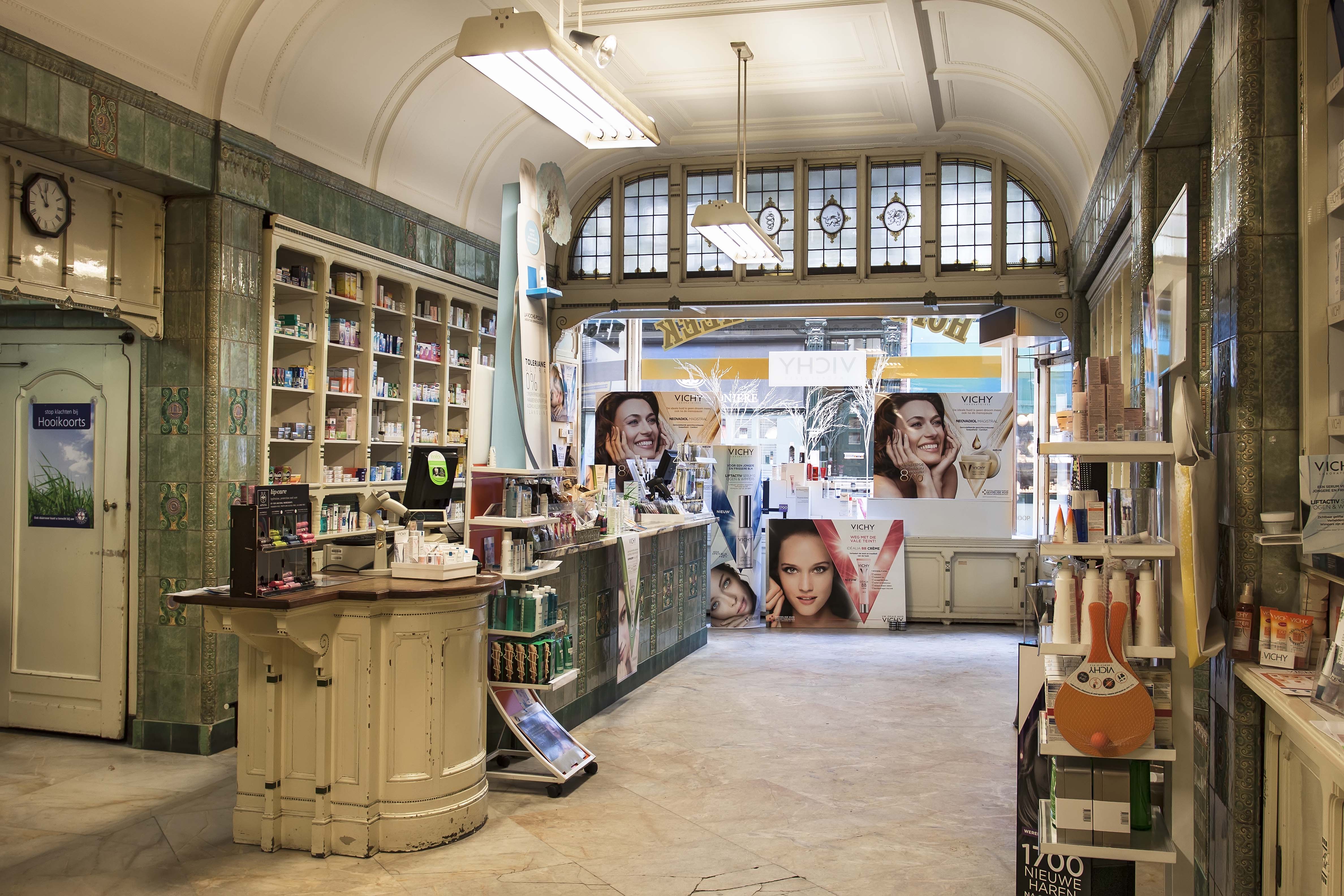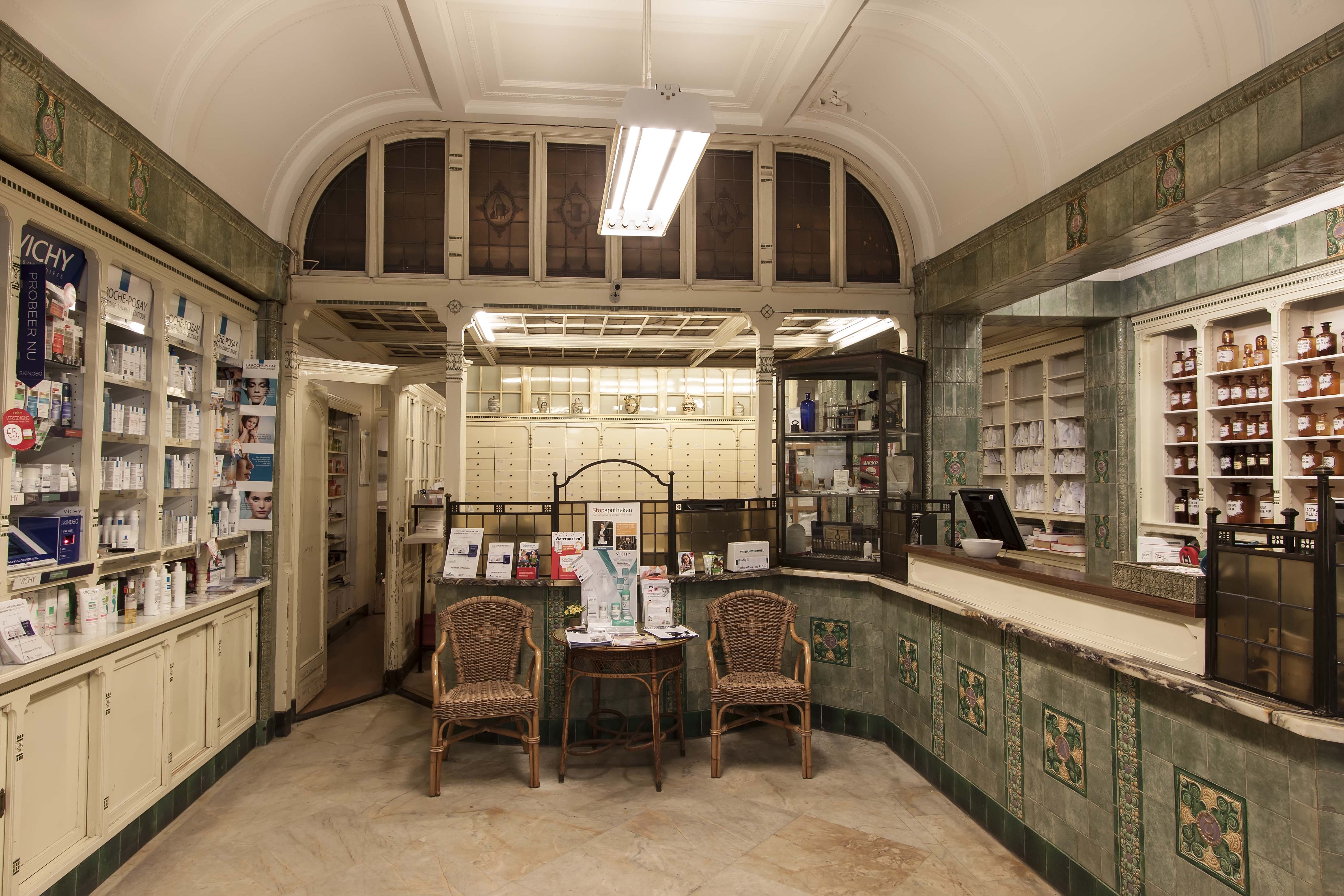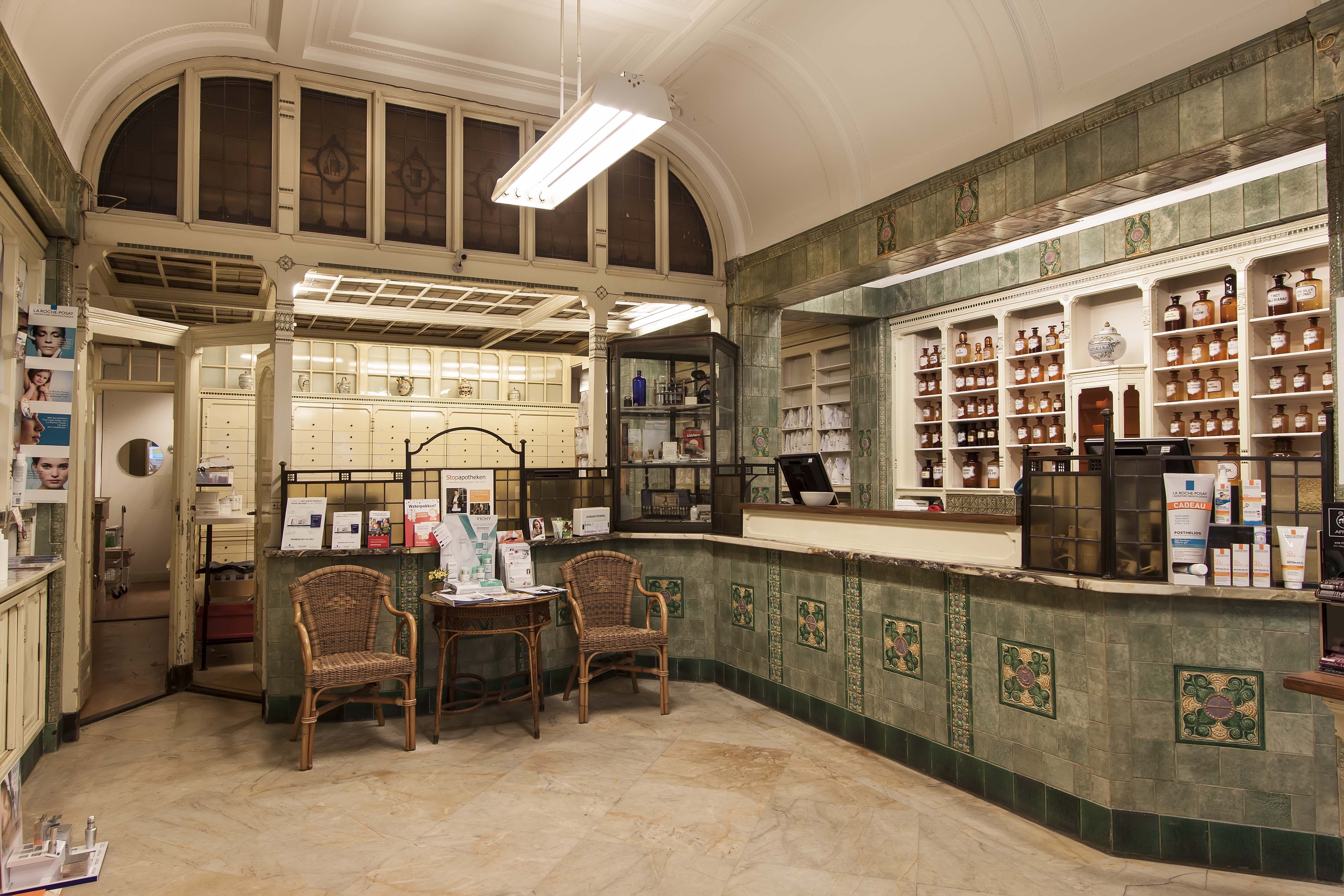 De Korte Poten is als sinds de zestiende eeuw een straat waar bedrijvigheid en handel waren geconcentreerd. Rond 1850 doet het winkelconcept zoals wij dat nu kennen haar intrede en worden veel woonhuis- en bedrijfspuien in de bestaande bebouwing vervangen door winkelpuien. De voortschrijdende cityvorming van de binnenstad en daarmee het alsmaar belangrijker worden van de winkelfunctie voor de Korte Poten zorgt ervoor dat vanaf 1875 veel van de oude panden wordt gesloopt of zodanig verbouwd dat er sprake is van een ware metamorfose. Het pand Korte Poten 7 t/m 7c is hiervan een goede representant. De architecten A.P. van Dam en J.C. van Dorsser die dit brede, in sobere neo-renaissance stijl uitgevoerde winkel-woonhuis ontwierpen, waren in dezelfde tijd bezig met het monumentale warenhuis Grand Bazar de la Paix in de Spuistraat. Veel aandacht is bij Korte Poten 7 t/m 7c besteed aan de detaillering van de winkelzone. De begane grond bevat een gespiegelde winkelpui die uit twee uitgebouwde etalages met een middenportiek bestaat. Rechts is nog een portiek voor de bovenverdieping met een fraai betegelde wand. Bovenlangs loopt een in het zicht gelaten ijzeren puibalk. De etalageramen hebben bovenlichtjes van geslepen glas, die aan de onderzijde door een sierlijk gebogen roede zijn begrensd. Goed bewaard gebleven is het winkelinterieur van de apotheek dat zich in het rechterdeel bevindt (Korte Poten 7a); het is het resultaat van een verbouwing uit 1913 naar ontwerp van Joh. Mutters jr . Architect Mutters bekleedde de wanden en de toonbanken met zachtgroen geglazuurde tegels waar farmaceutische, religieuze en astrologische symbolen op zijn aangebracht. Bijzonder is de esculaap, geflankeerd door papavers, boven het fonteintje in de nis. Onder de esculaap is een klein maskerkopje, een spuwertje, waar de oorspronkelijke kraan zich bevond. Deze was destijds aangesloten op een eigen bron. De medicijnkasten zijn in de tegelwand opgenomen. Boven de ruimte welft een eenvoudig gedecoreerd stuukplafond. Oorspronkelijk had de apotheek een mozaïekvloer, maar deze is door marmer vervangen. Opvallende interieurdetails zijn verder de open etalagekast kast met een glas-in-lood bovenlicht en de scheidingswand tussen de winkel en de apotheekruimte met gesneden houten staanders achterin. Glas-in-lood bevat ook het plafond van de apotheekruimte. Het tegelwerk werd uitgevoerd door firma A.N. de Lint Industrie- en Handel Maatschappij. De tegels betrok zij van de Porceleyne Fles in Delft. Van deze fabriek had De Lint sinds 1898 het exclusieve recht van de verkoop van hun producten.