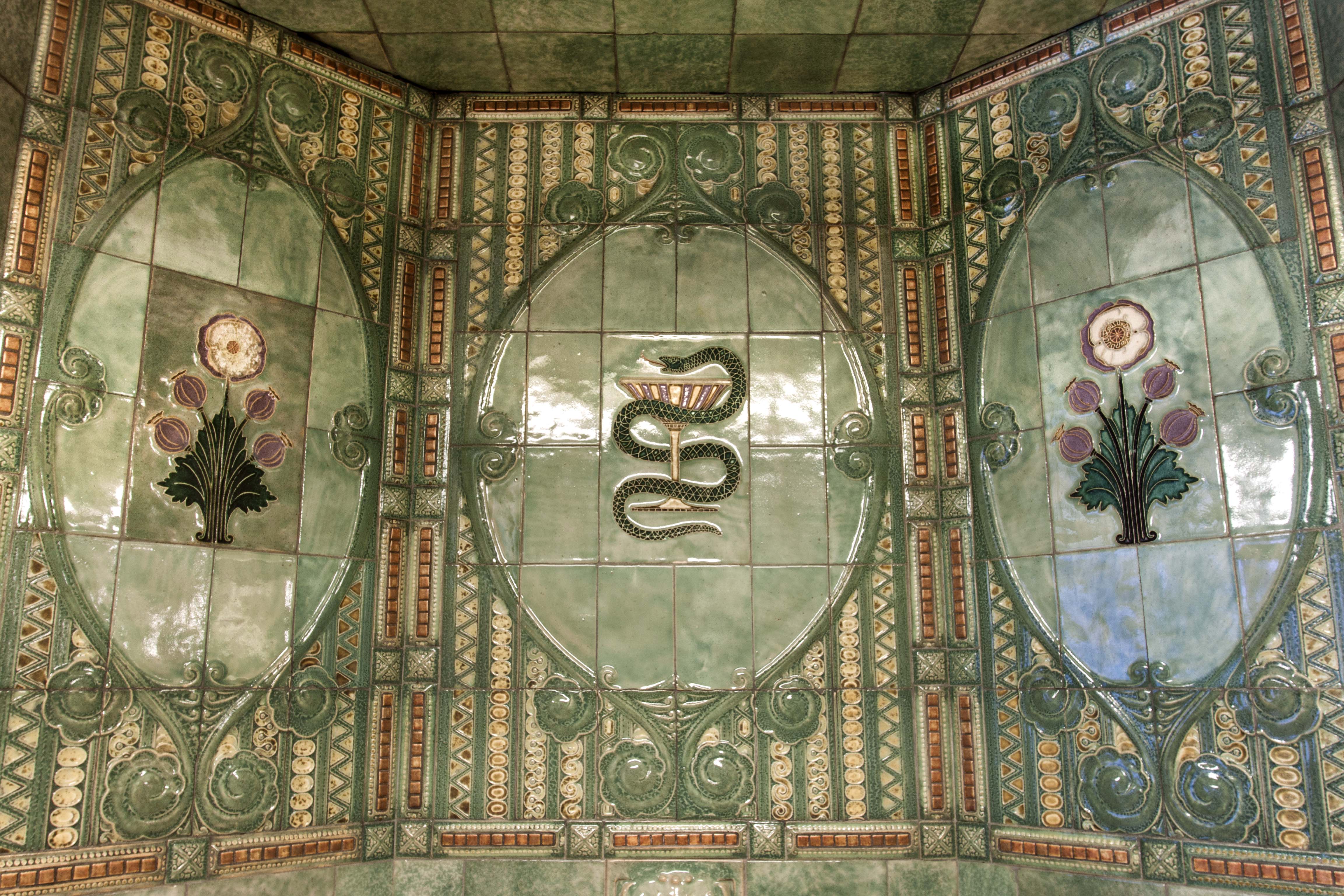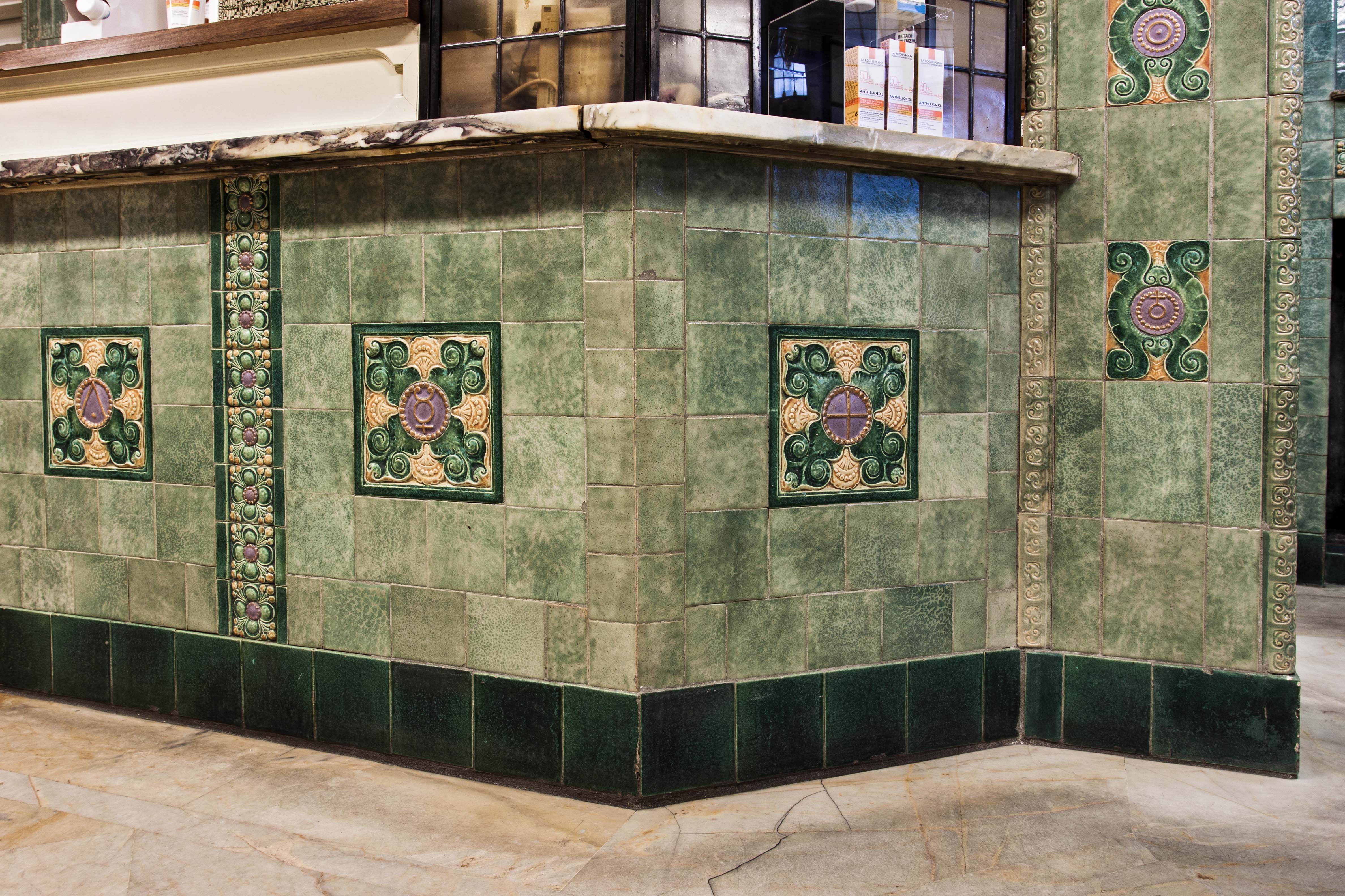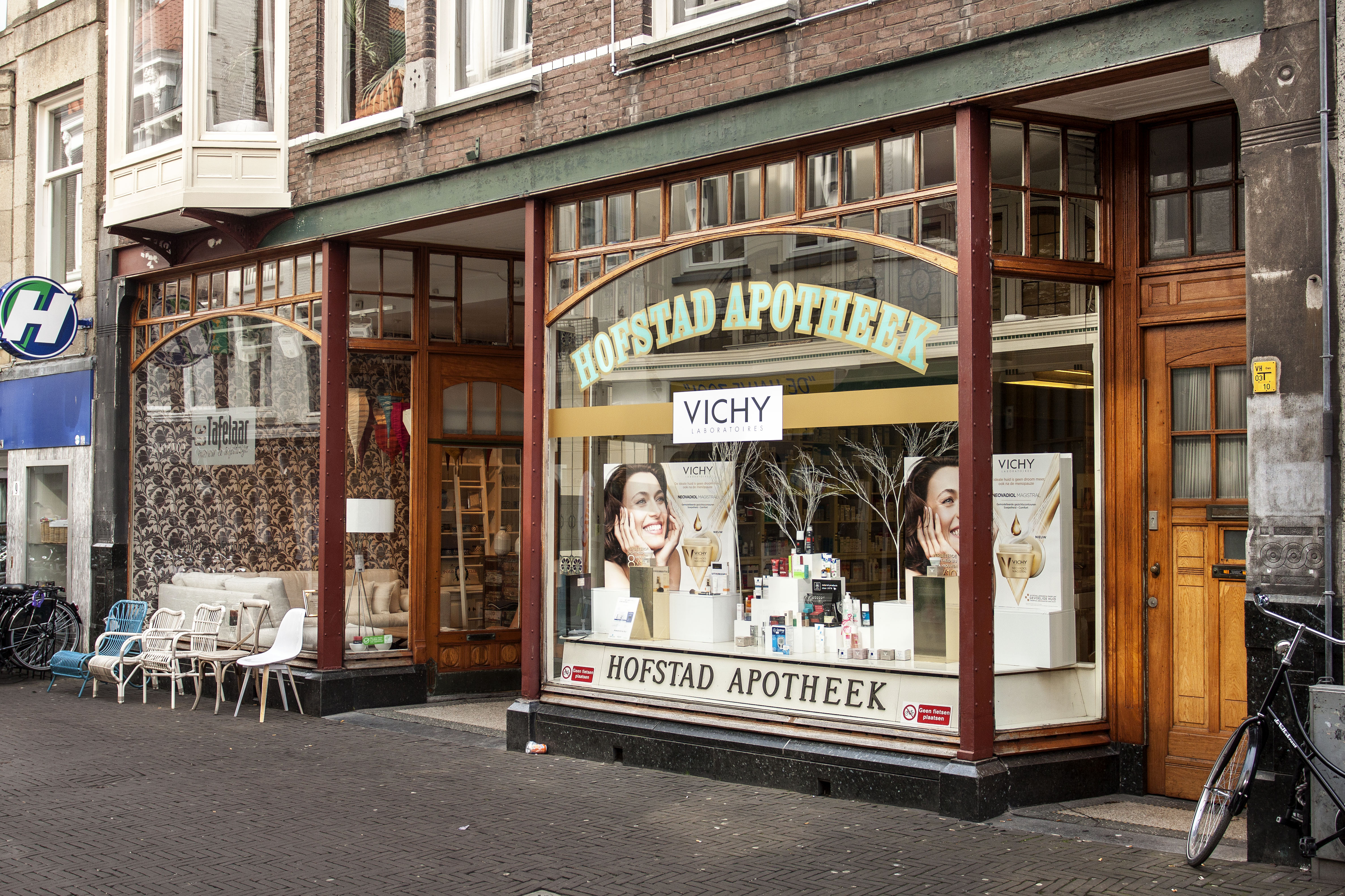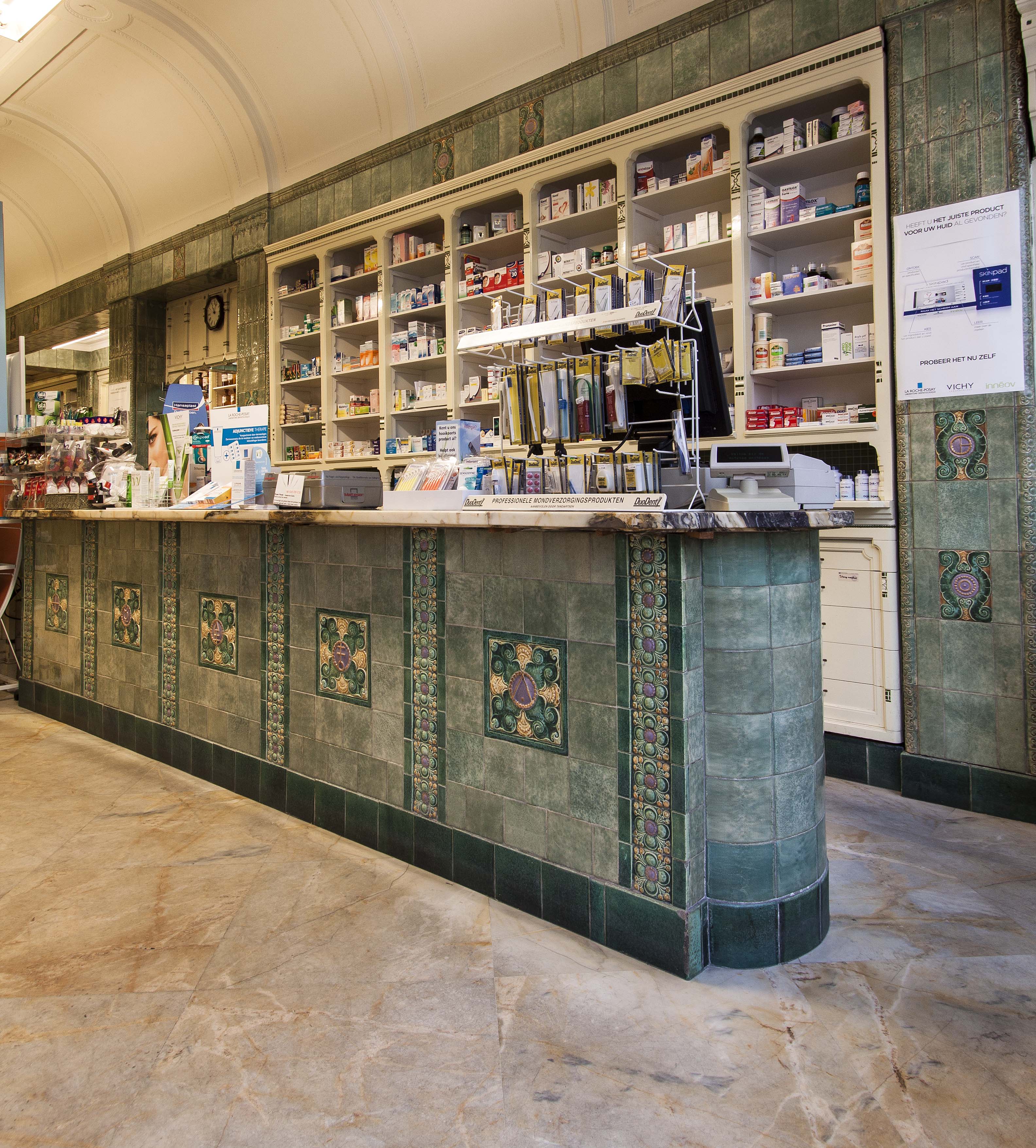 De Korte Poten is als sinds de zestiende eeuw een straat waar bedrijvigheid en handel waren geconcentreerd. Rond 1850 doet het winkelconcept zoals wij dat nu kennen haar intrede en worden veel woonhuis- en bedrijfspuien in de bestaande bebouwing vervangen door winkelpuien. De voortschrijdende cityvorming van de binnenstad en daarmee het alsmaar belangrijker worden van de winkelfunctie voor de Korte Poten zorgt ervoor dat vanaf 1875 veel van de oude panden wordt gesloopt of zodanig verbouwd dat er sprake is van een ware metamorfose. Het pand Korte Poten 7 t/m 7c is hiervan een goede representant. De architecten A.P. van Dam en J.C. van Dorsser die dit brede, in sobere neo-renaissance stijl uitgevoerde winkel-woonhuis ontwierpen, waren in dezelfde tijd bezig met het monumentale warenhuis Grand Bazar de la Paix in de Spuistraat. Veel aandacht is bij Korte Poten 7 t/m 7c besteed aan de detaillering van de winkelzone. De begane grond bevat een gespiegelde winkelpui die uit twee uitgebouwde etalages met een middenportiek bestaat. Rechts is nog een portiek voor de bovenverdieping met een fraai betegelde wand. Bovenlangs loopt een in het zicht gelaten ijzeren puibalk. De etalageramen hebben bovenlichtjes van geslepen glas, die aan de onderzijde door een sierlijk gebogen roede zijn begrensd. Goed bewaard gebleven is het winkelinterieur van de apotheek dat zich in het rechterdeel bevindt (Korte Poten 7a); het is het resultaat van een verbouwing uit 1913 naar ontwerp van Joh. Mutters jr . Architect Mutters bekleedde de wanden en de toonbanken met zachtgroen geglazuurde tegels waar farmaceutische, religieuze en astrologische symbolen op zijn aangebracht. Bijzonder is de esculaap, geflankeerd door papavers, boven het fonteintje in de nis. Onder de esculaap is een klein maskerkopje, een spuwertje, waar de oorspronkelijke kraan zich bevond. Deze was destijds aangesloten op een eigen bron. De medicijnkasten zijn in de tegelwand opgenomen. Boven de ruimte welft een eenvoudig gedecoreerd stuukplafond. Oorspronkelijk had de apotheek een mozaïekvloer, maar deze is door marmer vervangen. Opvallende interieurdetails zijn verder de open etalagekast kast met een glas-in-lood bovenlicht en de scheidingswand tussen de winkel en de apotheekruimte met gesneden houten staanders achterin. Glas-in-lood bevat ook het plafond van de apotheekruimte. Het tegelwerk werd uitgevoerd door firma A.N. de Lint Industrie- en Handel Maatschappij. De tegels betrok zij van de Porceleyne Fles in Delft. Van deze fabriek had De Lint sinds 1898 het exclusieve recht van de verkoop van hun producten.