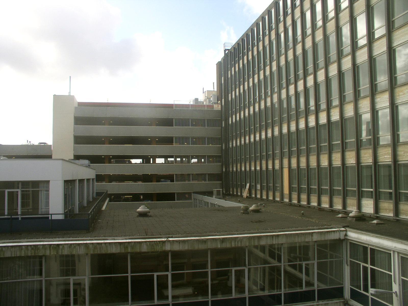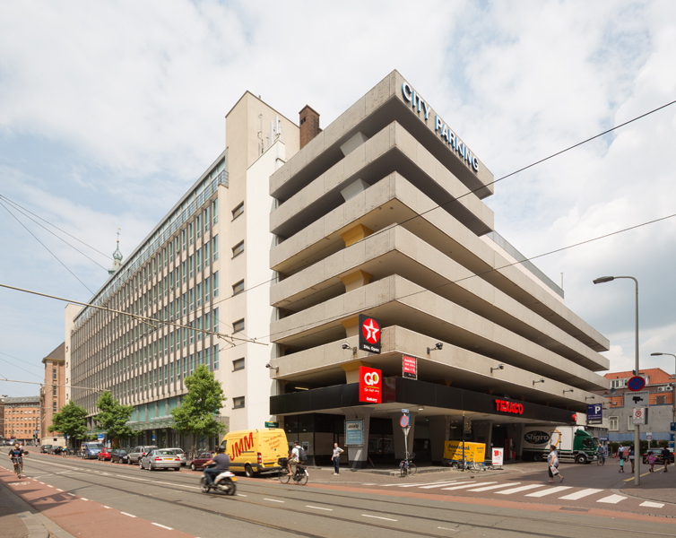 Parkeergarage in utilitaire, modernistische stijl gebouwd tussen 1961-1965 naar ontwerp van het architectenbureau van J.A. Lucas en H.E. Niemeijer.