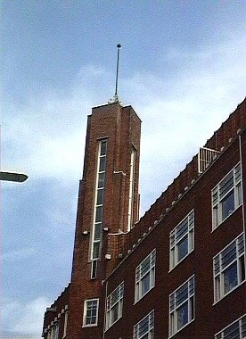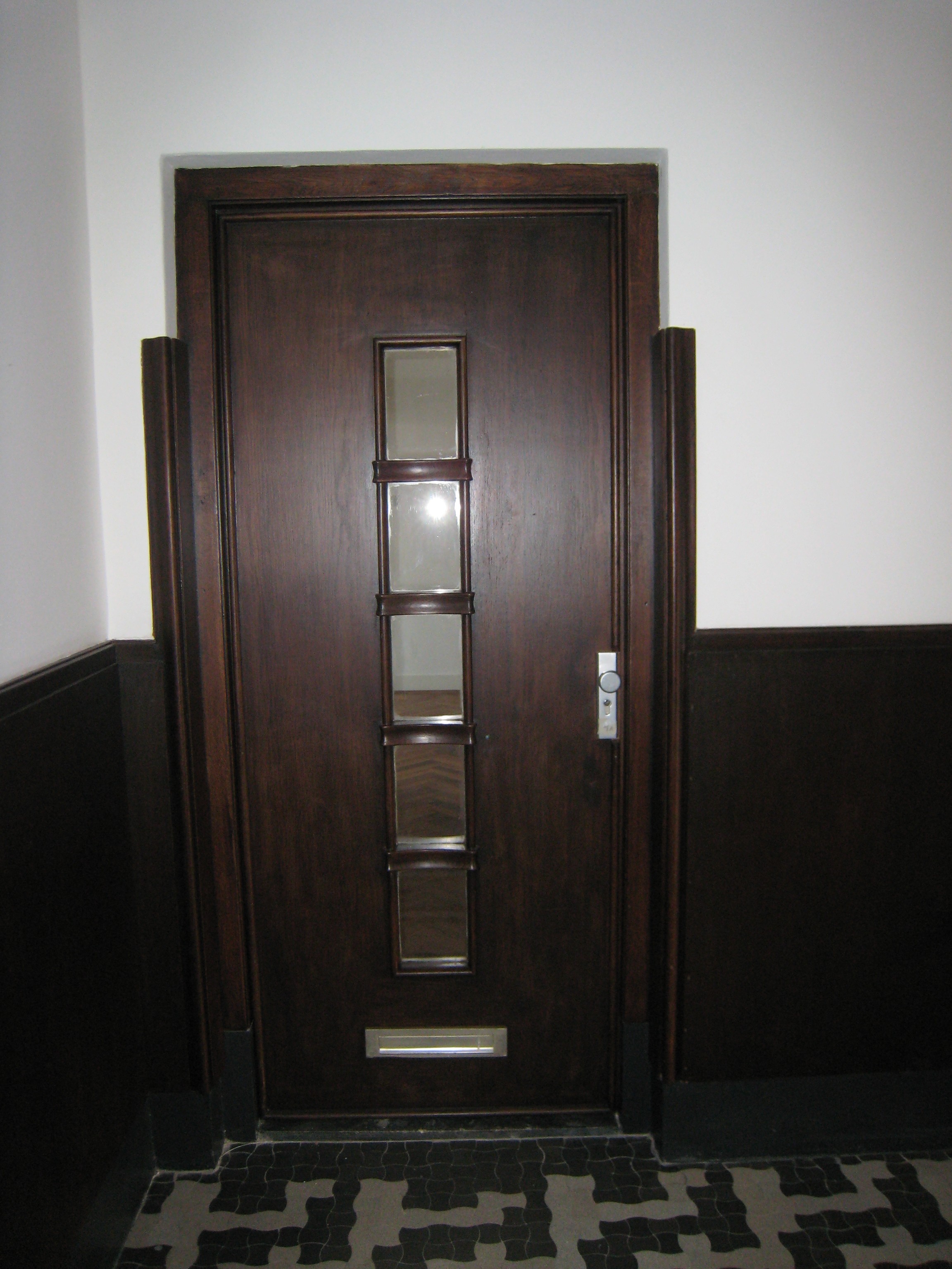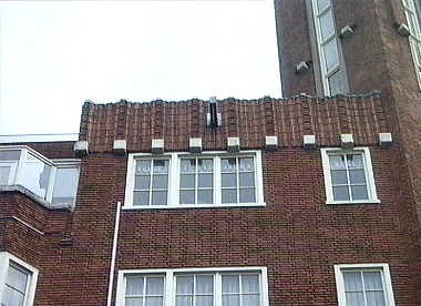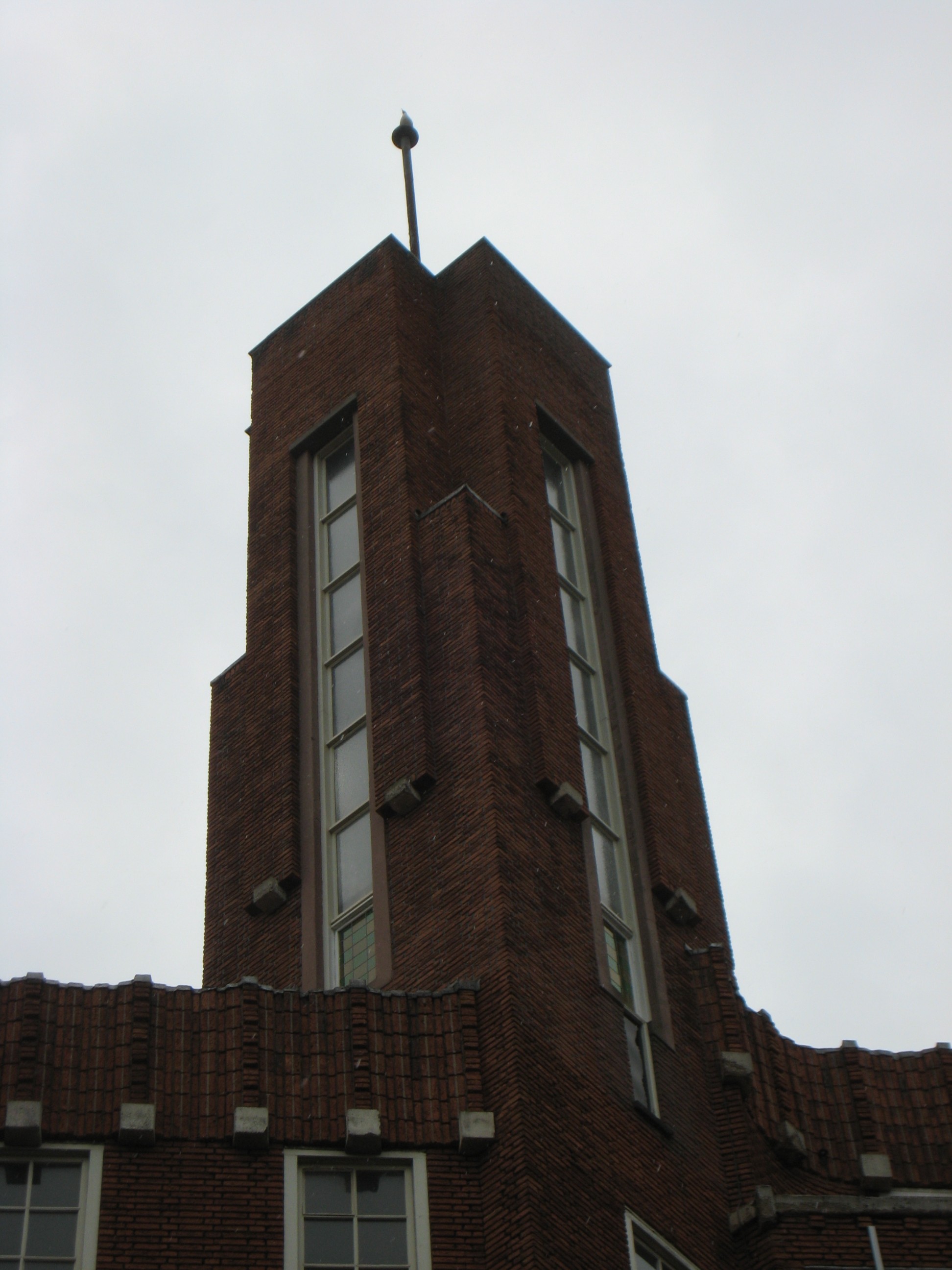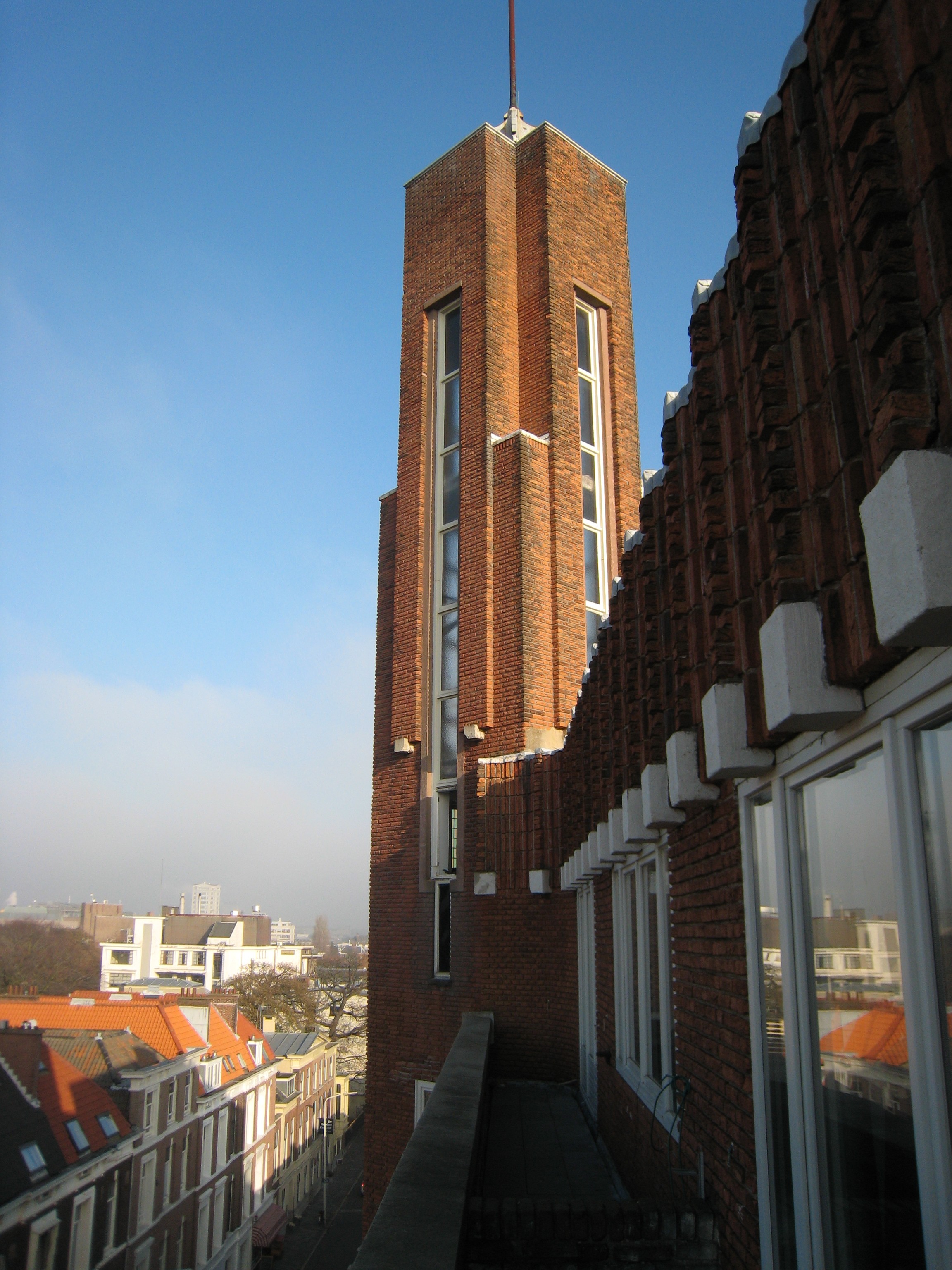 In de derde as van links is de hoofdingang in een opvallende paraboolvormige omlijsting van tufsteen met voegen. In de pennant is hier de naam van de architect aangebracht. De ingangstravee wordt geaccentueerd door een overhoeks geplaatste toren met siermetselwerk en verticale vensterstroken; hierin was oorspronkelijk een waterreservoir ondergebracht. In 1953 zijn de metalen ramen van de toren vervangen door houten kozijnen. In de tweede as van rechts is een erkerachtige uitbouw over vijf bouwlagen. De vijfde bouwlaag links van de toren is later toegevoegd.