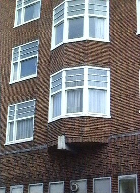 Siermetselwerk is zichtbaar waar de gevel eindigt en ter hoogte van de tussenverdieping. De meeste vensters zijn brede houten drielichtvensters met verticale roedeverdeling in de bovenlichten.