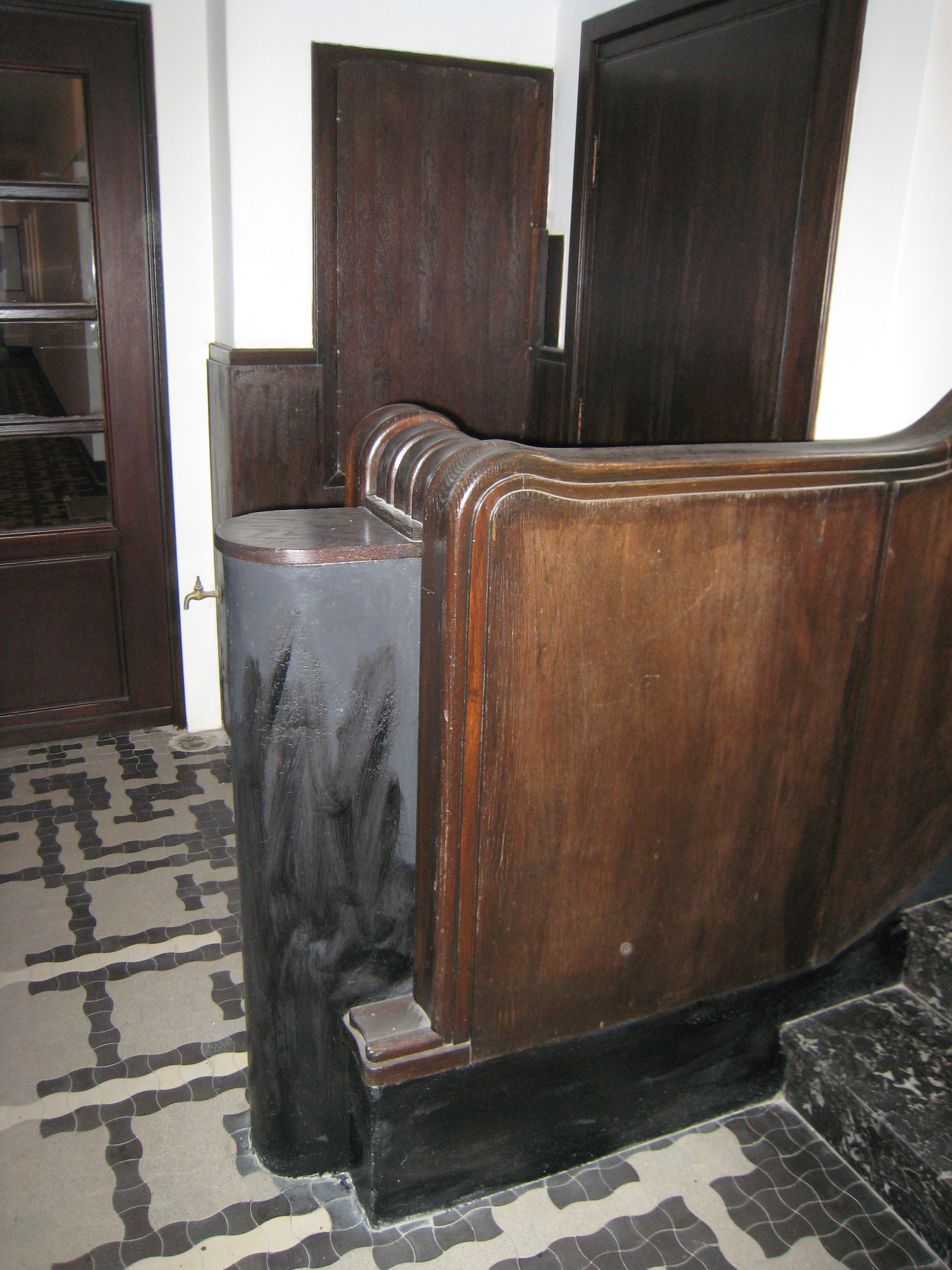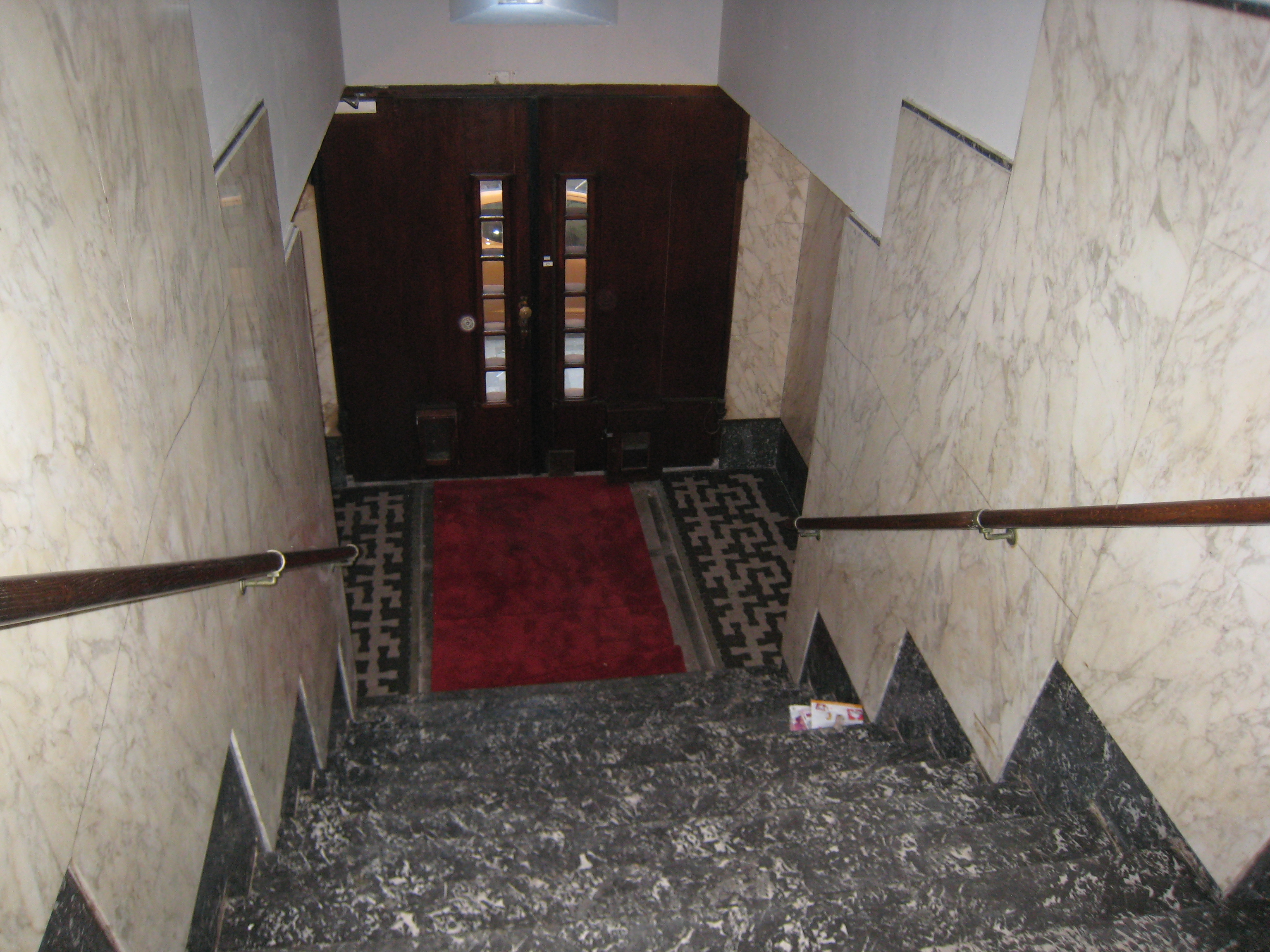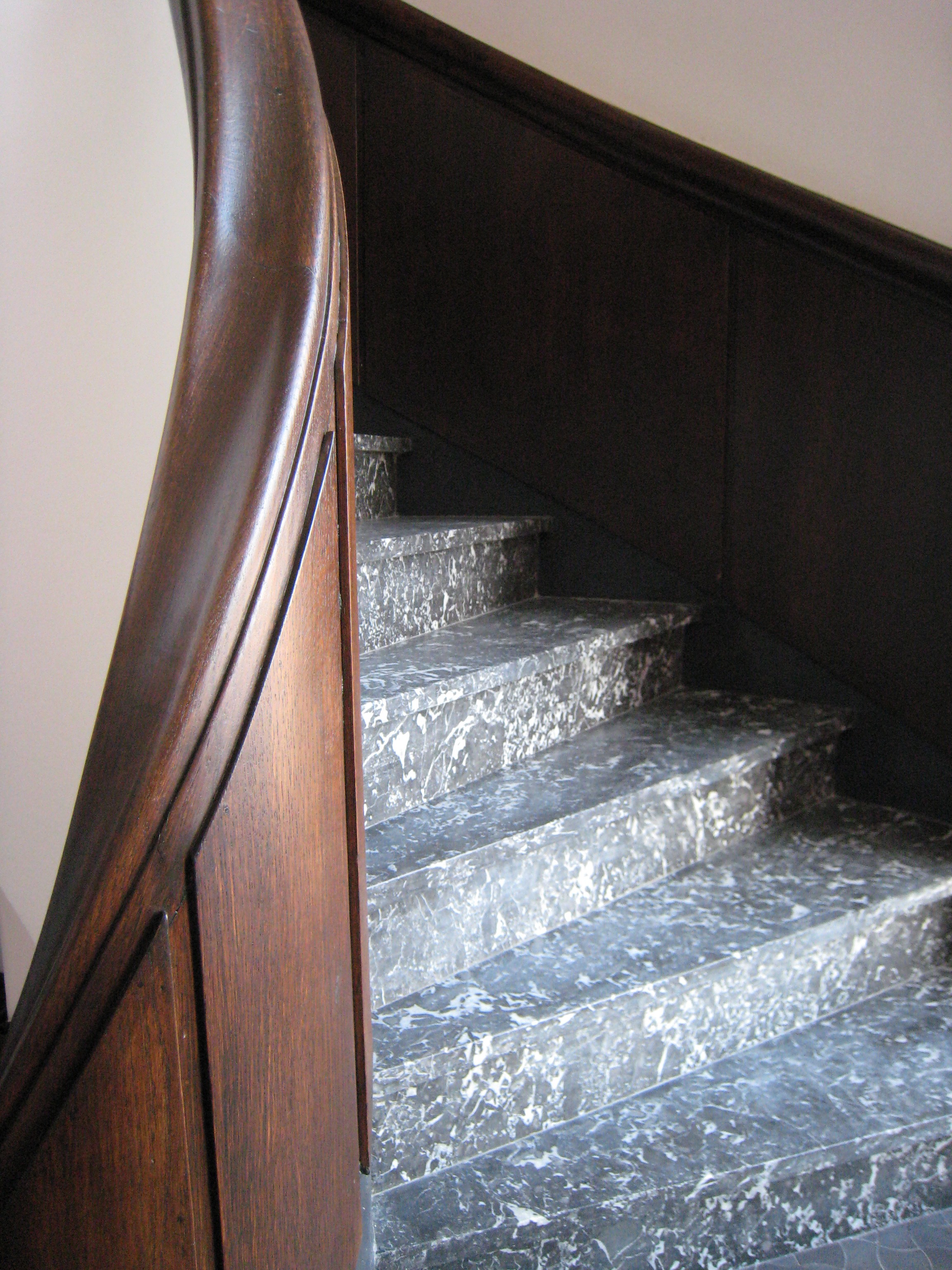 Van het interieur zijn de hal, de gangen en de twee trappehuizen in de oorspronkelijke staat bewaard gebleven. Beide trappenhuizen zijn van eikehouten lambriseringen en marmeren trappen en tegelvloeren voorzien. De drie meter brede verbindingsgang die beide trappenhuizen verbindt, is op de entresol 2,5 meter boven de straat gelegen.