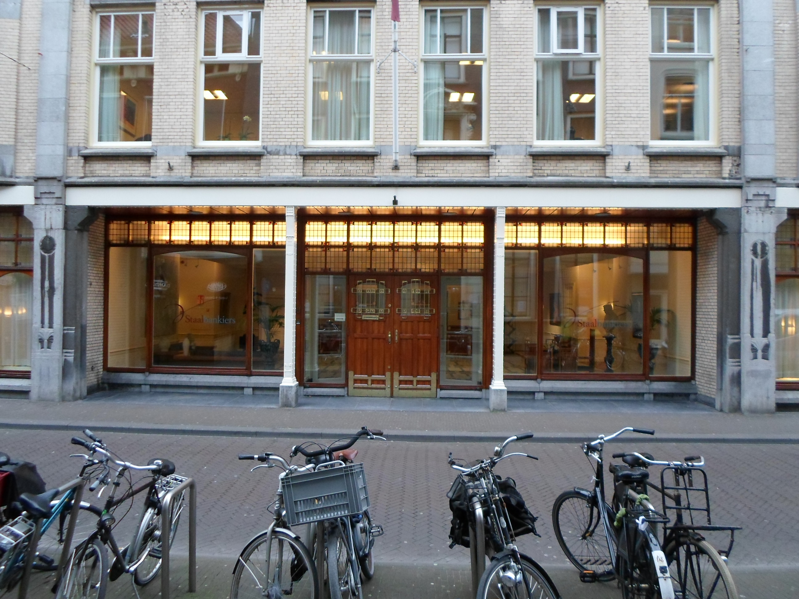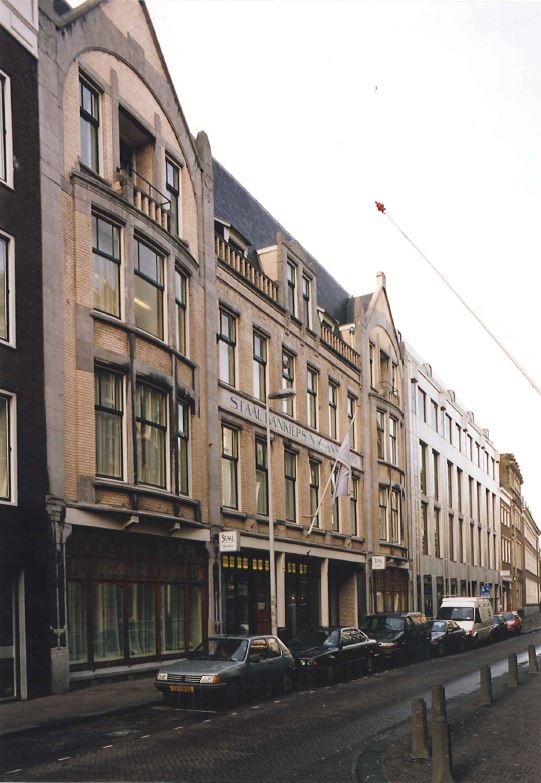 De twaalf vensterassen brede voorgevel is bekleed met witte verblendsteen en heeft hardstenen sieronderdelen. De hoekpartijen met gebogen erkers over de 1e en 2e verdieping en loggia op de 3e verdieping zijn als risaliet opgevat en worden afgesloten door een puntgevel. De risalieten hebben hardstenen penanten die worden beëindigd met een sierbekroning. In de risalieten op de begane grond in hout uitgevoerde etalagepuien met glas-in-lood bovenlichten. In het midden op de begane grond een teruggelegen houten gevelpui met centraal de entree, geflankeerd door etalages. De ingang heeft twee houten deuren met koperbeslag en siertralies in Weense Sezessionstijl. De bovenlichten van de gevelpui zijn voorzien van glas-in-lood. Voor de houten gevelpui een ijzeren skeletconstructie van twee geklinknagelde pijlers op hardstenen poeren en puibalk. Tussen de beide verdiepingen een tegelfries met het opschrift 'Staal Bankiers N.V. Anno 1916'. De houten schuifvensters bezitten hardstenen bovenlateien en onderdorpels.