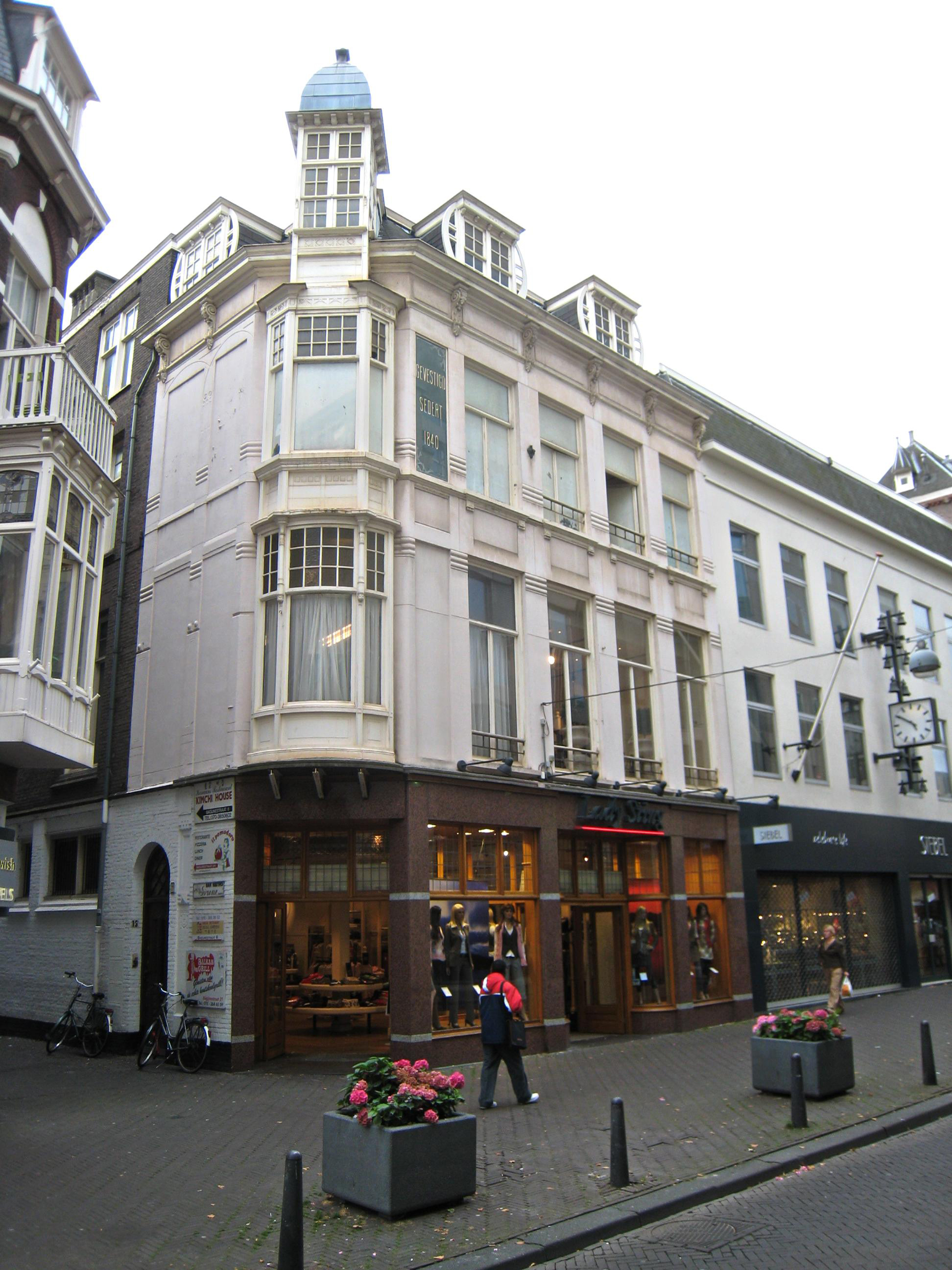 Pand op de hoek van de Lange Poten en de Bagijnestraat van drie bouwlagen onder een kap. Het huidige uiterlijk dateert uit 1905 toen het ingrijpend is verbouwd naar ontwerp van L.A.H. de Wolf ten behoeve van winkels, kantoren en bovenwoningen. Het gevelontwerp uit 1905 is uitgevoerd in Art Nouveau.