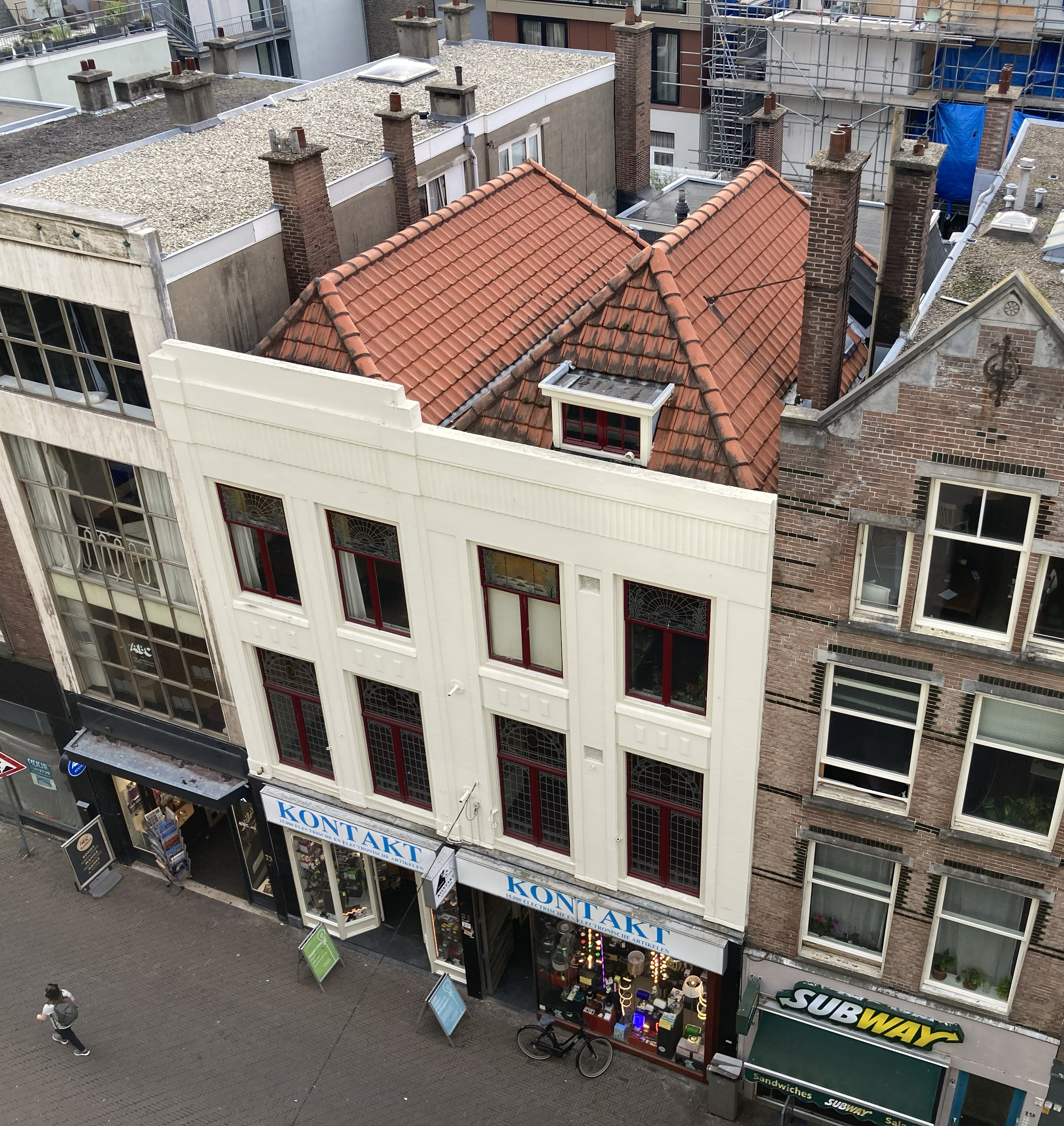 De Lange Poten is al sinds de zestiende eeuw een straat waar bedrijvigheid en handel waren geconcentreerd. Rond 1850 doet het winkelconcept zoals wij dat nu kennen haar intrede en worden veel woonhuis- en bedrijfspuien in de bestaande bebouwing vervangen door winkelpuien. De voortschrijdende cityvorming van de binnenstad en daarmee het alsmaar belangrijker worden van de winkelfunctie voor de Lange Poten zorgt ervoor dat vanaf 1875 een groot aantal van de oude panden wordt vervangen. De nieuwe winkel-woonpanden panden zijn vaak breder en laten de rijke schakering zien van de snel opvolgende architectuurstijlen vanaf 1875 tot aan het Interbellum. Lange Poten 21 is een goede representant van de nog bewaard gebleven oudere bebouwing van voor 1875 die niet is afgebroken maar werd voorzien van een nieuwe voorgevel. Vanaf de late negentiende eeuw is het pand in verschillende fases verbouwd naar een winkelpand met bovenwoning, waardoor het pand een grote gelaagdheid bezit. Het voorhuis van Lange Poten 21 bestaat oorspronkelijk uit twee smalle panden die kort na 1807 zijn samengevoegd. Ondanks de samenvoeging bezitten beide bouwdelen nog een eigen schilddak. De exacte ouderdom van het pand is niet bekend maar het pand is van ten minste achttiende-eeuwse oorsprong. Dit blijkt onder meer uit de op vlucht staande voorgevels en de kapconstructie met gestapelde spanten boven het voorhuis. Inwendig is de opzet van twee zelfstandige casco’s nog goed afleesbaar, waarbij het rechterdeel iets breder is. Uit de tijd van de samenvoeging zijn ook interieurdelen bewaard gebleven, zoals de stucplafonds in de voorkamers op de eerste verdieping, meerdere schouwen en de stofschotten op een van de zolders. De huidige gevel uit 1921 is een bekleding van kunstzandsteen. Het ontwerp van architect Jos Duynstee is uitgevoerd in de in die periode populaire art-decostijl. Opvallend zijn de rijk gedetailleerde glas-in-loodramen op de eerste en tweede verdieping, waarvan die op de eerste verdieping een voor het interbellum kenmerkende decoratie hebben. De ramen op de tweede verdieping hebben een Art Nouveau-afwerking die bij een eerdere verbouwing rond 1900 zijn aangebracht. De winkelpuien zijn in loop der decennia meerdere malen vernieuwd. De naoorlogse aanpassingen in het interieur, zoals de afwerking van de badkamers en keukens, hebben de structuur intact gehouden, maar hebben geen verdere toegevoegde waarde. Ook het winkelinterieur op de begane grond is van recente datum.