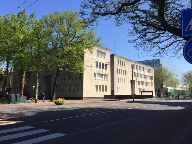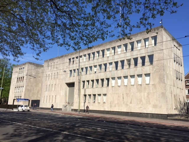 Ambassadegebouw, binnenplaats met muur op de parkeerkelder, auditorium en beveiligingsunit |