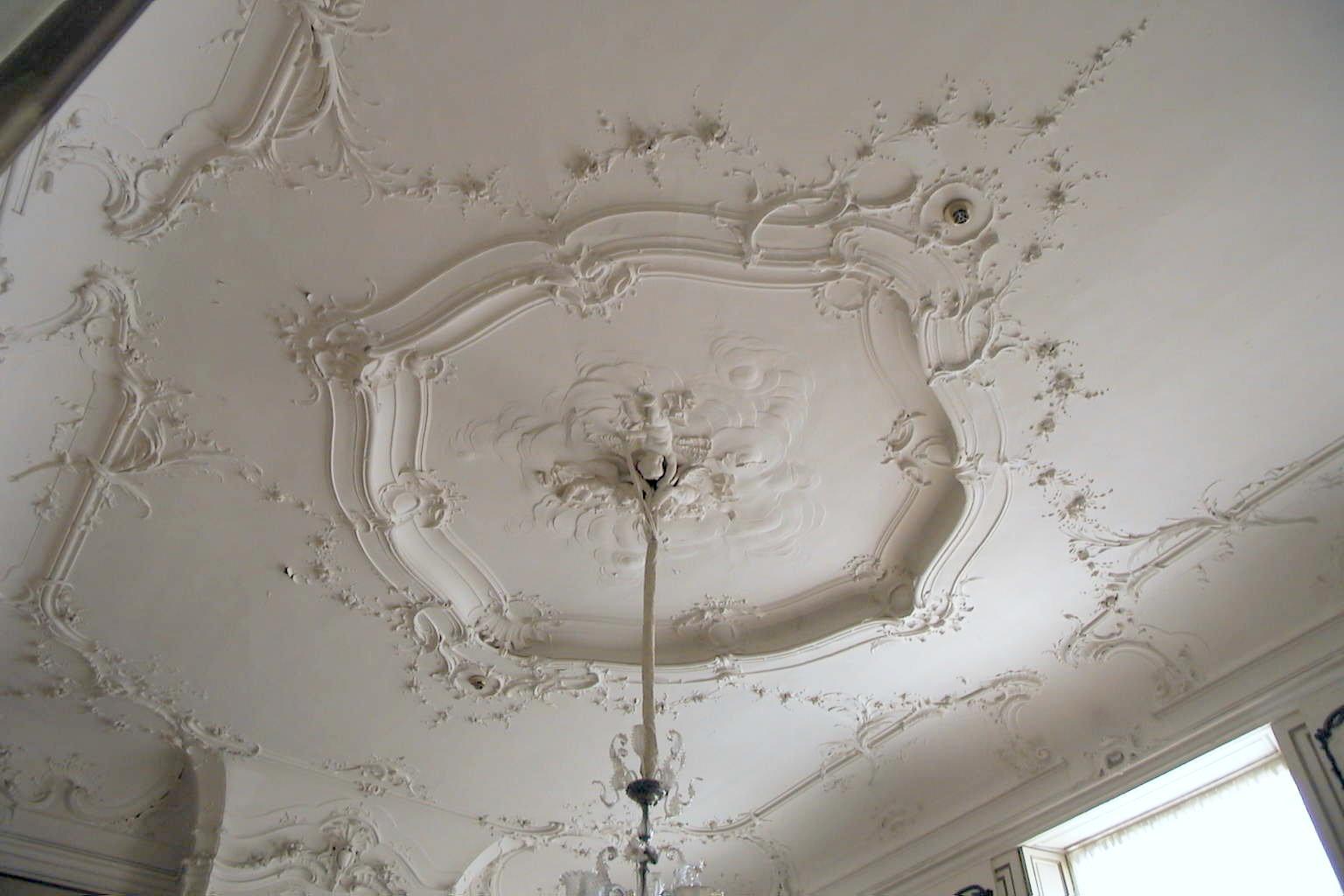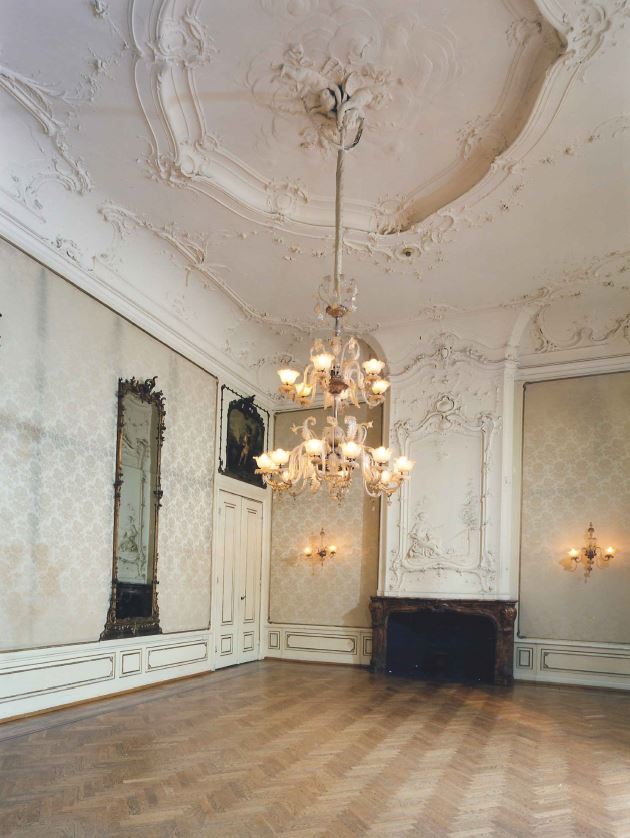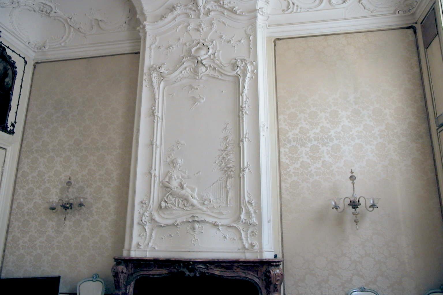 Pand met bakstenen gevel, middenstuk terugliggend, versierde ingangspartij; inwendig stucdecoraties in Lodewijk XIV en rococo-stijl.